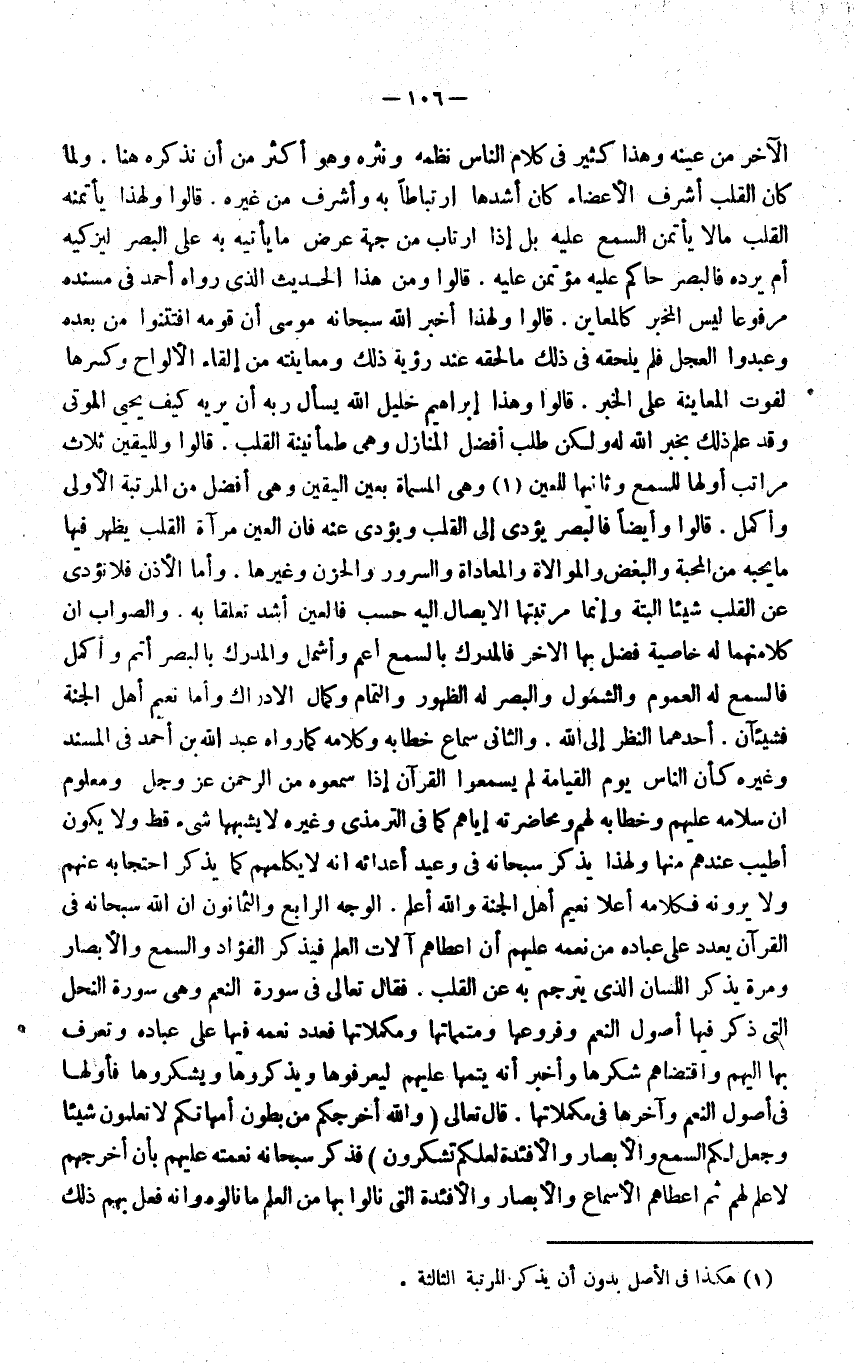 الاخر من عينه وَهَذَا كثير فِي كَلَام النَّاس نظمه ونثره وَهُوَ اكثر من ان نذكرهُ هُنَا وَلما كَانَ الْقلب اشرف الاعضاء كَانَ اشدها ارتباطا بِهِ واشرف من غَيره قَالُوا وَلِهَذَا يأتمنه الْقلب مَالا يأتمن السّمع عَلَيْهِ بل إِذا ارتاب من جِهَة عرض مَا يَأْتِيهِ بِهِ على الْبَصَر ليزكيه ام يردهُ فالبصر حَاكم عَلَيْهِ مؤتمن عَلَيْهِ قَالُوا وَمن هَذَا الحَدِيث الَّذِي رَوَاهُ احْمَد فِي مُسْنده مَرْفُوعا لَيْسَ الْمخبر كالمعاين قَالُوا وَلِهَذَا اخبر الله سُبْحَانَهُ مُوسَى ان قومه افتتنوا من بعده وعبدوا الْعجل فَلم يلْحقهُ فِي ذَلِك مَا لحقه عِنْد رُؤْيَة ذَلِك ومعاينته من القاء الالواح وَكسرهَا لفوت المعاينة على الْخَبَر قَالُوا وَهَذَا إِبْرَاهِيم خَلِيل الله يسْأَل ربه ان يرِيه كَيفَ يحيى الْمَوْتَى وَقد علم ذَلِك بِخَبَر الله لَهُ وَلَكِن طلب افضل الْمنَازل وَهِي طمأنينة الْقلب قَالُوا ولليقين ثَلَاث مَرَاتِب اولها للسمع وَثَانِيها للعين وَهِي الْمُسَمَّاة بِعَين الْيَقِين وَهِي افضل من الْمرتبَة الاولى واكمل قَالُوا وايضا فالبصر يُؤدى الى الْقلب وَيُؤَدِّي عَنهُ فان الْعين مرْآة الْقلب يظْهر فِيهَا مَا يُحِبهُ من الْمحبَّة والبغض والموالاة والمعاداة وَالسُّرُور والحزن وَغَيرهَا وَأما الاذن فَلَا تُؤَدّى عَن الْقلب شَيْئا الْبَتَّةَ وَإِنَّمَا مرتبتها الايصال اليه حسب فالعين اشد تعلقا بِهِ وَالصَّوَاب ان كلا مِنْهُمَا لَهُ خاصية فضل بهَا الاخر فالمدرك بِالسَّمْعِ اعم واشمل والمدرك بالبصر اتم واكمل فالسمع لَهُ الْعُمُوم والشمول وَالْبَصَر لَهُ الظُّهُور والتمام وَكَمَال الادراك واما نعيم اهل الْجنَّة فشيئآن احدهما النّظر الى الله وَالثَّانِي سَماع خطابه وَكَلَامه كَمَا رَوَاهُ عبد الله بن احْمَد فِي الْمسند وَغَيره كَأَن النَّاس يَوْم الْقِيَامَة لم يسمعوا الْقُرْآن اذا سَمِعُوهُ من الرَّحْمَن عز وَجل وَمَعْلُوم ان سَلَامه عَلَيْهِم وخطابه لَهُم ومحاضرته اياهم كَمَا فِي التِّرْمِذِيّ وَغَيره لَا يشبهها شَيْء قطّ وَلَا يكون اطيب عِنْدهم مِنْهَا وَلِهَذَا يذكر سُبْحَانَهُ فِي وَعِيد اعدائه انه لايكلمهم كَمَا يذكر احتجابه عَنْهُم وَلَا يرونه فَكَلَامه اعلا نعيم اهل الْجنَّة وَالله اعْلَم الْوَجْه الرَّابِع وَالثَّمَانُونَ ان الله سُبْحَانَهُ فِي الْقُرْآن يعدد على عباده من نعمه عَلَيْهِم ان اعطاهم آلَات الْعلم فيذكر الْفُؤَاد والسمع والابصار وَمرَّة يذكر اللِّسَان الَّذِي يترجم بِهِ عَن الْقلب فَقَالَ تَعَالَى فِي سُورَة النعم وَهِي سُورَة النَّحْل الَّتِي ذكر فِيهَا اصول النعم وفروعها ومتمماتها ومكملاتها فعددنعمه فِيهَا على عباده وتعرف بهَا اليهم واقتضاهم شكرها وَاخْبَرْ انه يُتمهَا عَلَيْهِم ليعرفوها ويذكروها ويشكروها فاولها فِي اصول النعم وَآخِرهَا فِي مكملاتها قَالَ تَعَالَى {وَالله أخرجكم من بطُون أُمَّهَاتكُم لَا تعلمُونَ شَيْئا وَجعل لكم السّمع والأبصار والأفئدة لَعَلَّكُمْ تشكرون} فَذكر سُبْحَانَهُ نعْمَته عَلَيْهِم بَان اخرجهم لَا علم لَهُم ثمَّ اعطاهم الاسماع والابصار والافئدة الَّتِي نالوا بهَا من الْعلم مانالوه وانه فعل بهم ذَلِك