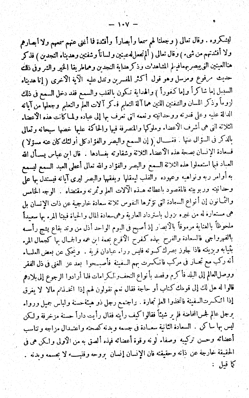 ليشكروه وَقَالَ تَعَالَى {وَجَعَلنَا لَهُم سمعا وأبصارا وأفئدة فَمَا أغْنى عَنْهُم سمعهم وَلَا أَبْصَارهم وَلَا أفئدتهم من شَيْء} وَقَالَ تَعَالَى الم نجْعَل لَهُ عينين وَلِسَانًا وشفتين وهديناه النجدين فَذكر هُنَا الْعَينَيْنِ الَّتِي يبصر بهما فَيعلم المشاهدات وَذكر هِدَايَة النجدين وهما طَرِيقا الْخَيْر وَالشَّر وَفِي ذَلِك حَدِيث مَرْفُوع ومرسل وَهُوَ قَول اكثر الْمُفَسّرين وتدل عَلَيْهِ الاية الاخرى {إِنَّا هديناه السَّبِيل إِمَّا شاكرا وَإِمَّا كفورا} وَالْهِدَايَة تكون بِالْقَلْبِ والسمع فقد دخل السّمع فِي ذَلِك لُزُوما وَذكر اللِّسَان والشفتين اللَّتَيْنِ هما آلَة التَّعْلِيم فَذكر الات الْعلم والتعليم وَجعلهَا من آيَاته الدَّالَّة عَلَيْهِ وعَلى قدرته ووحدانيته ونعمه الَّتِي تعرف بهَا الى عباده وَلما كَانَت هَذِه الاعضاء الثَّلَاثَة الَّتِي هِيَ اشرف الاعضاء وملوكها والمنصرفة فِيهَا والحاكمة عَلَيْهَا خصها سُبْحَانَهُ وَتَعَالَى بِالذكر فِي السُّؤَال عَنْهَا فَقَالَ إِن السّمع وَالْبَصَر والفؤاد كل اولئك كَانَ عَنهُ مسؤلا فسعادة الانسان بِصِحَّة هَذِه الاعضاء الثَّلَاثَة وشقاوته بفسادها قَالَ ابْن عَبَّاس يسْأَل الله الْعباد فِيمَا استعملوا هَذِه الثَّلَاثَة السّمع وَالْبَصَر والفؤاد وَالله تَعَالَى اعطى العَبْد السّمع ليسمع بِهِ اوامر ربه ونواهيه وعهوده وَالْقلب ليعقلها ويفقهها وَالْبَصَر ليرى آيَاته فيستدل بهَا على وحدانيته وربوبيته فالمقصود باعطائه هَذِه الالات الْعلم وثمرته وَمُقْتَضَاهُ الْوَجْه الْخَامِس والثامنون ان انواع السَّعَادَة الَّتِي تؤثرها النُّفُوس ثَلَاثَة سَعَادَة خارجية عَن ذَات الانسان بل هِيَ مستعارة لَهُ من غَيره يَزُول باسترداد الْعَارِية وَهِي سَعَادَة المَال والحياة فَبينا الْمَرْء بهَا سعيدا ملحوظا بالعناية مرموقا بالابصار إِذا اصبح فِي الْيَوْم الْوَاحِد اذل من وتد بقاع يشج رَأسه بالفهرواجي فالسعادة والفرح بِهَذِهِ كفرح الاقرع بحمة ابْن عَمه وَالْجمال بهَا كجمال الْمَرْء بثيابه وبزينته فاذا جَاوز بَصرك كسوته فَلَيْسَ وَرَاء عبادان قَرْيَة ويحكى عَن بعض الْعلمَاء انه ركب مَعَ تجار فِي مركب فَانْكَسَرت بهم السَّفِينَة فاصبحوا بعدعز الْغنى فِي ذل الْفقر وَوصل الْعَالم الى الْبَلَد فاكرم وَقصد بانواع التحف والكرامات فَلَمَّا ارادوا الرُّجُوع الى بِلَادهمْ قَالُوا لَهُ هَل لَك الى قَوْمك كتاب اَوْ حَاجَة فَقَالَ نعم تَقولُونَ لَهُم اذا اتخدتم مَالا لَا يغرق اذا انْكَسَرت السَّفِينَة فاتخذوا الْعلم تِجَارَة وَاجْتمعَ رجل ذُو هَيْئَة حَسَنَة ولباس جميل ورواء بِرَجُل عَالم فجس المخاضة فَلم ير شَيْئا فَقَالُوا كَيفَ رايته فَقَالَ رَأَيْت دَارا حَسَنَة مزخرفة وَلَكِن لَيْسَ بهَا سَاكن السَّعَادَة الثَّانِيَة سَعَادَة فِي جِسْمه وبدنه كصحته واعتدال مزاجه وتناسب اعضائه وَحسن تركيبه وصفاء لَونه وَقُوَّة اعضائه فَهَذِهِ الصق بِهِ من الاولى وَلَكِن هِيَ فِي الْحَقِيقَة خَارِجَة عَن ذَاته وَحَقِيقَته فان الْإِنْسَان انسان بِرُوحِهِ وَقَلبه لَا بجسمه وبدنه كَمَا قيل:
