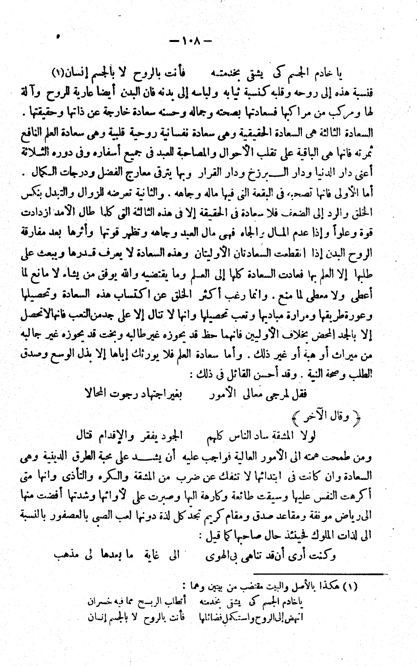 يَا خَادِم الْجِسْم كم يشقى بخدمته ... فَأَنت بِالروحِ لَا بالجسم إِنْسَان فنسبة هَذِه الى روحه وَقَلبه كنسبة ثِيَابه ولباسه الى بدنه فان الْبدن ايضا عَارِية للروح وَآلَة لَهَا ومركب من مراكبها فسعادتها بِصِحَّتِهِ وجماله وحسنة سَعَادَة خَارِجَة عَن ذَاتهَا وحقيقتها السَّعَادَة الثَّالِثَة هِيَ السَّعَادَة الْحَقِيقِيَّة وَهِي سَعَادَة نفسانية روحية قلبية وَهِي سَعَادَة الْعلم النافع ثَمَرَته فانها هِيَ الْبَاقِيَة على تقلب الاحوال والمصاحبة للْعَبد فِي جَمِيع اسفاره وَفِي دوره الثَّلَاثَة اعني دَار الدُّنْيَا وَدَار البرزخ وَدَار الْقَرار وَبهَا يترقى معارج الْفضل ودرجات الْكَمَال اما الاولى فانها تصحبه فِي الْبقْعَة الَّتِي فِيهَا مَاله وجاهه وَالثَّانيَِة تعرضه للزوال والتبدل بنكس الْخلق وَالرَّدّ الى الضعْف فَلَا سَعَادَة فِي الْحَقِيقَة الا فِي هَذِه الثَّالِثَة الَّتِي كلما طَال الامد ازدادات قُوَّة وعلوا وَإِذا عدم المَال والجاه فَهِيَ مَال العَبْد وجاهه وَتظهر قوتها وأثرها بعد مُفَارقَة الرّوح الْبدن اذا انْقَطَعت السعادتان الاوليتان وَهَذِه السَّعَادَة لَا يعرف قدرهَا وَيبْعَث على طلبَهَا الا الْعلم بهَا فَعَادَت السَّعَادَة كلهَا الى الْعلم وَمَا تقضيه وَالله يوفق من يَشَاء لَا مَانع لما اعطى وَلَا معطى لما منع وانما رغب اكثر الْخلق عَن اكْتِسَاب هَذِه السَّعَادَة وتحصيلها وعورة طريقها ومرارة مباديها وتعب تَحْصِيلهَا وانها لاتنال الا على جد من التَّعَب فانها لاتحصل الا بالجد الْمَحْض بِخِلَاف الاوليين فانهما حَظّ قد يحوزه غير طَالبه وبخت قد يحوزه غير جالبه من مِيرَاث اَوْ هبة اَوْ غير ذَلِك واما سَعَادَة الْعلم فَلَا يورثك اياها الا بذل الوسع وَصدق الطّلب وَصِحَّة النِّيَّة وَقد احسن الْقَائِل فِي ذَلِك: