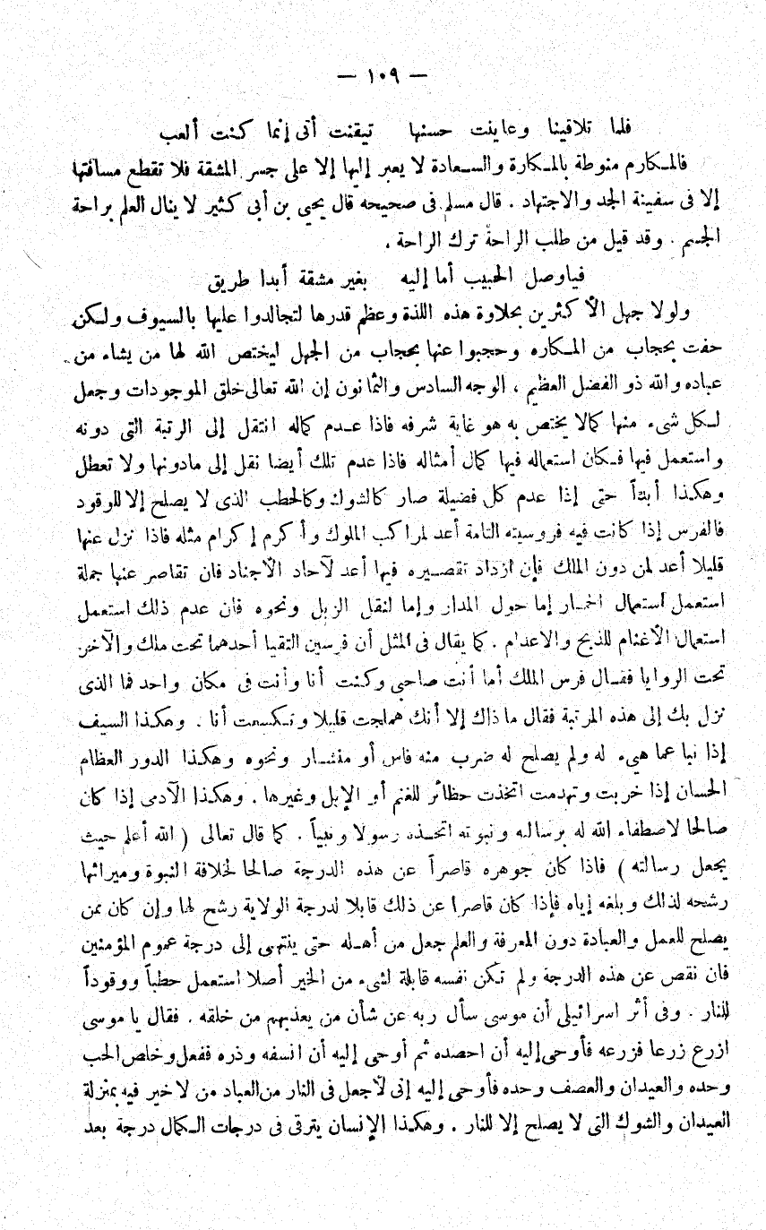 وَلَوْلَا جهل الاكثرين بحلاوة هَذِه اللَّذَّة وَعظم قدرهَا لتجالدوا عَلَيْهَا بِالسُّيُوفِ وَلَكِن حفت بحجاب من المكاره وحجبوا عَنْهَا بحجاب من الْجَهْل ليختص الله لَهَا من يَشَاء من عباده وَالله ذُو الْفضل الْعَظِيم الْوَجْه السَّادِس وَالثَّمَانُونَ ان الله تَعَالَى خلق الموجودات وَجعل لكل شَيْء مِنْهَا كمالا يخْتَص بِهِ هُوَ غَايَة شرفه فَإِذا عدم كَمَاله انْتقل الى الرُّتْبَة الَّتِي دونه وَاسْتعْمل فِيهَا فَكَانَ اسْتِعْمَاله فِيهَا كَمَال امثاله فاذا عدم تِلْكَ ايضا نقل الى مَا دونهَا وَلَا تعطل وَهَكَذَا ابدا حَتَّى اذا عدم كل فَضِيلَة صَار كالشوك وكالحطب الَّذِي لَا يصلح الا للوقود فالفرس اذا كَانَت فِيهِ فروسيته التَّامَّة اعد لمراكب الْمُلُوك واكرم أكرام مثله فَإِذا نزل عَنْهَا قَلِيلا اعد لمن دون الْملك فَإِن ازْدَادَ تَقْصِيره فِيهَا اعد لاحاد الاجناد فان تقاصر عَنْهَا جملَة اسْتعْمل اسْتِعْمَال الْحمار اما حول الْمدَار واما لنقل الزبل وَنَحْوه فان عدم ذَلِك اسْتعْمل اسْتِعْمَال الاغنام للذبح والاعدام كَمَا يُقَال فِي الْمثل ان فرسين التقيا احدهما تَحت ملك والاخر تَحت الروايا فَقَالَ فرس الْملك اما انت صَاحِبي وَكنت انا وانت فِي مَكَان وَاحِد فَمَا الَّذِي نزل بك الى هَذِه الْمرتبَة فَقَالَ مَا ذَاك الا انك هملجت قَلِيلا ونعكست انا وَهَكَذَا السَّيْف اذا نباعما هيء لَهُ وَلم يصلح لَهُ ضرب مِنْهُ فاس اَوْ منشار وَنَحْوه وَهَكَذَا الدّور الْعِظَام الحسان اذا خرجت وتهدمت اتَّخذت حظائر للغنم اَوْ الابل وَغَيرهَا وَهَكَذَا الادمي اذا كَانَ صَالحا لاصطفاء الله لَهُ برسالته ونبوته اتَّخذهُ رَسُولا وَنَبِيًّا كَمَا قَالَ تَعَالَى الله اعْلَم حَيْثُ يَجْعَل رسَالَته فاذا كَانَ جوهره قاصرا عَن هَذِه الدرجَة صَالحا لخلافة النُّبُوَّة وميراثها رشحه لذَلِك وبلغه اياه فَإِذا كَانَ قاصرا عَن ذَلِك قَابلا لدرجة الْولَايَة رشح لَهَا وان كَانَ مِمَّن يصلح للْعَمَل وَالْعِبَادَة دون الْمعرفَة وَالْعلم جعل من اهله حَتَّى يَنْتَهِي الى دَرَجَة عُمُوم الْمُؤمنِينَ فان نقص عَن هَذِه الدرجَة وَلم تكن نَفسه قَابِلَة لشَيْء من الْخَيْر اصلا اسْتعْمل حطبا ووقودا للنار وَفِي اثر اسرائيلي ان مُوسَى سَأَلَ ربه عَن شان من يعذبهم من خلقه فَقَالَ يَا مُوسَى ازرع زرعا فزرعه فاوحى اليه ان احصده ثمَّ اوحى اليه ان أنسفه وذره فَفعل وخلص الْحبّ وَحده والعيدان والعصف وَحده فاوحى اليه اني لاجعل فِي النَّار من الْعباد من لَا خير فِيهِ بِمَنْزِلَة العيدان والشوك الَّتِي لَا يصلح الا للنار وَهَكَذَا الانسان يترقى فِي دَرَجَات الْكَمَال دَرَجَة بعد