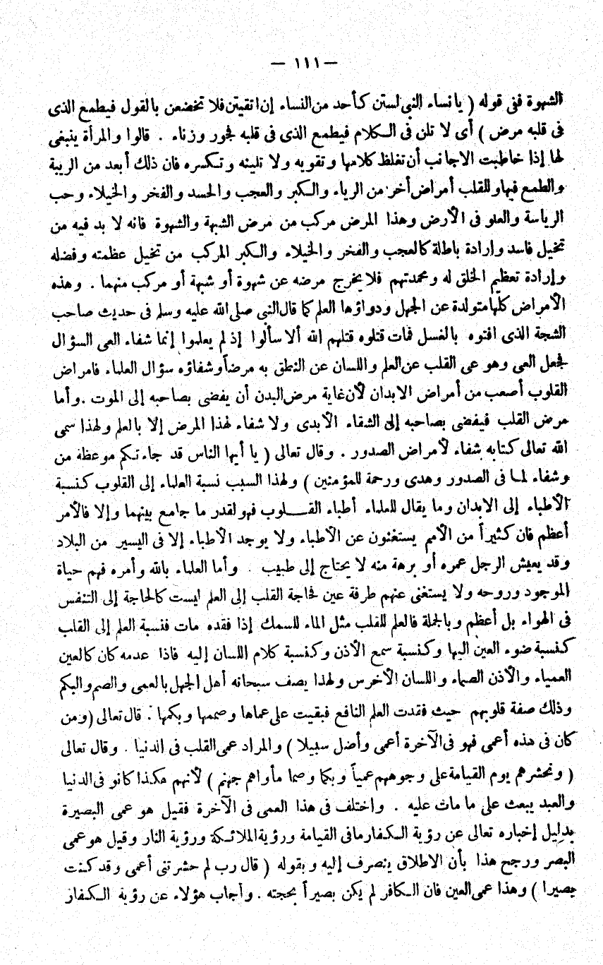 الشَّهْوَة فَفِي قَوْله يانساء النَّبِي لستن كَأحد من النِّسَاء ان اتقيتن فَلَا تخضعن بالْقَوْل فيطمع الَّذِي فِي قلبه مرض أَي لَا تلن فِي الْكَلَام فيطمع الَّذِي فِي قلبه فجور وزناء قَالُوا وَالْمَرْأَة يَنْبَغِي لَهَا اذا خاطبت الاجانب ان تغلظ كَلَامهَا وتقويه وَلَا تلينه وتكسره فان ذَلِك ابعد من الرِّيبَة والطمع فِيهَا وللقلب امراض اخر من الرِّيَاء وَالْكبر وَالْعجب والحسد وَالْفَخْر وَالْخُيَلَاء وَحب الرياسة والعلو فِي الارض وَهَذَا مرض مركب من مرض الشُّبْهَة والشهوة فَإِنَّهُ لَا بُد فِيهِ من تخيل فَاسد وارادة بَاطِلَة كالعجب وَالْفَخْر وَالْخُيَلَاء وَالْكبر الْمركب من تخيل عَظمته وفضله وَإِرَادَة تَعْظِيم الْخلق لَهُ ومحمدتهم فَلَا يخرج مَرضه عَن شَهْوَة اَوْ شُبْهَة اَوْ مركب مِنْهُمَا وَهَذِه الامراض كلهَا مُتَوَلّدَة عَن الْجَهْل ودواؤها الْعلم كَمَا قَالَ النَّبِي فِي حَدِيث صَاحب الشَّجَّة الَّذِي افتوه بِالْغسْلِ فَمَاتَ قَتَلُوهُ قَتلهمْ الله الا سَأَلُوا اذ لم يعلمُوا انما شِفَاء العي السُّؤَال فَجعل العي وَهُوَ عي الْقلب عَن الْعلم وَاللِّسَان عَن النُّطْق بِهِ مَرضا وشفاؤه سُؤال الْعلمَاء فأمراض الْقُلُوب اصعب من امراض الابدان لَان غَايَة مرض الْبدن ان يُفْضِي بِصَاحِبِهِ الى الْمَوْت وَأما مرض الْقلب فيفضي بِصَاحِبِهِ الى الشَّقَاء الابدي وَلَا شِفَاء لهَذَا الْمَرَض الا بِالْعلمِ وَلِهَذَا سمى الله تَعَالَى كِتَابه شِفَاء لامراض الصُّدُور وَقَالَ تَعَالَى يَا أَيهَا النَّاس قد جاءتكم موعظة من ربكُم مِنْهُ وشفاء لما فِي الصُّدُور وَهدى وَرَحْمَة للْمُؤْمِنين وَلِهَذَا السَّبَب نِسْبَة الْعلمَاء الى الْقُلُوب كنسبة الاطباء الى الابدان وَمَا يُقَال للْعُلَمَاء اطباء الْقُلُوب فَهُوَ لقدر مَا جَامع بَينهمَا والا فالامر اعظم فان كثيرا من الامم يستغنون عَن الاطباء وَلَا يُوجد الاطباء الا فِي الْيَسِير من الْبِلَاد وَقد يعِيش الرجل عمره اَوْ بُرْهَة مِنْهُ لَا يحْتَاج الى طَبِيب واما الْعلمَاء بِاللَّه وامره فهم حَيَاة الْمَوْجُود وروحه وَلَا يسْتَغْنى عَنْهُم طرفَة عين فحاجة الْقلب الى الْعلم لَيست كالحاجة الى التنفس فِي الْهَوَاء بل اعظم وَبِالْجُمْلَةِ فالعلم للقلب مثل المَاء للسمك اذا فَقده مَاتَ فنسبة الْعلم الى الْقلب كنسبة ضوء الْعين اليها وكنسبة سمع الاذن وكنسبة كَلَام اللِّسَان اليه فَإِذا عَدمه كَانَ كَالْعَيْنِ العمياء والاذن الصماء وَاللِّسَان الاخرس وَلِهَذَا يصف سُبْحَانَهُ اهل الْجَهْل بالعمى والصم والبكم وَذَلِكَ صفة قُلُوبهم حَيْثُ فقدت الْعلم النافع فَبَقيت على عماها وصممها وبكمها قَالَ تَعَالَى {وَمن كَانَ فِي هَذِه أعمى فَهُوَ فِي الْآخِرَة أعمى وأضل سَبِيلا} وَالْمرَاد عمى الْقلب فِي الدُّنْيَا وَقَالَ تَعَالَى {ونحشرهم يَوْم الْقِيَامَة على وُجُوههم عميا وبكما وصما مأواهم جَهَنَّم} لانهم هَكَذَا كَانُوا فِي الدُّنْيَا وَالْعَبْد يبْعَث على مَا مَاتَ عَلَيْهِ وَاخْتلف فِي هَذَا الْعَمى فِي الاخرة فَقيل هوعمى البصيرة بِدَلِيل اخباره تَعَالَى عَن رُؤْيَة الْكفَّار مَا فِي الْقِيَامَة ورؤية الْمَلَائِكَة ورؤية النَّار وَقيل هُوَ عمي الْبَصَر وَرجح هَذَا بَان الاطلاق ينْصَرف اليه وَبِقَوْلِهِ {قَالَ رب لم حشرتني أعمى وَقد كنت بَصيرًا} وَهَذَا عمي الْعين فان الْكَافِر لم يكن بَصيرًا بحجته واجاب هَؤُلَاءِ عَن رُؤْيَة الْكفَّار