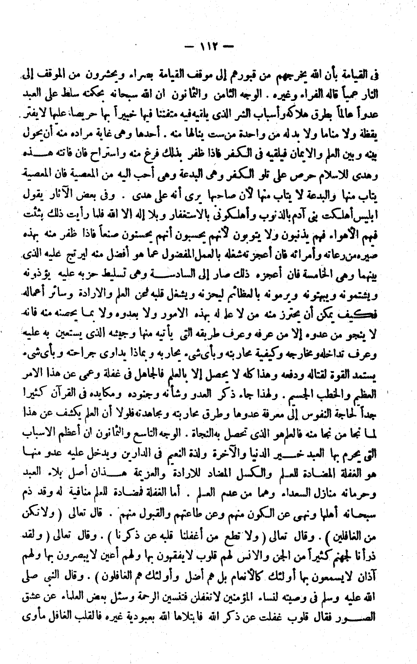 فِي الْقِيَامَة بِأَن الله يخرجهم من قُبُورهم الى موقف الْقِيَامَة بصراء ويحشرون من الْموقف الى النَّار عميا قَالَه الْفراء وَغَيره الْوَجْه الثَّامِن وَالثَّمَانُونَ ان الله سُبْحَانَهُ بِحِكْمَتِهِ سلط على العَبْد عدوا عَالما بطرق هَلَاكه واسباب الشَّرّ الَّذِي يلقيه فِيهِ متفننا فِيهَا خَبِيرا بهَا حَرِيصًا عَلَيْهَا لايفتر يقظة وَلَا مناما وَلَا بُد لَهُ من وَاحِدَة من سِتّ ينالها مِنْهُ احدها وَهِي غَايَة مُرَاده مِنْهُ ان يحول بَينه وَبَين الْعلم والايمان فيلقيه فِي الْكفْر فَإِذا ظفر بذلك فرغ مِنْهُ واستراح فان فَاتَتْهُ هَذِه وَهدى للاسلام حرص على تلو الْكفْر وَهِي الْبِدْعَة وَهِي احب اليه من الْمعْصِيَة فان الْمعْصِيَة يُتَاب مِنْهَا والبدعة لَا يُتَاب مِنْهَا لَان صَاحبهَا يرى انه على هدى وَفِي بعض الاثار يَقُول ابليس اهلكت بني آدم بِالذنُوبِ واهلكوني بالاستغفار وَبلا اله الا الله فَلَمَّا رَأَيْت ذَلِك بثثت فيهم الاهواء فهم يذنبون وَلَا يتوبون لانهم يحسبون انهم يحسنون صنعا فاذا ظفر مِنْهُ بِهَذِهِ صيره من رعاته وامرائه فان اعجزته شغله بِالْعَمَلِ الْمَفْضُول عَمَّا هُوَ افضل مِنْهُ ليرتج عَلَيْهِ الَّذِي بَينهمَا وَهِي الْخَامِسَة فان اعجزه ذَلِك صَار الى السَّادِسَة وَهِي تسليط حزبه عَلَيْهِ يؤذونه ويشتمونه ويبهتونه ويرمونه بالعظائم ليحزنه ويشغل قلبه عَن الْعلم والارادة وَسَائِر اعماله فَكيف يُمكن ان يحْتَرز مِنْهُ من لَا علم لَهُ بِهَذِهِ الامور وَلَا بعدوه وَلَا بِمَا يحصنه مِنْهُ فانه لَا ينجو من عدوه الا من عرفه وَعرف طَرِيقه الَّتِي يَأْتِيهِ مِنْهَا وجيشه الَّذِي يَسْتَعِين بِهِ عَلَيْهِ وَعرفت دَاخله ومخارجه وَكَيْفِيَّة محاربته وَبِأَيِّ شَيْء يحاربه وبماذا يداوى جراحته وَبِأَيِّ شَيْء يستمد الْقُوَّة لقتاله وَدفعه وَهَذَا كُله لَا يحصل الا بِالْعلمِ فالجاهل فِي غَفلَة وعمى عَن هَذَا الامر الْعَظِيم والخطب الجسيم وَلِهَذَا جَاءَ ذكر الْعَدو وشأنه وَجُنُوده ومكايده فِي الْقُرْآن كثيرا جدا لحَاجَة النُّفُوس الى معرفَة عدوها وطرق محاربته ومجاهدته فلولا ان الْعلم يكْشف عَن هَذَا لما نجا من نجا مِنْهُ فالعلم هُوَ الَّذِي تحصل بِهِ النجَاة الْوَجْه التَّاسِع وَالثَّمَانُونَ ان اعظم الاسباب الَّتِي يحرم بهَا العَبْد خير الدُّنْيَا والاخرة وَلَذَّة النَّعيم فِي الدَّاريْنِ وَيدخل عَلَيْهِ عَدو مِنْهَا هُوَ الْغَفْلَة المضادة للْعلم والكسل المضاد للارادة والعزيمة هَذَانِ اصل بلَاء العَبْد وحرمانه منَازِل السُّعَدَاء وهما من عدم الْعلم اما الْغَفْلَة فمضادة للْعلم مُنَافِيَة لَهُ وَقد ذمّ سُبْحَانَهُ اهلها وَنهى عَن الْكَوْن مِنْهُم وَعَن طاعتهم وَالْقَبُول مِنْهُم قَالَ تَعَالَى ولاتكن من الغافلين وَقَالَ تَعَالَى {وَلَا تُطِع من أَغْفَلنَا قلبه عَن ذكرنَا} وَقَالَ تَعَالَى وَلَقَد ذرأنا لِجَهَنَّم كثيرا من الْجِنّ والانس لَهُم قُلُوب لَا يفقهُونَ بهَا وَلَهُم اعين لَا يبصرون بهَا وَلَهُم آذان لَا يسمعُونَ بهَا اولئك كالانعام بل هم اضل واولئك هم الغافلون وَقَالَ النَّبِي فِي وَصيته لِنسَاء الْمُؤمنِينَ لَا تغفلن فتنسين الرَّحْمَة وَسُئِلَ بعض الْعلمَاء عَن عشق الصُّور فَقَالَ قُلُوب غفلت عَن ذكر الله فابتلاها الله بعبودية غَيره فالقلب الغافل مأوى