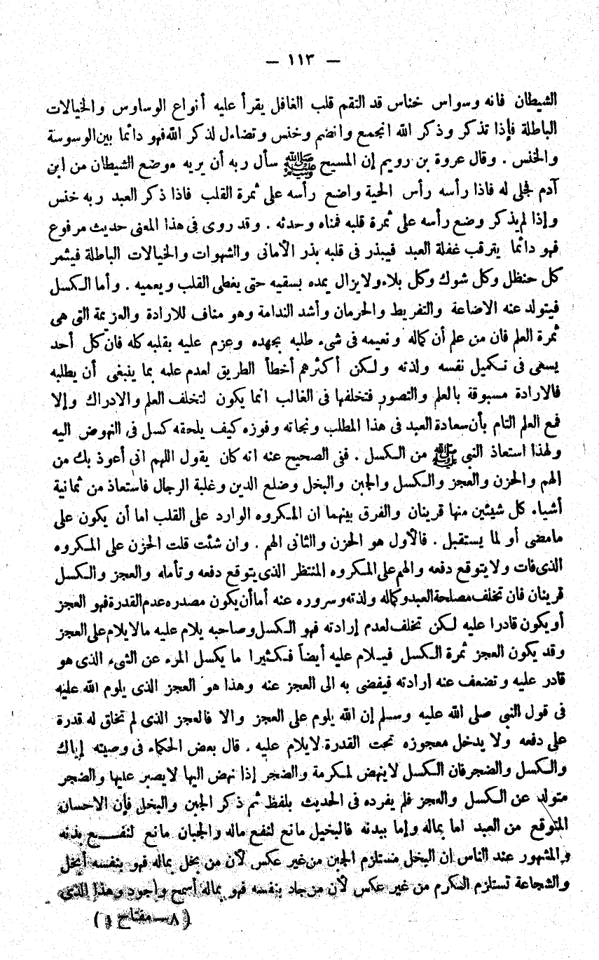 الشَّيْطَان فانه وسواس خناس قد الْتَقم قلب الغافل يقْرَأ عَلَيْهِ انواع الوساوس والخيالات الْبَاطِلَة فاذا تذكر وَذكر الله انجمع وانضم وخنس وتضاءل لذكر الله فَهُوَ دَائِما بَين الوسوسة والخنس وَقَالَ عُرْوَة بن رُوَيْم ان الْمَسِيح سَأَلَ ربه ان يرِيه مَوضِع الشَّيْطَان من ابْن آدم فَجلى لَهُ فاذا رَأسه راس الْحَيَّة وَاضع راسه على ثَمَرَة الْقلب فَإِذا ذكر العَبْد ربه خنس وَإِذا لم يذكر وضع رَأسه على ثَمَرَة قلبه فمناه وحدثه وَقد روى فِي هَذَا الْمَعْنى حَدِيث مَرْفُوع فَهُوَ دَائِما يترقب غَفلَة العَبْد فيبذر فِي قلبه بذر الاماني والشهوات والخيالات الْبَاطِلَة فيثمر كل حنظل وكل شوك وكل بلَاء وَلَا يزَال يمده بسقيه حَتَّى يغطى الْقلب ويعميه واما الكسل فيتولد عَنهُ الاضاعة والتفريط والحرمان واشد الندامة وَهُوَ منَاف لاراده والعزيمة الَّتِي هِيَ ثَمَرَة الْعلم فان من علم ان كَمَاله ونعيمه فِي شَيْء طلبه بِجهْدِهِ وعزم عَلَيْهِ بِقَلْبِه كُله فَإِن كل اُحْدُ يسْعَى فِي تَكْمِيل نَفسه ولذته وَلَكِن اكثرهم اخطأ الطَّرِيق لعدم علمه بِمَا يَنْبَغِي ان يَطْلُبهُ فالارادة مسبوقة بِالْعلمِ والتصور فتخلفها فِي الْغَالِب إِنَّمَا يكون لتخلف الْعلم والادراك وَإِلَّا فَمَعَ الْعلم التَّام بَان سَعَادَة العَبْد فِي هَذَا الْمطلب ونجاته وفوزه كَيفَ يلْحقهُ كسل فِي النهوض اليه وَلِهَذَا استعاذ النَّبِي من الكسل فَفِي الصَّحِيح عَنهُ انه كَانَ يَقُول اللَّهُمَّ اني اعوذ بك من الْهم والحزن وَالْعجز والكسل والجبن وَالْبخل وضلع الدّين وَغَلَبَة الرِّجَال فاستعاذ من ثَمَانِيَة اشياء كل شَيْئَيْنِ مِنْهَا قرينان وَالْفرق بَينهمَا ان الْمَكْرُوه الْوَارِد على الْقلب اما ان يكون على مَا مضى اَوْ لما يسْتَقْبل فالاول هُوَ الْحزن وَالثَّانِي الْهم وان شِئْت قلت الْحزن على الْمَكْرُوه الَّذِي فَاتَ وَلَا يتَوَقَّع دَفعه والهم على الْمَكْرُوه المنتظر الَّذِي يتَوَقَّع دَفعه وتأمله وَالْعجز والكسل قرينان فان تخلف مصلحَة العَبْد وكماله ولذته وسروره عَنهُ اما ان يكون مصدره عدم الْقُدْرَة فَهُوَ الْعَجز اَوْ يكون قارا عَلَيْهِ لَكِن تخلف لعدم إِرَادَته فَهُوَ الكسل وَصَاحبه يلام عيه مَالا يلام على الْعَجز وَقد يكون الْعَجز ثَمَرَة الكسل فيلام عَلَيْهِ ايضا فكثيرا مَا يكسل الْمَرْء عَن الشَّيْء الَّذِي هُوَ قَادر عَلَيْهِ وتضعف عَنهُ ارادته فيفضي بِهِ الى الْعَجز عَنهُ وَهَذَا هُوَ الْعَجز الَّذِي يلوم الله عَلَيْهِ فِي قَول النَّبِي ان الله يلوم على الْعَجز وَإِلَّا فالعجز الَّذِي لم تخلق لَهُ قدرَة على دَفعه وَلَا يدْخل معجوزه تَحت الْقُدْرَة لَا يلام عَلَيْهِ قَالَ بعض الْحُكَمَاء فِي وَصيته إياك والكسل والضجر فان الكسل لَا ينْهض لمكرمة والضجر إِذا نَهَضَ اليها لَا يصبر عَلَيْهَا والضجر متولدعن الكسل وَالْعجز فَلم يفرده فِي الحَدِيث بِلَفْظ ثمَّ ذكر الْجُبْن وَالْبخل فان الاحسان المتوقع من العَبْد اما بِمَالِه واما بِبدنِهِ فالبخيل مَانع لنفع مَاله والجبان مَانع لنفع بدنه الْمَشْهُور عِنْد النَّاس ان الْبُخْل مُسْتَلْزم الْجُبْن من غير عكس لَان من بخل بِمَالِه فَهُوَ بِنَفسِهِ ابخل والشجاعة تَسْتَلْزِم الْكَرم من غير عكس لَان من جاد بِنَفسِهِ فَهُوَ بِمَالِه اسمح واجود وَهَذَا الَّذِي