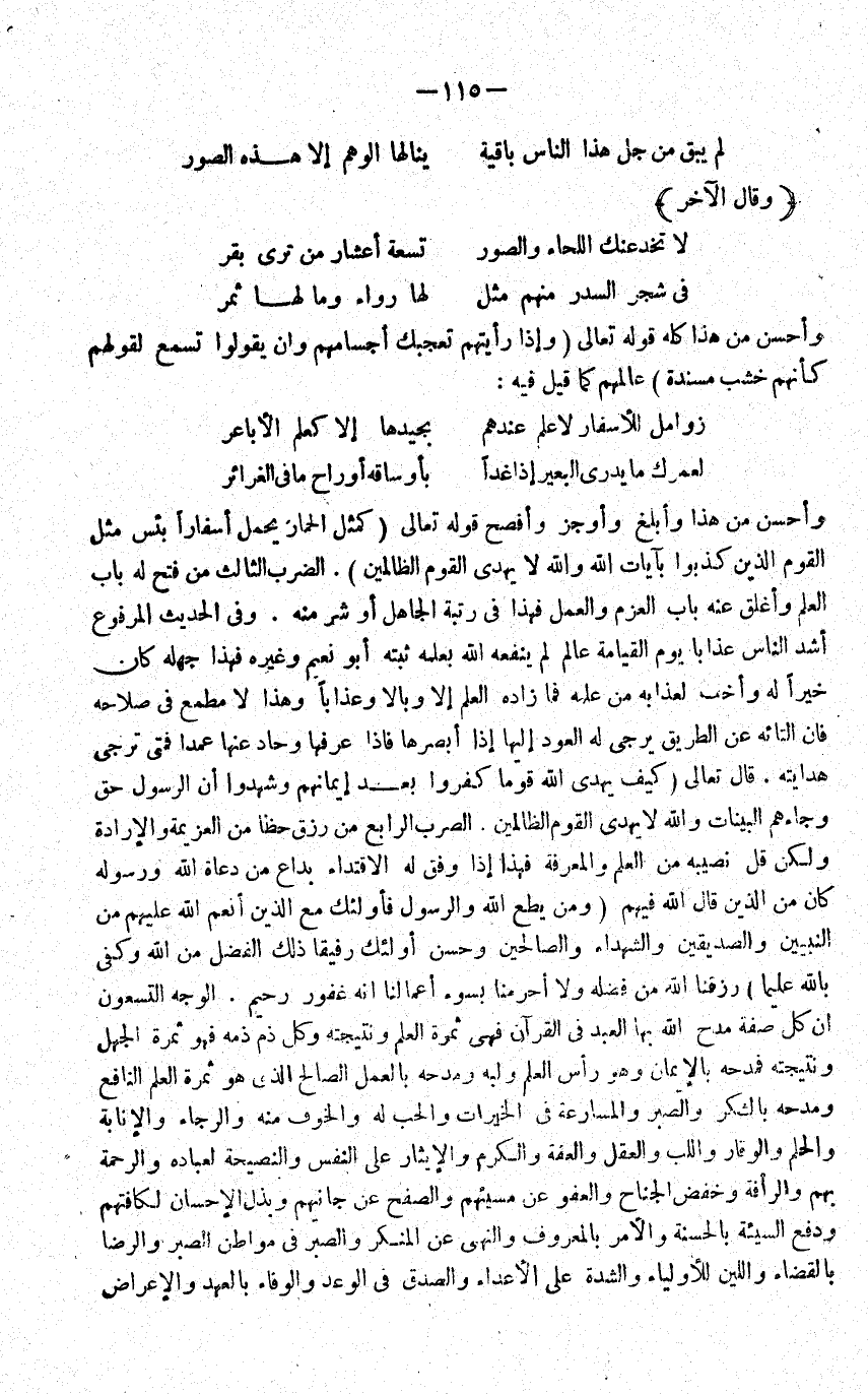 زوامل للأسفار لَا علم عِنْدهم ... يجيدها الا كعلم الاباعر لعمرك مَا يدْرِي الْبَعِير إِذا غَدا ... باوساقه اَوْ رَاح مَا فِي الغرائر واحسن من هَذَا وابلغ واوجز وافصح قَوْله تَعَالَى كَمثل الْحمار يحمل اسفارا بئس مثل الْقَوْم الَّذين كذبُوا بآيَات الله وَالله لَا يهدي الْقَوْم الظَّالِمين الضَّرْب الثَّالِث من فتح لَهُ بَاب الْعلم وأغلق عَنهُ بَاب الْعَزْم وَالْعَمَل فَهَذَا فِي رُتْبَة الْجَاهِل اَوْ شَرّ مِنْهُ وَفِي الحَدِيث الْمَرْفُوع اشد النَّاس عذَابا يَوْم الْقِيَامَة عَالم لم يَنْفَعهُ الله بِعِلْمِهِ ثبته ابو نعيم وَغَيره فَهَذَا جَهله كَانَ خيرا لَهُ واخف لعذابه من كمله فَمَا زَاده الْعلم إِلَّا وبالا وَعَذَابًا وَهَذَا لَا مطمع فِي صَلَاحه فَإِن التائه عَن الطَّرِيق يُرْجَى لَهُ الْعود اليها إِذا ابصرها فَإِذا عرفهَا وحاد عَنْهَا عمدا فَمَتَى ترجى هدايته قَالَ تَعَالَى كَيفَ يهدي الله قوما كفرُوا بعد إِيمَانهم وشهدوا ان الرَّسُول حق وجاءهم الْبَينَات وَالله لَا يهدي الْقَوْم الظَّالِمين الضَّرْب الرَّابِع من رزق حظا من الْعَزِيمَة والارادة وَلَكِن قل نصِيبه من الْعلم والمعرفة فَهَذَا اذا وفْق لَهُ الِاقْتِدَاء بداع من دعاة الله وَرَسُوله كَانَ من الَّذين قَالَ الله فيهم {وَمن يطع الله وَالرَّسُول فَأُولَئِك مَعَ الَّذين أنعم الله عَلَيْهِم من النَّبِيين وَالصديقين وَالشُّهَدَاء وَالصَّالِحِينَ وَحسن أُولَئِكَ رَفِيقًا ذَلِك الْفضل من الله وَكفى بِاللَّه عليما} رزقنا الله من فَضله وَلَا احرمنا بِسوء اعمالنا انه غَفُور رَحِيم الْوَجْه التِّسْعُونَ ان كل صفة مدح الله بهَا العَبْد فِي الْقُرْآن فَهِيَ ثَمَرَة الْعلم ونتيجته وكل ذمّ ذمه فَهُوَ ثَمَرَة الْجَهْل ونتيجته فمدحه بالايمان وَهُوَ راس الْعلم ولبه ومدحه بِالْعَمَلِ الصَّالح الَّذِي هُوَ ثَمَرَة الْعلم النافع ومدحه بالشكر وَالصَّبْر والمسارعة فِي الْخيرَات وَالْحب لَهُ وَالْخَوْف مِنْهُ والرجاء والانابة والحلم وَالْوَقار واللب وَالْعقل والعفة وَالْكَرم والايثار على النَّفس والنصيحة لِعِبَادِهِ وَالرَّحْمَة بهم والرأفة وخفض الْجنَاح وَالْعَفو عَن مسيئهم والصفح عَن جانبهم وبذل الاحسان لكافتهم وَدفع السَّيئَة بِالْحَسَنَة والامر بِالْمَعْرُوفِ وَالنَّهْي عَن الْمُنكر وَالصَّبْر فِي مَوَاطِن الصَّبْر وَالرِّضَا بِالْقضَاءِ واللين للأولياء والشدة على الاعداء والصدق فِي الْوَعْد وَالْوَفَاء بالعهد والاعراض
