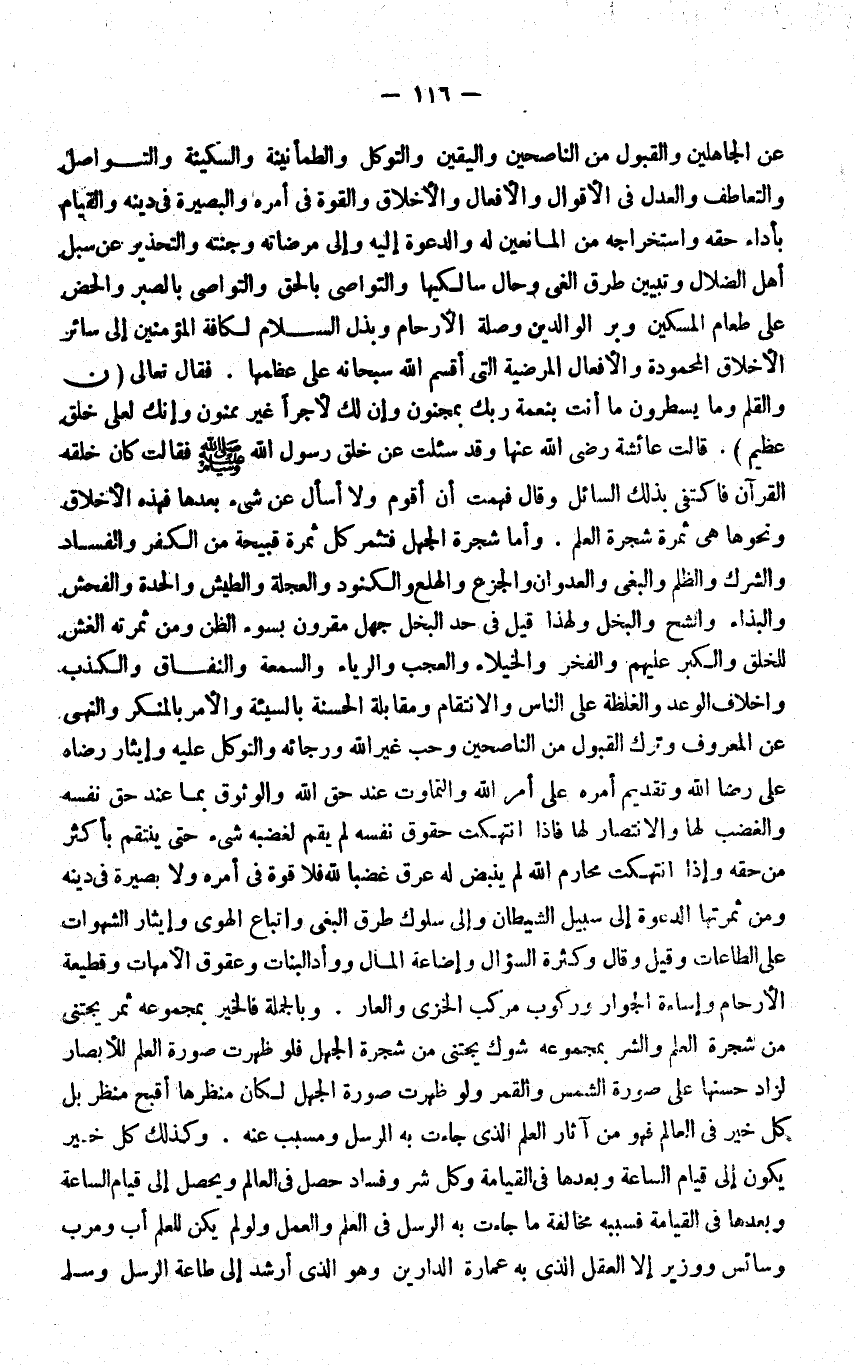 عَن الْجَاهِلين وَالْقَبُول من الناصحين وَالْيَقِين والتوكل والطمأنينة والسكينة والتواصل والتعاطف وَالْعدْل فِي الاقوال والافعال والاخلاق وَالْقُوَّة فِي امْرَهْ والبصيرة فِي دينه وَالْقِيَام بأَدَاء حَقه واستخراجه من المانعين لَهُ والدعوة اليه وَإِلَى مرضاته وجنته والتحذير عَن سبل اهل الضلال وتبيين طرق الغي وَحَال سالكيها والتواصي بِالْحَقِّ والتواصي بِالصبرِ والحض على طَعَام الْمِسْكِين وبر الْوَالِدين وصلَة الارحام وبذل السَّلَام لكافة الْمُؤمنِينَ الى سَائِر الاخلاق المحمودة والافعال المرضية الَّتِي اقْسمْ الله سُبْحَانَهُ على عظمها فَقَالَ تَعَالَى {ن والقلم وَمَا يسطرون مَا أَنْت بِنِعْمَة رَبك بمجنون وَإِن لَك لأجرا غير ممنون وَإنَّك لعلى خلق عَظِيم} قَالَت عَائِشَة رضى الله عَنْهَا وَقد سُئِلت عَن خلق رَسُول الله فَقَالَت كَانَ خلقه الْقُرْآن فَاكْتفى بذلك السَّائِل وَقَالَ فهمت ان اقوم وَلَا أسَال عَن شَيْء بعْدهَا فَهَذِهِ الاخلاق وَنَحْوهَا هِيَ ثَمَرَة شَجَرَة الْعلم واما شَجَرَة الْجَهْل فتثمر كل ثَمَرَة قبيحة من الْكفْر وَالْفساد والشرك وَالظُّلم وَالْبَغي والعدوان والجزع والهلع والكنود والعجلة والطيش والحدة وَالْفُحْش وَالْبذَاء وَالشح وَالْبخل وَلِهَذَا قيل فِي حد الْبُخْل جهل مقرون بِسوء الظَّن وَمن ثَمَرَته الْغِشّ لِلْخلقِ وَالْكبر عَلَيْهِم وَالْفَخْر وَالْخُيَلَاء وَالْعجب والرياء والسمعة والنفاق وَالْكذب واخلاف الْوَعْد والغلظة على النَّاس والانتقام ومقابلة الْحَسَنَة بِالسَّيِّئَةِ والامر بالمنكر وَالنَّهْي عَن الْمَعْرُوف وَترك الْقبُول من الناصحين وَحب غير الله ورجائه والتوكل عَلَيْهِ وإيثار رِضَاهُ على رضَا الله وَتَقْدِيم امْرَهْ على امْر الله والتماوت عِنْد حق الله والوثوق بِمَا عِنْد حق نَفسه وَالْغَضَب لَهَا والانتصار لَهَا فَإِذا انتهكت حُقُوق نَفسه لم يقم لغضبه شَيْء حَتَّى ينْتَقم بِأَكْثَرَ من حَقه وَإِذا انتهكت محارم الله لم ينبض لَهُ عرق غَضبا لله فَلَا قُوَّة فِي امْرَهْ وَلَا بَصِيرَة فِي دينه وَمن ثَمَرَتهَا الدعْوَة الى سَبِيل الشَّيْطَان وَإِلَى سلوك طرق الْبَغي وَاتِّبَاع الْهوى وايثار الشَّهَوَات على الطَّاعَات وَقيل وَقَالَ وَكَثْرَة السُّؤَال وإضاعة المَال ووأد الْبَنَات وعقوق الامهات وَقَطِيعَة الارحام وإساءة الْجوَار وركوب مركب الخزي والعار وبالحملة فالخير بمجموعه ثَمَر يجتنى من شَجَرَة الْعلم وَالشَّر بمجموعه شوك يجتنى من شَجَرَة الْجَهْل فَلَو ظَهرت صُورَة الْعلم للأبصار لزاد حسنها على صُورَة الشَّمْس وَالْقَمَر وَلَو ظَهرت صُورَة الْجَهْل لَكَانَ منظرها اقبح منظر بل كل خير فِي الْعَالم فَهُوَ من آثَار الْعلم الَّذِي جَاءَت بِهِ الرُّسُل ومسبب عَنهُ وَكَذَلِكَ كل خير يكون الى قيام السَّاعَة وَبعدهَا فِي الْقِيَامَة وكل شَرّ وَفَسَاد حصل فِي الْعَالم وَيحصل الى قيام السَّاعَة وَبعدهَا فِي الْقِيَامَة فسببه مُخَالفَة مَا جَاءَت بِهِ الرُّسُل فِي الْعلم وَالْعَمَل وَلَو لم يكن للْعلم اب ومرب وسائس ووزير الا الْعقل الَّذِي بِهِ عمَارَة الدَّاريْنِ وَهُوَ الَّذِي ارشد الى طَاعَة الرُّسُل وَسلم