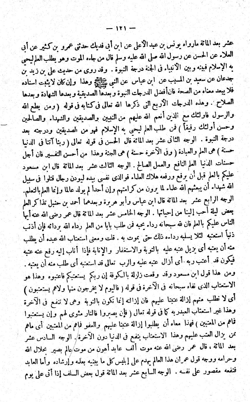 عشر بعدالمائة مَا رَوَاهُ يُونُس بن عبد الاعلى عَن ابْن ابي فديك حَدثنِي عَمْرو بن كثير عَن ابي الْعَلَاء عَن الْحسن عَن رَسُول الله قَالَ من جَاءَهُ الْمَوْت وَهُوَ يطْلب الْعلم ليحيى بِهِ الاسلام فبينه وَبَين الانبياء فِي الْجنَّة دَرَجَة النُّبُوَّة وَقد روى من حَدِيث عَليّ بن زيد بن جدعَان عَن سعيد بن الْمسيب عَن ابْن عَبَّاس عَن النَّبِي وَهَذَا وَإِن كَانَ لَا يثبت اسناده فَلَا يبعد مَعْنَاهُ من الصِّحَّة فَإِن افضل الدَّرَجَات النُّبُوَّة وَبعدهَا الصديقية وَبعدهَا الشَّهَادَة وَبعدهَا الصّلاح وَهَذِه الدَّرَجَات الاربع الَّتِي ذكرهَا الله تَعَالَى فِي كِتَابه فِي قَوْله {وَمن يطع الله وَالرَّسُول فَأُولَئِك مَعَ الَّذين أنعم الله عَلَيْهِم من النَّبِيين وَالصديقين وَالشُّهَدَاء وَالصَّالِحِينَ وَحسن أُولَئِكَ رَفِيقًا} فَمن طلب الْعلم ليحيى بِهِ الاسلام فَهُوَ من الصديقين ودرجته بعد دَرَجَة النُّبُوَّة الْوَجْه الثَّانِي عشر بعدالمائة قَالَ الْحسن فِي قَوْله تَعَالَى {رَبنَا آتنا فِي الدُّنْيَا حَسَنَة} هِيَ الْعلم وَالْعِبَادَة {وَفِي الْآخِرَة حَسَنَة} هِيَ الْجنَّة وَهَذَا من احسن التَّفْسِير فَإِن اجل حَسَنَات الدُّنْيَا الْعلم النافع وَالْعَمَل الصَّالح الْوَجْه الثَّالِث عشر بعدالمائة قَالَ ابْن مسعودعليكم بِالْعلمِ قبل ان يرفع وَرَفعه هَلَاك الْعلمَاء فوالذي نَفسِي بِيَدِهِ ليودن رجال قتلوا فِي سَبِيل الله شُهَدَاء ان يَبْعَثهُم الله عُلَمَاء لما يرَوْنَ من كرامتهم وَإِن احدا لم يُولد عَالما وَإِنَّمَا الْعلم بالتعلم الْوَجْه الرَّابِع عشر بعد الْمِائَة قَالَ ابْن عَبَّاس وابو هُرَيْرَة وبعدهما احْمَد بن حَنْبَل تَذَاكر الْعلم بعض لَيْلَة احب الينا من احيائها الْوَجْه الْخَامِس عشر بعدالمائة قَالَ عمر رضى الله عَنهُ ايها النَّاس عَلَيْكُم بِالْعلمِ فَإِن لله سُبْحَانَهُ رِدَاء يُحِبهُ فَمن طلب بَاب من الْعلم رداه الله بردائه فَإِن اذنب ذَنبا استعتبه لِئَلَّا يسلبه رِدَاءَهُ ذَلِك حَتَّى يَمُوت بِهِ قلت وَمعنى استعتاب الله عَبدة ان يطْلب مِنْهُ ان يعتبه أَي يزِيل عَتبه عَلَيْهِ بِالتَّوْبَةِ وَالِاسْتِغْفَار والانابة فَإِذا اناب اليه رفع عَنهُ عتبَة فَيكون قد اعتب ربه أَي ازال عَتبه عَلَيْهِ والرب تَعَالَى قد استعتبه أَي طلب مِنْهُ ان يعتبه وَمن هَذَا قَول ابْن مَسْعُود وَقد وَقعت زَلْزَلَة بِالْكُوفَةِ ان ربكُم يستعتبكم فاعتبوه وَهَذَا هُوَ الاستعتاب الَّذين تقاه سُبْحَانَهُ فِي الاخرة فِي قَوْله {فاليوم لَا يخرجُون مِنْهَا وَلَا هم يستعتبون} أَي لَا نطلب مِنْهُم إِزَالَة عتبنا عَلَيْهِم فَإِن إِزَالَته إِنَّمَا تكون بِالتَّوْبَةِ وَهِي لَا تَنْفَع فِي الاخرة وَهَذَا غير استعتاب العَبْد ربه كَمَا فِي قَوْله تَعَالَى فَإِن يصبروا فَالنَّار مثوى لَهُم وان يستعتبوا فماهم من المعتبين فَهَذَا مَعْنَاهُ ان يطلبوا إِزَالَة عتبنا عَلَيْهِم وَالْعَفو فماهم من المعتبين أَي ماهم مِمَّن يزَال العتب عَلَيْهِم وَهَذَا الاستعتاب ينفع فِي الدُّنْيَا دون الاخرة الْوَجْه السَّادِس عشر بعدالمائة قَالَ عمر رضى الله عَنهُ موت الف عَابِد اهون من موت عَالم بَصِير بحلال الله وَحَرَامه وَوجه قَول عمر ان هَذَا الْعَالم يهدم على إِبْلِيس كل مَا يبنيه بِعِلْمِهِ وإرشاده واما العابد فنفعه مَقْصُور على نَفسه الْوَجْه السَّابِع عشر بعدالمائة قَول بعض السّلف إِذا اتى على يَوْم