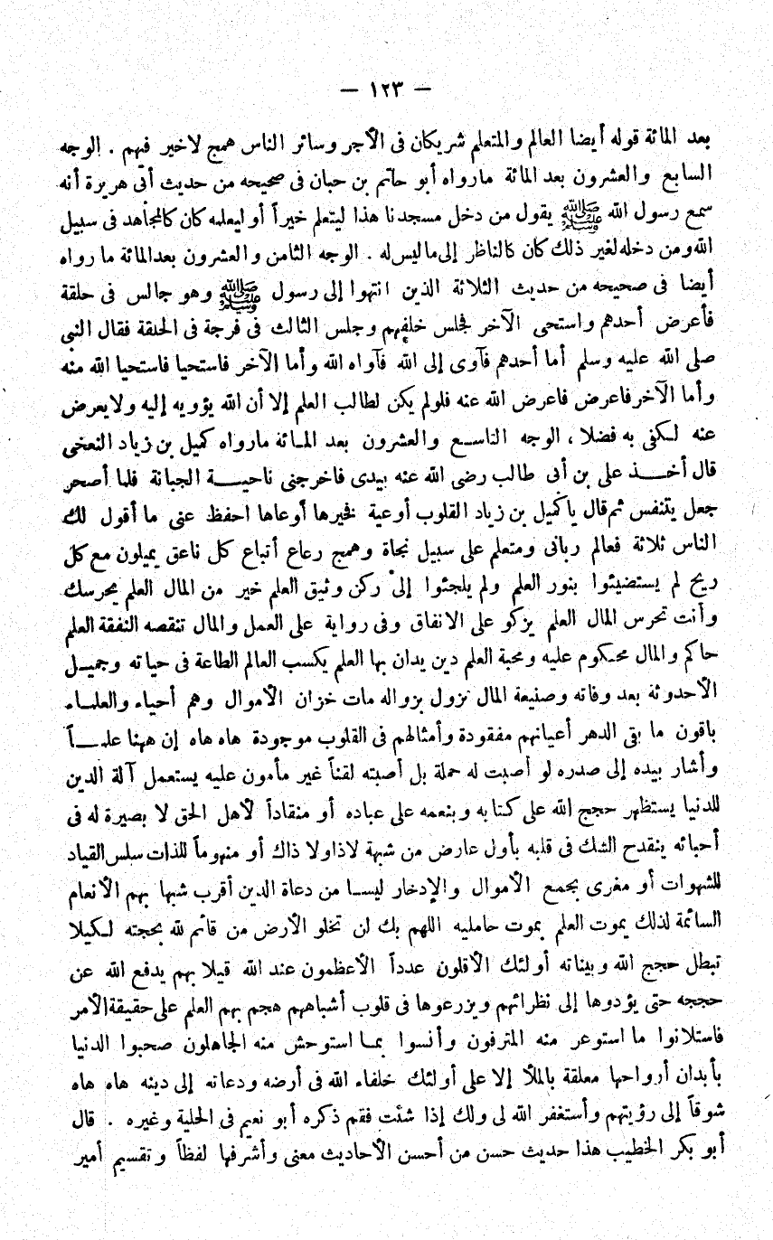 بعدالمائة قَوْله ايضا الْعَالم والمتعلم شريكان فِي الاجر وَسَائِر النَّاس همج لَا خير فيهم الْوَجْه السَّابِع وَالْعشْرُونَ بعدالمائة مَا رَوَاهُ ابو حَاتِم بن حبَان فِي صَحِيحه من حَدِيث ابي هُرَيْرَة انه سمع رَسُول الله يَقُول من دخل مَسْجِدنَا هَذَا ليتعلم خيرا اَوْ ليعلمه كَانَ كالمجاهد فِي سَبِيل الله وَمن دخله لغير ذَلِك كَانَ كالناظر الى مَا لَيْسَ لَهُ الْوَجْه الثَّامِن وَالْعشْرُونَ بعدالمائة مَا رَوَاهُ ايضا فِي صَحِيحه من حَدِيث الثَّلَاثَة الَّذين انْتَهوا الى رَسُول الله وَهُوَ جَالس فِي حلقه فَأَعْرض احدهم واستحى الاخر فَجَلَسَ خَلفهم وَجلسَ الثَّالِث فِي فُرْجَة فِي الْحلقَة فَقَالَ النَّبِي اما احدهم فأوى الى الله فآواه الله وَأما الاخر فاستيحا فاستحيا الله مِنْهُ وَأما الاخر فاعرض فاعرض الله عَنهُ فلولم يكن لطَالب الْعلم الا ان الله يؤويه اليه وَلَا يعرض عَنهُ لكفى بِهِ فضلا الْوَجْه التَّاسِع وَالْعشْرُونَ بعد الْمِائَة مَا رَوَاهُ كميل بن زِيَاد النَّخعِيّ قَالَ اخذ عَليّ بن ابي طَالب رضى الله عَنهُ بيَدي فاخرجني نَاحيَة الْجَبانَة فَلَمَّا اصحر جعل يتنفس ثمَّ قَالَ يَا كميل بن زِيَاد الْقُلُوب اوعية فَخَيرهَا اوعاها احفظ عني مَا اقول لَك النَّاس ثَلَاثَة فعالم رباني ومتعلم على سَبِيل نجاة وهمج رعاع اتِّبَاع كل ناعق يميلون مَعَ كل ريح لم يستضيئؤوا بِنور الْعلم وَلم يلجئوا الى ركن وثيق الْعلم خير من المَال الْعلم يحرسك وانت تحرس المَال الْعلم يكزكوا على الانفاق وَفِي رِوَايَة على الْعَمَل وَالْمَال تنقصه النَّفَقَة الْعلم حَاكم وَالْمَال مَحْكُوم عَلَيْهِ ومحبة الْعلم دين يدان بهَا الْعلم يكْسب الْعَالم الطَّاعَة فِي حَيَاته وَجَمِيل الاحدوثة بعد وَفَاته وصنيعة المَال تَزُول بزواله مَاتَ خزان الاموال وهم احياء وَالْعُلَمَاء باقون مَا بَقِي الدَّهْر اعيانهم مفقودة وأمثالهم فِي الْقُلُوب مَوْجُودَة هاه هاه إِن هَهُنَا علما واشار بِيَدِهِ الى صَدره لَو اصبت لَهُ حَملَة بل اصبته لقنا غير مَأْمُون عَلَيْهِ يسْتَعْمل آلَة الدّين للدنيا يستظهر حجج الله على كِتَابه وبنعمه على عباده اَوْ منقادا لاهل الْحق لَا بَصِير لَهُ فِي احبائه ينقدح الشَّك فِي قلبه بِأول عَارض من شُبْهَة لاذاو لَا ذَاك اَوْ منهوما للذات سَلس القياد للشهوات اَوْ مغرى بِجمع الاموال والادخار ليسَا من دعاة الدّين اقْربْ شبها بهم الانعام السَّائِمَة لذَلِك يَمُوت الْعلم بِمَوْت حامليه اللَّهُمَّ بك لن تَخْلُو الارض من قَائِم لله بحجته لكيلا تبطل حجج الله وبنياته اولئك الاقلون عددا الاعظمون عِنْد الله قيلا بهم يدْفع الله عَن حججه حَتَّى يؤدوها الى نظرائهم ويزرعوها فِي قُلُوب اشابههم هجم بهم الْعلم على حَقِيقَة الامر فاستلانوا مَا استوعر مِنْهُ المترفون وانسوا بِمَا استوحش مِنْهُ الجاهلون صحبوا الدُّنْيَا بأبدان ارواحها معلقَة بالملأ الاعلى اولئك خلفاء الله فِي ارضه ودعاته الى دينه هاه هاه شوقا الى رُؤْيَتهمْ واستغفر الله لي وَلَك اذا شِئْت فَقُمْ ذكره ابو نعيم فِي الْحِلْية وَغَيره قَالَ ابو بكر الْخَطِيب هَذَا حَدِيث حسن من احسن الاحاديث معنى واشرفها لفظا وتقسيم امير