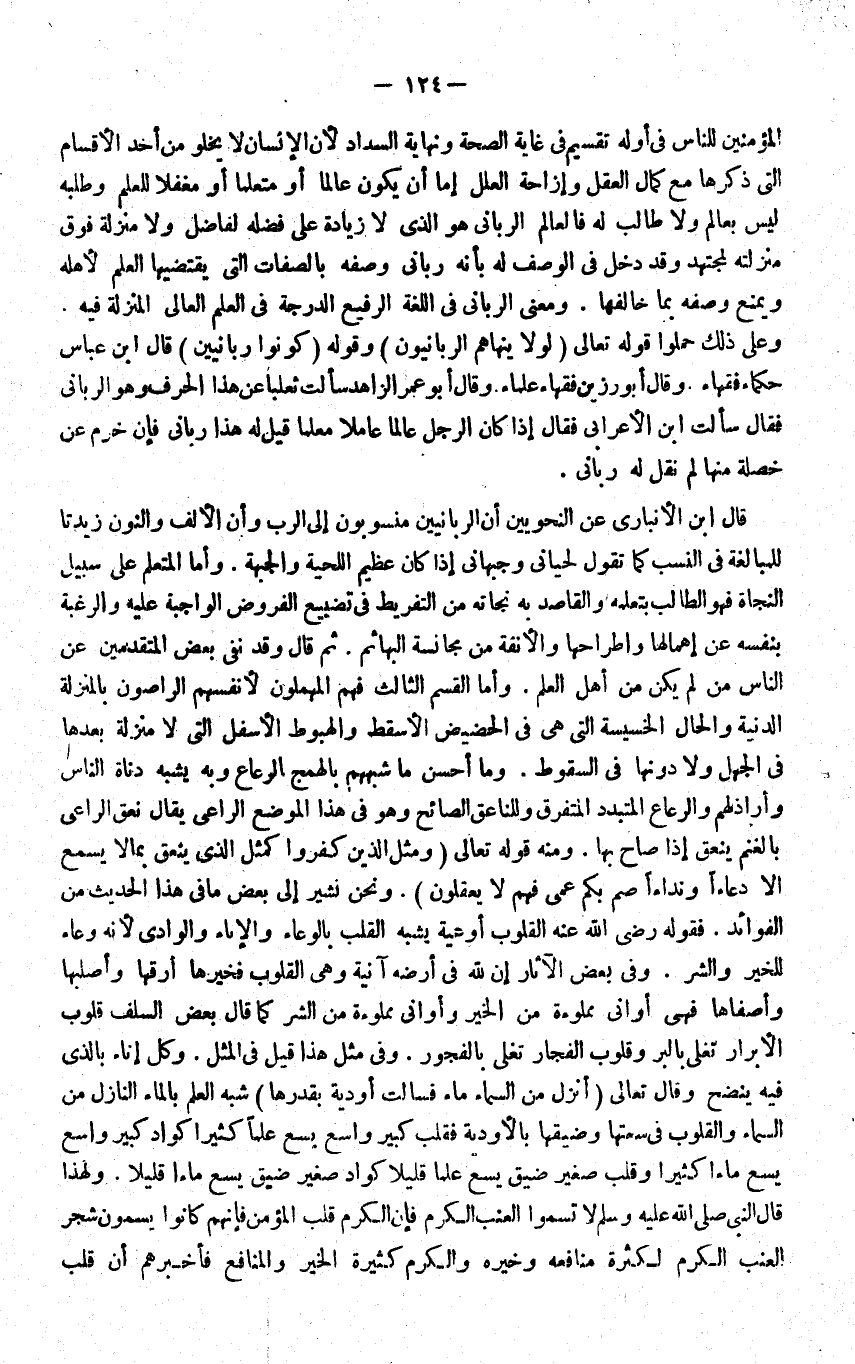 الْمُؤمنِينَ للنَّاس فِي اوله تَقْسِيم فِي غَايَة الصِّحَّة وَنِهَايَة السداد لَان الانسان لَا يَخْلُو من اُحْدُ الاقسام الَّتِي ذكرهَا مَعَ كَمَال الْعقل وإزاحة الْعِلَل اما ان يكون عَالما اَوْ متعلما اَوْ مغفلا للْعلم وَطَلَبه الْيَسْ بعالم وَلَا طَالب لَهُ فالعالم الرباني هُوَ الَّذِي لَا زِيَادَة على فَضله لفاضل وَلَا منزلَة فَوق مَنْزِلَته لمجتهد وَقد دخل فِي الْوَصْف لَهُ بانه رباني وَصفه بِالصِّفَاتِ الَّتِي يقتضيها الْعلم لاهله وَيمْنَع وَصفه بِمَا خالفها وَمعنى الرباني فِي اللُّغَة الرفيع الدرجَة فِي الْعلم العالي الْمنزلَة فِيهِ وعَلى ذَلِك حملُوا قَوْله تَعَالَى {لَوْلَا ينهاهم الربانيون} وَقَوله {كونُوا ربانيين} قَالَ ابْن عَبَّاس حكماء فُقَهَاء وَقَالَ ابو رزين فُقَهَاء عُلَمَاء وَقَالَ ابو عمر الزَّاهِد سَالَتْ ثعلبا عَن هَذَا الْحَرْف وَهُوَ الرباني فَقَالَ سَأَلت ابْن الاعرابي فَقَالَ إِذا كَانَ الرجل عَالما عَاملا معلما قيل لَهُ هَذَا رباني فَإِن خرم عَن خصْلَة مِنْهَا لم نقل لَهُ رباني