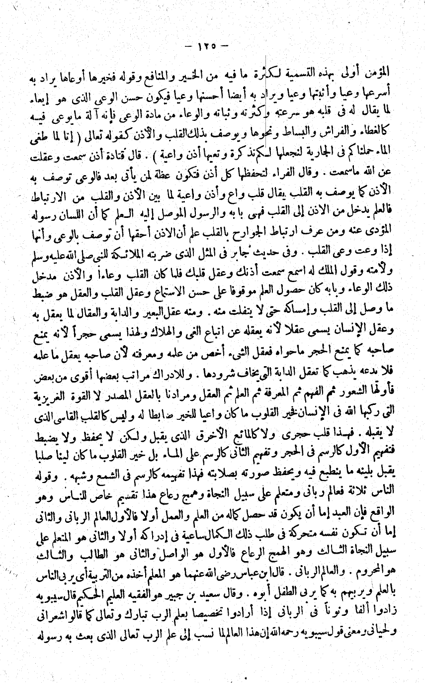 الْمُؤمن اولى بِهَذِهِ التَّسْمِيَة لِكَثْرَة مَا فِيهِ من الْخَيْر وَالْمَنَافِع وَقَوله فَخَيرهَا اوعاها يُرَاد بِهِ اسرعها وعيا واثبتها وعيا وَيُرَاد بِهِ ايضا احسنها وعيا فَيكون حسن الوعي الَّذِي هُوَ إيعاء لما يُقَال لَهُ فِي قلبه هُوَ سرعته وكثرته وثباته والوعاء من مَادَّة الوعي فَإِنَّهُ آلَة مَا يوعى فِيهِ كالغطاء والفراش والبساط وَنَحْوهَا ويوصف بذلك الْقلب والاذن كَقَوْلِه تَعَالَى إِنَّا لما طَغى المَاء حَمَلْنَاكُمْ فِي الْجَارِيَة لنجعلها لكم تذكرة وَتَعيهَا اذن وَاعِيَة قَالَ قَتَادَة اذن سَمِعت وعقلت عَن الله مَا سَمِعت وَقَالَ الْفراء لتحفظها كل اذن فَتكون عظة لمن يَأْتِي بعد فالوعي تُوصَف بِهِ الاذن كَمَا يُوصف بِهِ الْقلب يُقَال قلب واع وَأذن وَاعِيَة لما بَين الاذن وَالْقلب من الارتباط فالعلم يدْخل من الاذن الى الْقلب فَهِيَ بَابه وَالرَّسُول الْموصل اليه الْعلم كَمَا ان اللِّسَان رَسُوله الْمُؤَدى عَنهُ وَمن عرف ارتباط الْجَوَارِح بِالْقَلْبِ علم ان الاذن احقها ان تُوصَف بالوعي وانها إِذا وعت وعي الْقلب وَفِي حَدِيث جَابر فِي الْمثل الَّذِي ضَربته الْمَلَائِكَة للنَّبِي ولأمته وَقَول الْملك لَهُ اسْمَع سَمِعت اذنك وعقل قَلْبك فَلَمَّا كَانَ الْقلب وعاءا والاذن مدْخل ذَلِك الْوِعَاء وبابه كَانَ حُصُول الْعلم مَوْقُوفا على حسن الِاسْتِمَاع وعقل الْقلب وَالْعقل هُوَ ضبط مَا وصل الى الْقلب وإمساكه حَتَّى لايتفلت مِنْهُ وَمِنْه عقل الْبَعِير وَالدَّابَّة والعقال لما يعقل بِهِ وعقل الانسان يُسمى عقلا لانه يعقله عَن اتِّبَاع الغي والهلاك وَلِهَذَا يُسمى حجرا لانه يمْنَع صَاحبه كَمَا يمْنَع الْحجر مَا حواه فعقل الشَّيْء اخص من علمه ومعرفته لَان صَاحبه يعقل مَا علمه فَلَا يَدعه يذهب كَمَا تعقل الدَّابَّة الَّتِي يخَاف شرودها وللادراك مَرَاتِب بَعْضهَا اقوى من بعض فاولها الشُّعُور ثمَّ الْفَهم ثمَّ الْمعرفَة ثمَّ الْعلم ثمَّ الْعقل ومرادنا بِالْعقلِ الْمصدر لَا الْقُوَّة الغريزية الَّتِي ركبهَا الله فِي الانسان فَخير الْقُلُوب مَا كَانَ واعيا للخير ضابطا لَهُ وَلَيْسَ كالقلب القاسي الَّذِي لايقبله فَهَذَا قلب حجري وَلَا كالمائع الاخرق الَّذِي يقبل وَلَكِن لَا يحفظ وَلَا يضْبط فتفهيم الاول كالرسم فِي الْحجر وتفهيم الثَّانِي كالرسم على المَاء بل خير الْقُلُوب مَا كَانَ لينًا صلبا يقبل بلينه مَا ينطبع فِيهِ ويحفظ صورته بصلابته فَهَذَا تفهيمه كالرسم فِي الشمع وَشبهه وَقَوله النَّاس ثَلَاثَة فعالم رباني ومتعلم على سَبِيل النجَاة همج رعاع هَذَا تَقْسِيم خَاص للنَّاس وَهُوَ الْوَاقِع فَإِن العَبْد إِمَّا ان يكون قد حصل كَمَاله من الْعلم وَالْعَمَل اولا فالاول الْعَالم الرباني وَالثَّانِي اما ان تكون نَفسه متحركة فِي طلب ذَلِك الْكَمَال ساعية فِي إِدْرَاكه اولا وَالثَّانِي هُوَ المتعلم على سَبِيل النجَاة الثَّالِث وَهُوَ الهمج الرعاج فالاول هُوَ الْوَاصِل وَالثَّانِي هُوَ الطَّالِب وَالثَّالِث هُوَ المحروم والعالم الرباني قَالَ ابْن عَبَّاس رضى الله عَنْهُمَا هُوَ الْمعلم اخذه من التربية أَي يربى النَّاس بِالْعلمِ ويربيهم بِهِ كَمَا يربى الطِّفْل ابوه وَقَالَ سعيد بن جُبَير هُوَ الْفَقِيه الْعَلِيم الْحَكِيم قَالَ سِيبَوَيْهٍ زادوا الْفَا ونونا فِي الرباني إِذا ارادوا تَخْصِيصًا بِعلم الرب تبَارك وَتَعَالَى كَمَا قَالُوا أشعر اني ولحياني ومعني قَول سِيبَوَيْهٍ رَحمَه الله ان هَذَا الْعَالم لما نسب الى علم الرب تَعَالَى الَّذِي بعث بِهِ رَسُوله
