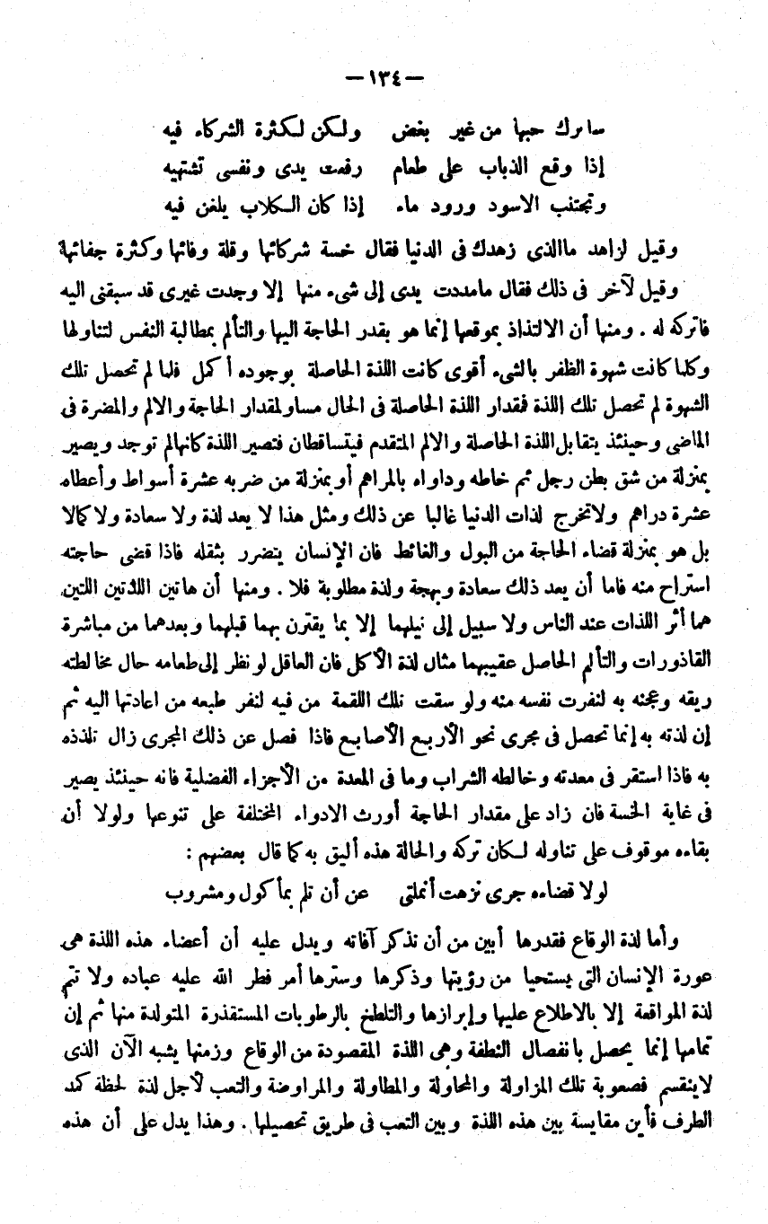 لَوْلَا قَضَاءَهُ جرى نزهت انملتي ... عَن ان تلم بمأكول ومشروب وَأما لَذَّة الوقاع قدرهَا ابين من ان نذْكر آفاته وَيدل عَلَيْهِ ان اعضاء هَذِه اللَّذَّة هِيَ عَورَة الانسان الَّتِي يستحيا من رؤيتها وَذكرهَا وسترها امْر فطر الله عَلَيْهِ عباده وَلَا تتمّ لَذَّة المواقعة الا بالاطلاع عَلَيْهَا وإبرازها والتلطخ بالرطوبات المستقذرة المتولدة مِنْهَا ثمَّ إِن تَمامهَا إِنَّمَا يحصل بانفصال النُّطْفَة وَهِي اللَّذَّة الْمَقْصُودَة من الوقاع وزمنها يشبه الان الَّذِي لَا يَنْقَسِم فصعوبة تِلْكَ المزاولة والمحاولة والمطاولة والمراوضة والتعب لاجل لَذَّة لَحْظَة كمد الطّرف فَأَيْنَ مقايسة بَين هَذِه اللَّذَّة وَبَين التَّعَب فِي طَرِيق تَحْصِيلهَا وَهَذَا يدل على ان هَذِه