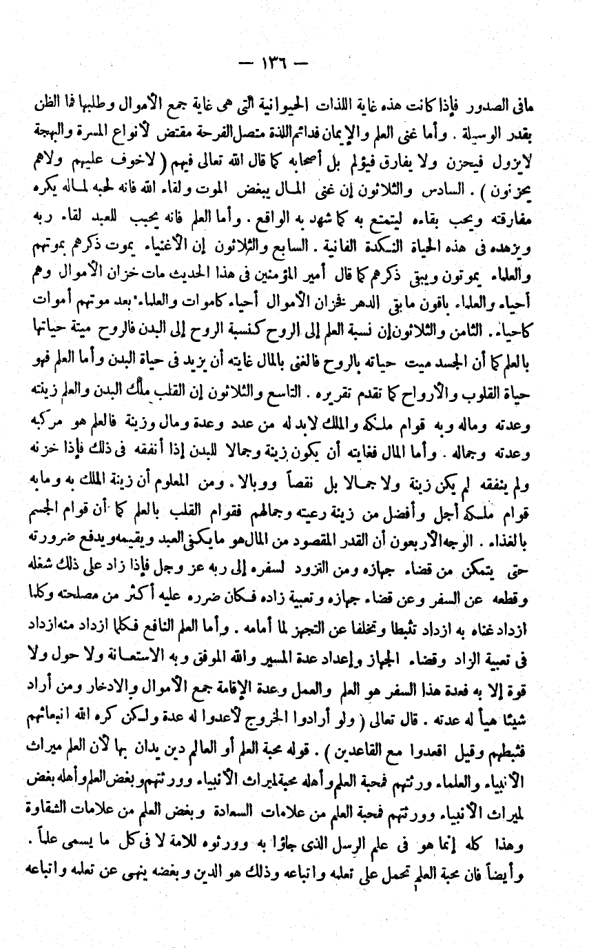 مَا فِي الصُّدُور فَإِذا كَانَت هَذِه غَايَة اللَّذَّات الحيوانية الَّتِي هِيَ غَايَة جمع الاموال وطلبها فَمَا الظَّن بِقدر الْوَسِيلَة وَأما غنى الْعلم والايمان فدائم اللَّذَّة مُتَّصِل الفرحة مُقْتَض لانواع المسرة والبهجة لايزول فيحزن وَلَا يُفَارق فيؤلم بل اصحابه كَمَا قَالَ الله تَعَالَى فيهم {لَا خوف عَلَيْهِم وَلَا هم يَحْزَنُونَ} السَّادِس وَالثَّلَاثُونَ ان غنى المَال يبغض الْمَوْت ولقاء الله فَإِنَّهُ لحبه لمَاله يكره مُفَارقَته وَيُحب بَقَاءَهُ ليتمتع بِهِ كَمَا شهد بِهِ الْوَاقِع وَأما الْعلم فَإِنَّهُ يحبب للْعَبد لِقَاء ربه ويزهده فِي هَذِه الْحَيَاة النكدة الفانية السَّابِع وَالثَّلَاثُونَ ان الاغنياء يَمُوت ذكرهم بموتهم وَالْعُلَمَاء يموتون وَيبقى ذكرهم كَمَا قَالَ امير الْمُؤمنِينَ فِي هَذَا الحَدِيث مَاتَ خزان الاموال وهم احياء وَالْعُلَمَاء باقون مَا بَقِي الدَّهْر فخزان الاموال احياء كاموات وَالْعُلَمَاء بعدموتهم اموات كأيحاء الثَّامِن وَالثَّلَاثُونَ ان نِسْبَة الْعلم الى الرّوح كنسبة الرّوح الى الْبدن فالروح ميتَة حَيَاتهَا بِالْعلمِ كَمَا ان الْجَسَد ميت حَيَاته بِالروحِ فالغني بِالْمَالِ غَايَته ان يزِيد فِي حَيَاة الْبدن واما الْعلم فَهُوَ حَيَاة الْقُلُوب والارواح كَمَا تقدم تَقْرِيره التَّاسِع وَالثَّلَاثُونَ ان الْقلب ملك الْبدن وَالْعلم زينته وعدته وَمَاله وَبِه قوام ملكه وَالْملك لَا بُد لَهُ من عدد وعدة وَمَال وزينة فالعلم هُوَ مركبه وعدته وجماله واما المَال فغايته ان يكون زِينَة وجمالا للبدن إِذا انفقه فِي ذَلِك فَإِذا خزنه وَلم يُنْفِقهُ لم يكن زِينَة وَلَا جمالا بل نقصا ووبالا وَمن الْمَعْلُوم ان زِينَة الْملك بِهِ وَمَا بِهِ قوام ملكه اجل وافضل من زِينَة رَعيته وجمالهم فقوام الْقلب بِالْعلمِ كَمَا ان قوام الْجِسْم بالغذاء الْوَجْه الاربعون ان الْقدر الْمَقْصُود من المَال هُوَ مَا يَكْفِي العَبْد ويقيمه وَيدْفَع ضَرُورَته حَتَّى يتَمَكَّن من قَضَاء جهازه وَمن التَّزَوُّج لسفره الى ربه عزوجل فَإِذا زادعلى ذَلِك شغله وقطعه عَن السّفر وَعَن قَضَاء جهازه وتعبية زَاده فَكَانَ ضَرَره عَلَيْهِ أَكثر من مصْلحَته وَكلما ازاداد غناهُ بِهِ ازْدَادَ تثبطا وتخلفا عَن التجهز لما امامه وَأما الْعلم النافع فَكلما ازْدَادَ مِنْهُ ازْدَادَ فِي تعبية الزَّاد وَقَضَاء الجهاز واعداد عدَّة الْمسير وَالله الْمُوفق وَبِه الِاسْتِعَانَة وَلَا حول وَلَا قُوَّة الا بِهِ فَعدَّة هَذَا السّفر هُوَ الْعلم وَالْعَمَل وعدة الاقامة جمع الاموال والادخار وَمن اراد شَيْئا هيأ لَهُ عدته قَالَ تَعَالَى {وَلَو أَرَادوا الْخُرُوج لأعدوا لَهُ عدَّة وَلَكِن كره الله انبعاثهم فَثَبَّطَهُمْ وَقيل اقعدوا مَعَ القاعدين} قَوْله محبَّة الْعلم اَوْ الْعَالم دين يدان بهَا لَان الْعلم مِيرَاث الانبياء وَالْعُلَمَاء ورثتهم فمحبة الْعلم واهله محبَّة لميراث الانبياء وورثتهم وبغض الْعلم وَأَهله بغض لميراث الانبياء وورثتهم فمحبة الْعلم من عَلَامَات السَّعَادَة وبغض الْعلم من عَلَامَات الشقاوة وَهَذَا كُله إِنَّمَا هُوَ فِي علم الرُّسُل الَّذِي جاؤا بِهِ وورثوه للامة لَا فِي كل مَا يُسمى علما وايضا فَإِن محبَّة الْعلم تحمل على تعلمه واتباعه وَذَلِكَ هُوَ الدّين وبغضه ينْهَى عَن تعلمه واتباعه