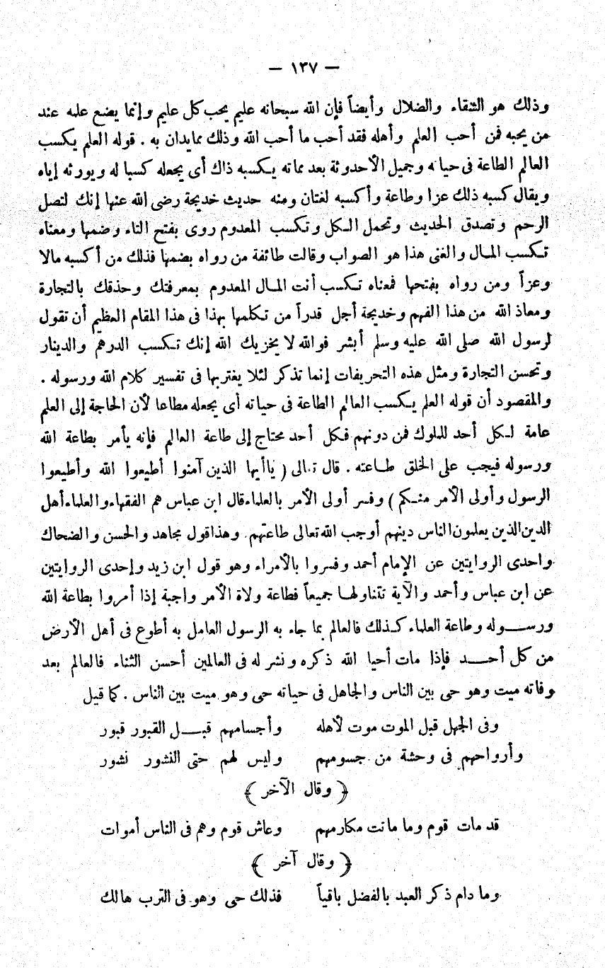 وَذَلِكَ هُوَ الشَّقَاء والضلال وايضا فَإِن الله سُبْحَانَهُ عليم يحب كل عليم وَإِنَّمَا يضع علمه عِنْد من يُحِبهُ فَمن احب الْعلم واهله فقد احب مَا احب الله وَذَلِكَ مِمَّا يدان بِهِ قَوْله الْعلم يكْسب الْعَالم الطَّاعَة فِي حَيَاته وَجَمِيل الاحدوثة بعد مماته يكسبه ذَاك أَي يَجعله كسبا لَهُ ويورثه إِيَّاه وَيُقَال كَسبه ذَلِك عزا وَطَاعَة واكسبه لُغَتَانِ وَمِنْه حَدِيث خَدِيجَة رضى الله عَنْهَا إِنَّك لتصل الرَّحِم وَتصدق الحَدِيث وَتحمل الْكل وتكسب الْمَعْدُوم روى بِفَتْح التَّاء وَضمّهَا وَمَعْنَاهُ تكسب المَال والغنى هَذَا هُوَ اصواب وَقَالَت ائفة من رَوَاهُ بضَمهَا فَذَلِك من اكسبه مَالا وَعزا وَمن رَوَاهُ بِفَتْحِهَا فَمَعْنَاه تكسب انت المَال الْمَعْدُوم بمعرفتك وحذقك بِالتِّجَارَة ومعاذ الله من هَذَا الْفَهم وَخَدِيجَة اجل قدرا من تكلمها بِهَذَا فِي هَذَا الْمقَام الْعَظِيم ان تَقول لرَسُول الله اُبْشُرْ فوَاللَّه لَا يخزيك الله إِنَّك تكسب الدِّرْهَم وَالدِّينَار وتحسن التِّجَارَة وَمثل هَذِه التحريفات انما تذكر لِئَلَّا يغتربها فِي تَفْسِير كَلَام الله وَرَسُوله وَالْمَقْصُود ان قَوْله الْعلم يكْسب الْعَالم الطَّاعَة فِي حَيَاته أَي يَجعله مُطَاعًا لَان الْحَاجة الى الْعلم عَامَّة لكل اُحْدُ للملوك فَمن دونهم فَكل اُحْدُ مُحْتَاج إِلَى طَاعَة الْعَالم فَإِنَّهُ يامر بِطَاعَة الله وَرَسُوله فَيجب على الْخلق طَاعَته قَالَ تَعَالَى {يَا أَيهَا الَّذين آمنُوا أطِيعُوا الله وَأَطيعُوا الرَّسُول وأولي الْأَمر مِنْكُم} وَفسّر اولى الامر بالعلماء قَالَ ابْن عَبَّاس هم الْفُقَهَاء وَالْعُلَمَاء اهل الدّين الَّذين يعلمُونَ النَّاس دينهم اوجب الله تَعَالَى طاعتهم وَهَذَا قَول مُجَاهِد وَالْحسن وَالضَّحَّاك احدى الرِّوَايَتَيْنِ عَن الامام احْمَد وفسروا بالامراء وَهُوَ قَول ابْن زيد احدى الرِّوَايَتَيْنِ عَن ابْن عَبَّاس وَأحمد والاية تتناولها جَمِيعًا فطاعة وُلَاة الامر وَاجِبَة إِذا امروا بِطَاعَة الله وَرَسُوله وَطَاعَة الْعلمَاء كَذَلِك فالعالم بِمَا جَاءَ بِهِ الرَّسُول الْعَامِل بِهِ اطوع فِي اهل الارض من كل اُحْدُ فَإِذا مَاتَ احيا الله ذكره وَنشر لَهُ فِي الْعَالمين احسن الثَّنَاء فالعالم بعد وَفَاته ميت وَهُوَ حَيّ بَين النَّاس وَالْجَاهِل فِي حَيَاته حَيّ وَهُوَ ميت بَين النَّاس كَمَا قيل