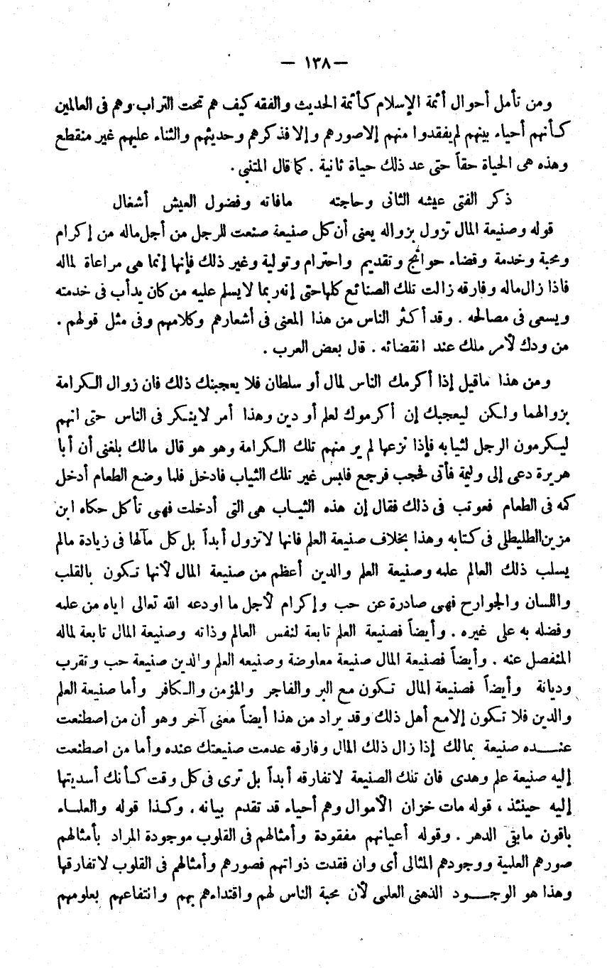 وَمن هَذَا مَا قيل إِذا اكرمك النَّاس لمَال اَوْ سُلْطَان فَلَا يعجبنك ذَلِك فَإِن زَوَال الْكَرَامَة يزوالهما وَلَكِن ليعجبك ان اكرموك لعلم اَوْ دين وَهَذَا امْر لَا يُنكر فِي النَّاس حَتَّى انهم ليكرمون الرجل لثيابه فَإِذا نَزعهَا لم ير مِنْهُم تِلْكَ الْكَرَامَة وَهُوَ هُوَ قَالَ مَالك بَلغنِي ان أَبَا هُرَيْرَة دعى الى وَلِيمَة فَأتى فحجب فَرجع فَلبس غير تِلْكَ الثِّيَاب فَادْخُلْ فَلَمَّا وضع الطَّعَام ادخل كمه فِي الطَّعَام فعوتب فِي ذَلِك فَقَالَ إِن هَذِه الثباب هِيَ الَّتِي ادخلت فَهِيَ تَأْكُل حَكَاهُ ابْن مزين الطليطلي فِي كِتَابه وَهَذَا بِخِلَاف صَنِيعَة الْعلم فانها لَا تَزُول ابدا بل كل مآلها فِي زِيَادَة مالم يسلب ذَلِك الْعَالم علمه وضيعه الْعلم وَالدّين اعظم من صَنِيعَة المَال لانها تكون بِالْقَلْبِ وَاللِّسَان والجوارح فَهِيَ صادرة عَن حب وإكرام لاجل مَا أودعهُ الله تَعَالَى أَيَّاهُ من علمه وفضله بِهِ على غَيره وايضا فصنيعة الْعلم تَابِعَة لنَفس الْعَالم وذاته وصنيعة المَال تَابِعَة لمَاله الْمُنْفَصِل عَنهُ وايضا فصنيعة المَال صَنِيعَة مُعَاوضَة وصنيعه الْعلم وَالدّين صَنِيعَة حب وتقرب وديانة وايضا فصنيعه المَال تكون مَعَ الْبر والفاجر وَالْمُؤمن وَالْكَافِر واما صَنِيعَة الْعلم وَالدّين فَلَا تكون الا مَعَ اهل ذَلِك وَقد يُرَاد من هَذَا ايضا معنى آخر وَهُوَ ان من اصطنعت عِنْده صَنِيعَة بِمَالك إِذا زَالَ ذَلِك المَال وفارقه عدمت صنيعتك عِنْده واما من اصطنعت اليه صَنِيعَة علم وَهدى فَإِن تِلْكَ الصنيعة لَا تُفَارِقهُ ابدا بل ترى فِي كل وَقت كَأَنَّك اسديتها اليه حِينَئِذٍ قَوْله مَاتَ خزان الاموال وهم احياء تقدم بَيَانه وَكَذَا قَوْله وَالْعُلَمَاء باقون مَا بَقِي الدَّهْر وَقَوله اعيانهم مفقودة وامثالهم فِي الْقُلُوب مَوْجُودَة المُرَاد بامثالهم صورهم العلمية ووجودهم المثالي أَي وان فقدت ذواتهم فصورهم وامثالهم فِي الْقُلُوب لَا تفارقها وَهَذَا هُوَ الْوُجُود الذهْنِي العلمي لَان محبَّة النَّاس لَهُم واقتداءهم بهم وانتفاعهم بعلومهم