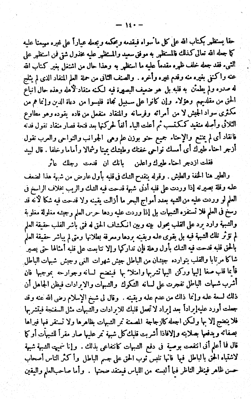 فَقلت ازدجر احناء طيرك واعلمن ... بانك ان قدمت رجلك عاثر وَالطير هُنَا الخفة والطيش وَقَوله ينقدح الشَّك فِي قلبه بِأول عَارض من شُبْهَة هَذَا لضعف علمه وَقلة بصيرته إِذا وَردت على قلبه ادنى شُبْهَة قدحت فِيهِ الشَّك والريب بِخِلَاف الراسخ فِي الْعلم لَو وَردت عَلَيْهِ من الشّبَه بِعَدَد امواج الْبَحْر مَا ازالت يقينه وَلَا قدحت فِيهِ شكا لانه قد رسخ فِي الْعلم فَلَا تستفزه الشُّبُهَات بل إِذا وَردت عَلَيْهِ ردهَا حرس الْعلم وجيشه مغلولة مغلوبة والشبهة وَارِد يرد على الْقلب يحول بَينه وَبَين انكشاف الْحق لَهُ فَمَتَى بَاشر الْقلب حَقِيقَة الْعلم لم تُؤثر تِلْكَ الشُّبْهَة فِيهِ بل يقوى علمه ويقينه بردهَا وَمَعْرِفَة بُطْلَانهَا وَمَتى لم يُبَاشر حَقِيقَة الْعلم بِالْحَقِّ قلبه قدحت فِيهِ الشَّك بِأول وهلة فان تداركها والا تَتَابَعَت على قلبه امثالها حَتَّى يصير شاكا مُرْتَابا وَالْقلب يتوارده جيشان من الْبَاطِل جَيش شهوات الغي وجيش شُبُهَات الْبَاطِل فأيما قلب صغا اليها وركن اليها تشربها وامتلأ بهَا فينضح لِسَانه وجوارحه بموجبها فَإِن اشرب شُبُهَات الْبَاطِل تَفَجَّرَتْ على لِسَانه الشكوك والشبهات والايرادات فيظن الْجَاهِل ان ذَلِك لسعة علمه وَإِنَّمَا ذَلِك من عدم علمه ويقينه وَقَالَ لي شيخ الاسلام رضى الله عَنهُ وَقد جعلت اورد عَلَيْهِ غيرادا بعد إِيرَاد لات جعل قَلْبك للايرادات والشبهات مثل السفنجة فيتشربها فَلَا ينضح الا بهَا وَلَكِن اجْعَلْهُ كالزجاجة المصمتة تمر الشُّبُهَات بظاهرها وَلَا تَسْتَقِر فِيهَا فيراها بصفائه ويدفعها بصلابته وَإِلَّا فاذا اشربت قَلْبك كل شُبْهَة تمر عَلَيْهَا صَار مقرا للشبهات اَوْ كَمَا قَالَ فَمَا اعْلَم اني انتفعت بِوَصِيَّة فِي دفع الشُّبُهَات كانتفاعي بذلك وَإِنَّا سميت الشُّبْهَة شُبْهَة لاشتباه الْحق بِالْبَاطِلِ فِيهَا فانها تلبس ثوب الْحق على جسم الْبَاطِل وَأكْثر النَّاس اصحاب حسن ظَاهر فَينْظر النَّاظر فِيمَا البسته من اللبَاس فيعتقد صِحَّتهَا واما صَاحب الْعلم وَالْيَقِين