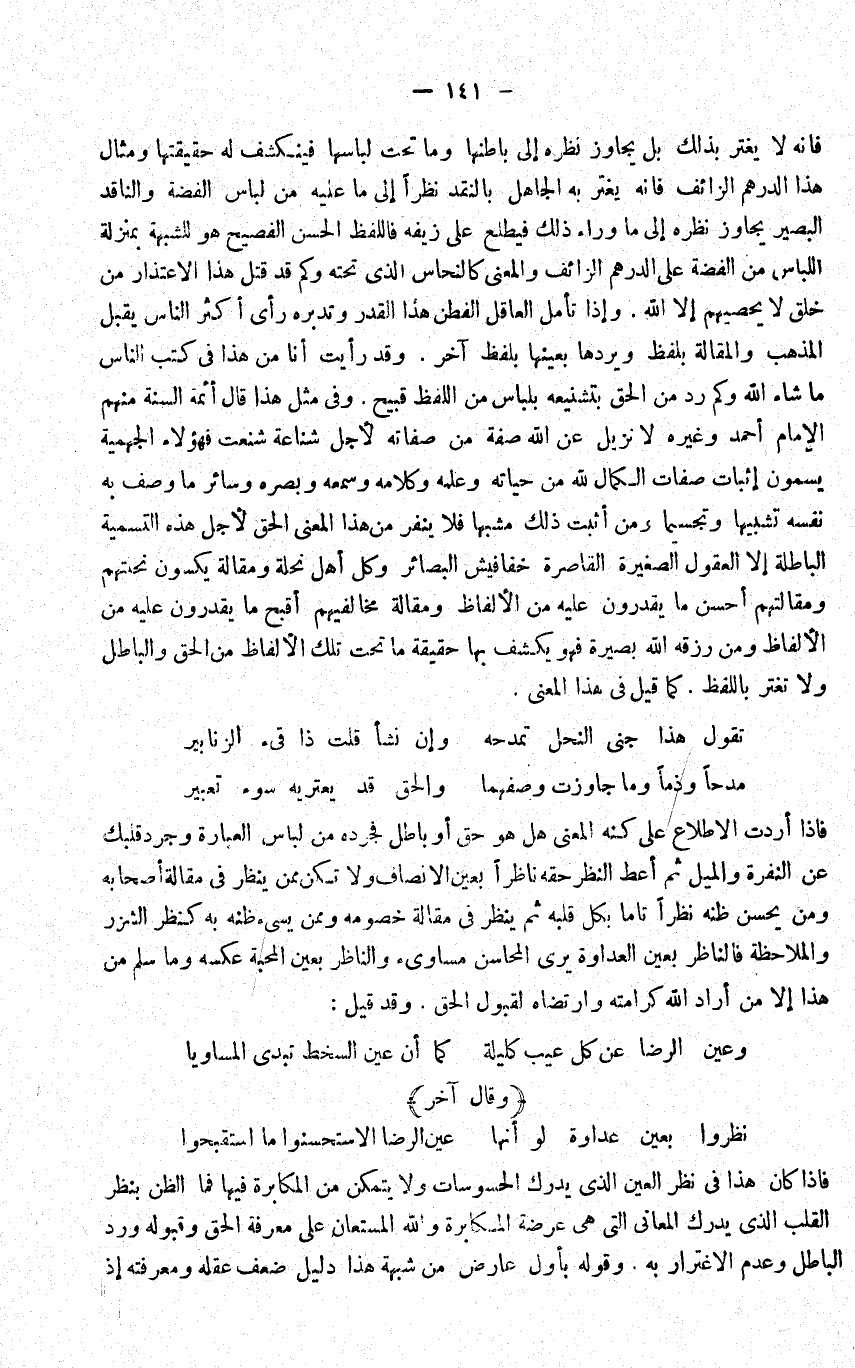 نظرُوا بِعَين عَدَاوَة لَو انها ... عين الرِّضَا الاستحسنوا مَا استقبحوا فَإِذا كَانَ هَذَا فِي نظر الْعين الَّذِي يدْرك الحسوسات وَلَا يتَمَكَّن من المكابرة فِيهَا فَمَا الظَّن بِنَظَر الْقلب الَّذِي يدْرك الْمعَانِي الَّتِي هِيَ عرضة المكابرة وَالله الْمُسْتَعَان على معرفَة الْحق وقبوله ورد الْبَاطِل وَعدم الاغترار بِهِ وَقَوله بِأول عَارض من شُبْهَة هَذَا دَلِيل ضعف عقله ومعرفته اذ