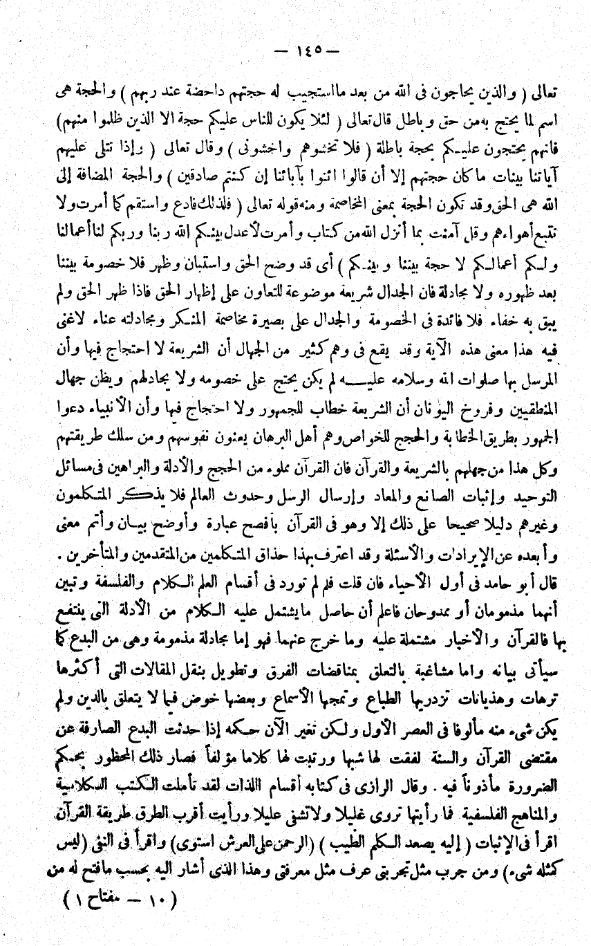 تَعَالَى {وَالَّذين يحاجون فِي الله من بعد مَا اسْتُجِيبَ لَهُ حجتهم داحضة عِنْد رَبهم} وَالْحجّة هِيَ اسْم لما يحْتَج بِهِ من حق وباطل قَالَ تَعَالَى لِئَلَّا يكون للنَّاس علكيم حجَّة الا الَّذين ظلمُوا مِنْهُم فانهم يحتجون عَلَيْكُم بِحجَّة بَاطِلَة {فَلَا تخشوهم واخشوني} وَقَالَ تَعَالَى {وَإِذا تتلى عَلَيْهِم آيَاتنَا بَيِّنَات مَا كَانَ حجتهم إِلَّا أَن قَالُوا ائْتُوا بِآبَائِنَا إِن كُنْتُم صَادِقين} وَالْحجّة المضافة الى الله هِيَ الْحق وَقد تكون الْحجَّة بِمَعْنى الْمُخَاصمَة وَمِنْه قَوْله تَعَالَى {فَلذَلِك فَادع واستقم كَمَا أمرت وَلَا تتبع أهواءهم وَقل آمَنت بِمَا أنزل الله من كتاب وَأمرت لأعدل بَيْنكُم الله رَبنَا وربكم لنا أَعمالنَا وَلكم أَعمالكُم لَا حجَّة بَيْننَا وَبَيْنكُم} أَي قد وضح الْحق واستبان وَظهر فَلَا خُصُومَة بَيْننَا بعد ظُهُوره وَلَا مجادلة فان الْجِدَال شَرِيعَة مَوْضُوعَة للتعاون على إِظْهَار الْحق فَإِذا ظهر الْحق وَلم يبْق بِهِ خَفَاء فَلَا فَائِدَة فِي الْخُصُومَة والجدال على بَصِيرَة مخاصمة الْمُنكر ومجادلته عناء لَا غنى فِيهِ هَذَا معنى هَذِه الاية وَقد يَقع فِي وهم كثير من الْجُهَّال ان الشَّرِيعَة لَا احتجاج فِيهَا وان الْمُرْسل بهَا صلوَات الله وَسَلَامه عَلَيْهِ لم يكن يحْتَج على خصومه وَلَا يجادلهم ويظن جهال المنطقيين وفروخ اليونان ان الشَّرِيعَة خطاب لِلْجُمْهُورِ وَلَا احتجاج يها فيوان الانبياء دعوا الْجُمْهُور بطرِيق الخطابة والحجج للخواص وهم اهل الْبُرْهَان يعنون نُفُوسهم وَمن سلك طريقتهم وكل هَذَا من جهلهم بالشريعة وَالْقُرْآن فَإِن الْقُرْآن مَمْلُوء من الْحجَج والادلة والبراهين فِي مسَائِل التَّوْحِيد واثبات الصَّانِع والمعاد وإرسال الرُّسُل وحدوث الْعَالم فَلَا يذكر المتكلمون وَغَيرهم دَلِيلا صَحِيحا على ذَلِك الا وَهُوَ فِي الْقُرْآن بافصح عبارَة واوضح بَيَان وَأتم معنى وابعده عَن الايرادات والاسئلة وَقد اعْترف بِهَذَا حذاق الْمُتَكَلِّمين من الْمُتَقَدِّمين والمتأخرين قَالَ ابو حَامِد فِي اول الاحياء فَإِن قلت فَلم لم تورد فِي اقسام الْعلم الْكَلَام والفلسفة وَتبين انهما مذمومان اَوْ ممدوحان فَاعْلَم ان حَاصِل مَا يشْتَمل عَلَيْهِ الْكَلَام من الادلة الَّتِي ينْتَفع بهَا فالقرآن والاخبار مُشْتَمِلَة عَلَيْهِ وَمَا خرج عَنْهُمَا فَهُوَ إِمَّا مجادلة مذمومة وَهِي من الْبدع كَمَا سَيَأْتِي بَيَانه واما مشاغبة بالتعلق بمناقضات الْفرق وَتَطْوِيل بِنَقْل المقالات الَّتِي اكثرها ترهات وَهَذَا يانات تزدريها الطباع وتمجها الاسماع وَبَعضهَا خوض فِيمَا لَا يتَعَلَّق بِالدّينِ وَلم يكن شَيْء مِنْهُ مألوفا فِي الْعَصْر الاول وَلَكِن تغير الان حكمه إِذا حدثت الْبدع الصارفة عَن مُقْتَضى الْقُرْآن وَالسّنة لفقت لَهَا شبها ورتبت لَهَا كلَاما مؤلفا فَصَارَ ذَلِك الْمَحْظُور بِحكم الضَّرُورَة مَأْذُونا فِيهِ وَقَالَ الرَّازِيّ فِي كِتَابه اقسام اللَّذَّات لقد تَأَمَّلت الْكتب الكلامية والمناهج الفلسفية فَمَا رَأَيْتهَا تروي غليلا وَلَا تشفى عليلا ورايت اقْربْ الطّرق طَريقَة الْقُرْآن اقرا فِي الاثبات اليه يصعدالكلم الطّيب {الرَّحْمَن على الْعَرْش اسْتَوَى} واقرا فِي النَّفْي {لَيْسَ كمثله شَيْء} وَمن جرب مثل تجربتي عرف مثل معرفتي وَهَذَا الَّذِي اشار اليه بِحَسب مافتح لَهُ من