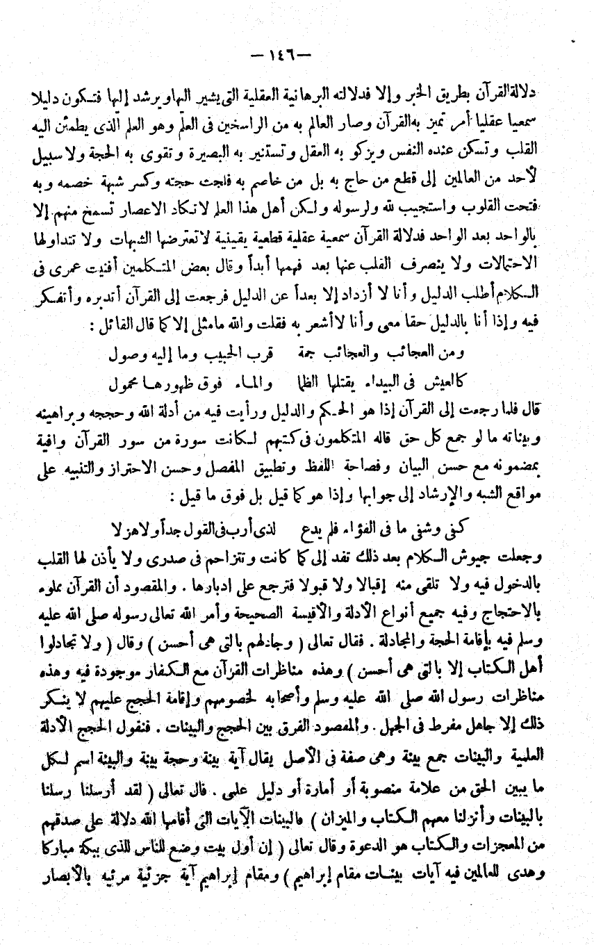 وَمن الْعَجَائِب والعجائب جمة ... قرب الحبيب وَمَا اليه وُصُول كالعيش فِي الْبَيْدَاء يَقْتُلهَا الظما ... ولاماء فَوق ظُهُورهَا مَحْمُول ... قَالَ فَلَمَّا رجعت الى الْقُرْآن إِذا هُوَ الحكم وَالدَّلِيل وَرَأَيْت فِيهِ من ادلة الله وحججه وبراهينه وبيناته مَا لَو جمع كل حق قَالَه المتكلمون فِي كتبهمْ لكَانَتْ سُورَة من سور الْقُرْآن وافية بمضمونه مَعَ حسن الْبَيَان وفصاحة اللَّفْظ وتطبيق الْمفصل وَحسن الِاحْتِرَاز والتنبيه على مواقع الشّبَه والارشاد الى جوابها وَإِذا هُوَ كَمَا قيل بل فَوق مَا قيل: