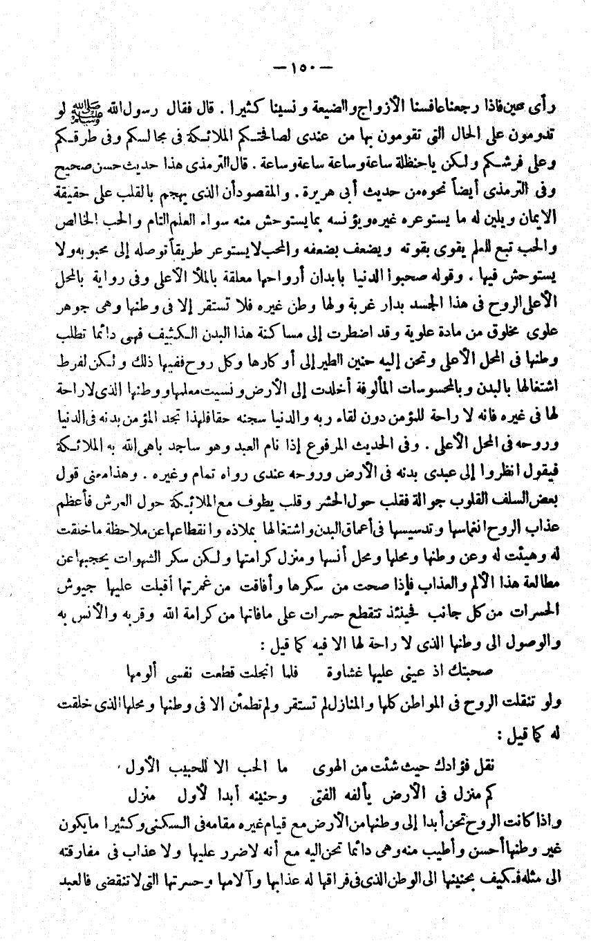 نقل فُؤَادك حَيْثُ شِئْت من الْهوى ... مَا الْحبّ الا للحبيب الاول كم منزل فِي الارض يألفه الْفَتى ... وحنينه ابدا لاول منزل وَإِذا كَانَت الرّوح تحن ابدا الى وطنها من الارض مَعَ قيام غَيره مقَامه فِي السُّكْنَى وَكَثِيرًا مَا يكون غير وطنها احسن واطيب مِنْهُ وَهِي دَائِما تحن اليه مَعَ انه لَا ضَرَر عَلَيْهَا وَلَا عَذَاب فِي مُفَارقَته الى مثله فَكيف بحنينها الى الوطن الَّذِي فِي فراقها لَهُ عَذَابهَا وآلامها وحسرتها الَّتِي لاتنقضي فَالْعَبْد