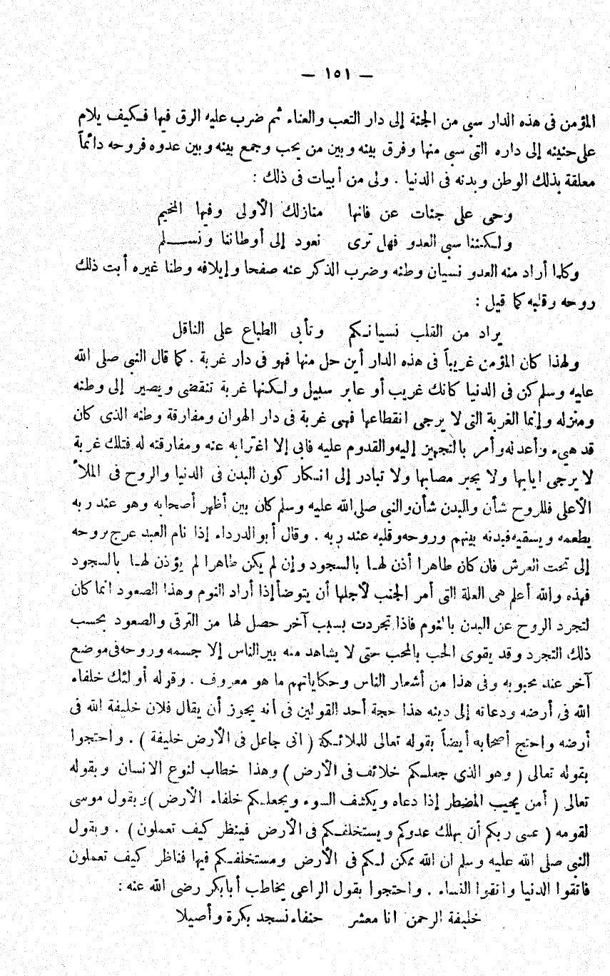 يُرَاد من الْقلب نسيانكم ... وتأبى الطباع على النَّاقِل وَلِهَذَا كَانَ الْمُؤمن غَرِيبا فِي هَذِه الدَّار ايْنَ حل مِنْهَا فَهُوَ فِي دَار غربَة كَمَا قَالَ النَّبِي كن فِي الدُّنْيَا كانك غَرِيب اَوْ عَابِر سَبِيل وَلكنهَا غربَة تنقضى وَيصير الى وَطنه ومنزله وانما الغربة الَّتِي لَا يُرْجَى انقطاعها فَهِيَ غربَة فِي دَار الهوان ومفارقة وَطنه الَّذِي كَانَ قد هيء وَاعد لَهُ وامر بالتجهيز اليه والقدوم عَلَيْهِ فابى الا اغترابه عَنهُ ومفارقته لَهُ فَتلك غربَة لَا يُرْجَى ايابها وَلَا يجْبر مصابها وَلَا تبادر الى انكار كَون الْبدن فِي الدُّنْيَا وَالروح فِي الْمَلأ الاعلى فللروح شَأْن وَالْبدن شَأْن وَالنَّبِيّ كَانَ بَين اظهر اصحابه وَهُوَ عِنْد ربه يطعمهُ ويسقيه فبدنه بَينهم وروحه وَقَلبه عِنْد ربه وَقَالَ ابو الدَّرْدَاء اذا نَام العبدعرج بِرُوحِهِ الى تَحت الْعَرْش فان كَانَ طَاهِرا اذن لَهَا بِالسُّجُود وان لم يكن طَاهِرا لم يُؤذن لَهَا بِالسُّجُود فَهَذِهِ وَالله أعلم هِيَ الْعلَّة الَّتِي امْر الْجنب لاجلها ان يتَوَضَّأ إِذا أَرَادَ النّوم وَهَذَا الصعُود إِنَّمَا كَانَ لتجرد الرّوح عَن الْبدن بِالنَّوْمِ فَإِذا تجردت بِسَبَب آخر حصل لَهَا من الترقي والصعود بِحَسب ذَلِك التجرد وَقد يقوى الْحبّ بالمحب حَتَّى لَا يُشَاهد مِنْهُ بَين النَّاس الا جِسْمه وروحه فِي مَوضِع آخر عِنْد محبوبه وَفِي هَذَا من شاعار النَّاس وحكاياتهم مَا هُوَ مَعْرُوف وَقَوله اولئك خلفاء الله فِي ارضه ودعائه الى دينه هَذَا حجَّة اُحْدُ الْقَوْلَيْنِ فِي انه يجوز ان يُقَال فلَان خَليفَة الله فِي ارضه وَاحْتج اصحابه ايضا بقوله تَعَالَى للْمَلَائكَة إِنِّي جَاعل فِي الارض خَليفَة وَاحْتَجُّوا بقوله تَعَالَى وَهُوَ الَّذِي جعلكُمْ خلائف فِي الارض وَهَذَا خطاب لنَوْع الانسان وَبِقَوْلِهِ تَعَالَى امن يُجيب الْمُضْطَر اذا دَعَاهُ ويكشف السوء ويجعلكم خلفاء الارض وَبقول مُوسَى لِقَوْمِهِ عَسى ربكُم ان يهْلك عَدوكُمْ ويستخلفكم فِي الارض فَينْظر كَيفَ تَعْمَلُونَ وَيَقُول النَّبِي ان الله مُمكن لكم فِي الارض ومستخلفكم فِيهَا فناظر كَيفَ تَعْمَلُونَ فَاتَّقُوا الدُّنْيَا وَاتَّقوا النِّسَاء وَاحْتَجُّوا بقول الرَّاعِي يُخَاطب ابا بكر رَضِي الله عَنهُ: