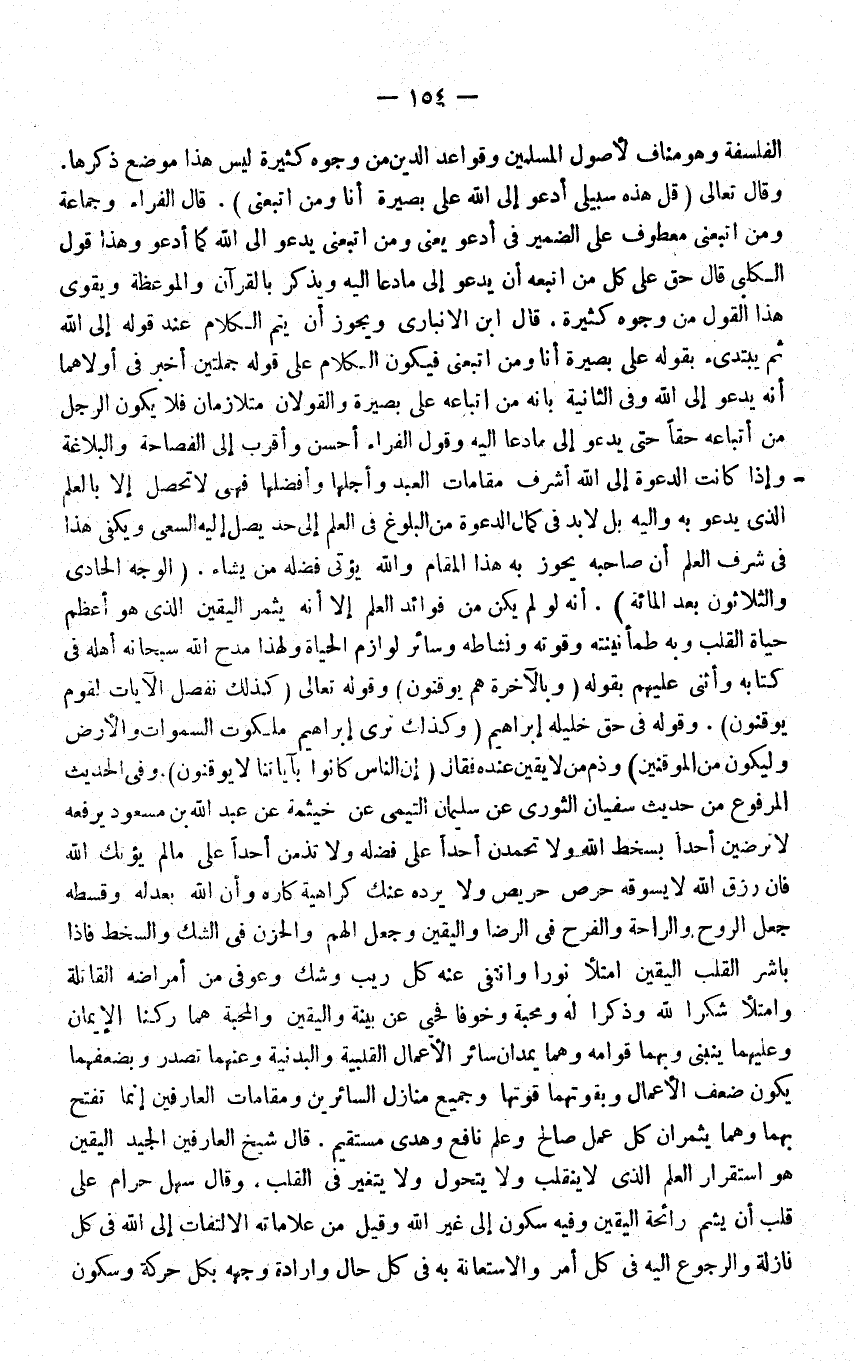 الفلسفة وَهُوَ منَاف لاصول الْمُسلمين وقواعدالدين من وُجُوه كَثِيرَة لَيْسَ هَذَا مَوضِع ذكرهَا وَقَالَ تَعَالَى {قل هَذِه سبيلي أَدْعُو إِلَى الله على بَصِيرَة أَنا وَمن اتبعني} قَالَ الْفراء وَجَمَاعَة وَمن اتبعني مَعْطُوف على الضَّمِير فِي ادعو يَعْنِي وَمن اتبعني يَدْعُو الى الله كَمَا ادعو وَهَذَا قَول الْكَلْبِيّ قَالَ حق على كل من اتبعهُ ان يَدْعُو الى مَا دَعَا اليه وَيذكر بِالْقُرْآنِ وَالْمَوْعِظَة ويقوى هَذَا القَوْل من وُجُوه كَثِيرَة قَالَ ابْن الانباري وَيجوز ان يتم الْكَلَام عِنْد قَوْله الى الله ثمَّ يبتديء بقوله على بَصِيرَة انا وَمن اتبعني فَيكون الْكَلَام على قَوْله جملتين اخبر فِي اولاهما انه يَدْعُو الى الله وَفِي الثَّانِيَة بانه من اتِّبَاعه على بَصِيرَة وَالْقَوْلَان متلازمان فَلَا يكون الرجل من اتِّبَاعه حَقًا حَتَّى يَدْعُو الى مَا دَعَا اليه وَقَول الْفراء احسن واقرب الى الفصاحة والبلاغة واذا كَانَت الدعْوَة الى الله اشرف مقامات العَبْد واجلها وافضلها فَهِيَ لَا تحصل الا بِالْعلمِ الَّذِي يَدْعُو بِهِ واليه بل لَا بُد فِي كَمَال الدعْوَة من الْبلُوغ فِي الْعلم الى حد يصل اليه السَّعْي وَيَكْفِي هَذَا فِي شرف الْعلم ان صَاحبه يحوز بِهِ هَذَا الْمقَام وَالله يُؤْتِي فَضله من يَشَاء الْوَجْه الْحَادِي وَالثَّلَاثُونَ بعدالمائة انه لَو لم يكن من فَوَائِد الْعلم الا انه يُثمر الْيَقِين الَّذِي هُوَ اعظم حَيَاة الْقلب وَبِه طمأنينه وقوته ونشاطه وَسَائِر لَوَازِم الْحَيَاة وَلِهَذَا مدح الله سُبْحَانَهُ اهله فِي كِتَابه واثنى عَلَيْهِم بقوله {وبالآخرة هم يوقنون} وَقَوله تَعَالَى كَذَلِك نفصل الايات لقوم يوقنون وَقَوله فِي حق خَلِيله إِبْرَاهِيم وَكَذَلِكَ نرى إِبْرَاهِيم ملكوت السَّمَوَات والارض وليكون من الموقنين وذم من لَا يَقِين عِنْده فَقَالَ {أَن النَّاس كَانُوا بِآيَاتِنَا لَا يوقنون} وَفِي الحَدِيث الْمَرْفُوع من حَدِيث سُفْيَان الثَّوْريّ عَن سُلَيْمَان التَّيْمِيّ عَن خَيْثَمَة عَن عبد الله بن مسعوديرفعه لَا ترْضينَ احدا بسخط الله وَلَا تحمدن احدا على فَضله وَلَا تذمن احدا على مَا لم يؤتك الله فَإِن رزق الله لَا يَسُوقهُ حرص حَرِيص وَلَا يردة عَنْك كَرَاهِيَة كَارِه وان الله بعدله وقسطه جعل الرّوح والراحة والفرح فِي الرِّضَا وَالْيَقِين وَجعل الْهم والحزن فِي الشَّك والسخط فَإِذا بَاشر الْقلب الْيَقِين امْتَلَأَ نورا وانتفى عَنهُ كل ريب وَشك وعوفي من امراضه القاتلة وامتلأ شكرا لله وذكرا لَهُ ومحبة وخوفا فحبي عَن بَيِّنَة وَالْيَقِين والمحبة هما ركنا الايمان وَعَلَيْهِمَا يَنْبَنِي وَبِهِمَا قوامه وهما يمدان سَائِر الاعمال القلبية والبدنية وعنهما تصدر وبضعفهما يكون ضعف الاعمال وبقوتهما قوتها وَجَمِيع منَازِل السائرين ومقامات العارفين إِنَّمَا تفتح بهما وهما يثمران كل عمل صَالح وَعلم نَافِع وَهدى مُسْتَقِيم قَالَ شيخ العارفين الْجيد الْيَقِين هُوَ اسْتِقْرَار الْعلم الَّذِي لاينقلب وَلَا يتَحَوَّل وَلَا يتَغَيَّر فِي الْقلب وَقَالَ سهل حرَام على قلب ان يشم رَائِحَة الْيَقِين وَفِيه سُكُون الى غير الله وَقيل من علاماته الِالْتِفَات الى الله فِي كل زلَّة وَالرُّجُوع اليه فِي كل امْر والاستعانة بِهِ فِي كل حَال وارادة وَجهه بِكُل حَرَكَة وَيكون