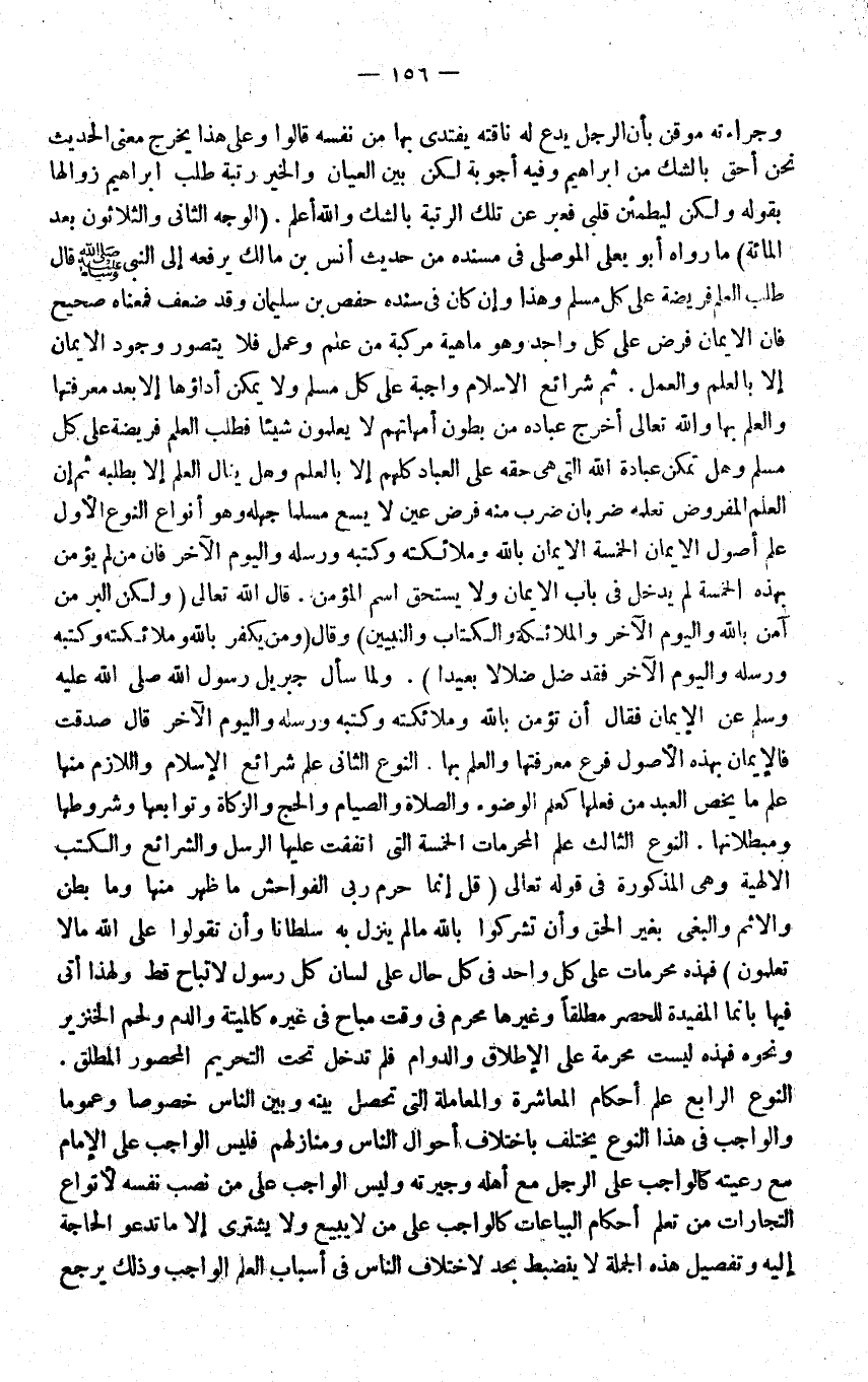 وجراءته موقن بَان الرجل يدع لَهُ نَاقَته يفتدى بهَا من نَفسه قَالُوا وعَلى هَذَا يخرج معنى الحَدِيث نَحن احق بِالشَّكِّ من إِبْرَاهِيم وَفِيه اجوبة لَكِن بَين العيان وَالْخَيْر رُتْبَة طلب إِبْرَاهِيم زَوَالهَا بقوله وَلَكِن لِيَطمَئِن قلبِي فعبرعن تِلْكَ الرُّتْبَة بِالشَّكِّ وَالله اعْلَم الْوَجْه الثَّانِي وَالثَّلَاثُونَ بعد الْمِائَة مَا رَوَاهُ ابو يعلى الْموصِلِي فِي مُسْنده من حَدِيث انس بن مَالك يرفعهُ الى النَّبِي قَالَ طلب الْعلم فَرِيضَة على كل مُسلم وَهَذَا وان كَانَ فِي سَنَده حَفْص بن سُلَيْمَان وَقد ضعف فَمَعْنَاه صَحِيح فَأن الايمان فرض على كل وَاحِد وَهُوَ مَاهِيَّة مركبة من علم وَعمل فَلَا يتَصَوَّر وجود الايمان الا بِالْعلمِ وَالْعَمَل ثمَّ شرائع الاسلام وَاجِبَة على كل مُسلم وَلَا يُمكن اداؤها الا بعدمعرفتها وَالْعلم بهَا وَالله تَعَالَى اخْرُج عباده من بطُون امهاتهم لَا يعلمُونَ شَيْئا فَطلب الْعلم فَرِيضَة على كل مُسلم وَهل تمكن عبَادَة الله الَّتِي هِيَ حَقه على الْعباد كلهم الا بِالْعلمِ وَهل ينَال الْعلم الا بِطَلَبِهِ ثمَّ إِن الْعلم بالمفروض تعلمه ضَرْبَان ضرب مِنْهُ فرض عين لَا يسع مُسلما جَهله وَهُوَ انواع النَّوْع الاول علم اصول الايمان الْخَمْسَة الايمان بِاللَّه وَمَلَائِكَته وَكتبه وَرُسُله وَالْيَوْم الاخر فَإِن من لم يُؤمن بِهَذِهِ الْخَمْسَة لم يدْخل فِي بَاب الايمان ولايستحق اسْم الْمُؤمن قَالَ الله تَعَالَى وَلَكِن الْبر من آمن بِاللَّه وَالْيَوْم الاخر وَالْمَلَائِكَة وَالْكتاب والنبيين {وَقَالَ} وَمن يكفر بِاللَّه وَمَلَائِكَته وَكتبه وَرُسُله وَالْيَوْم الاخر فقد ضل ضلالا بَعيدا وَلما سَأَلَ جِبْرِيل رَسُول الله عَن الايمان فَقَالَ ان تؤمن بِاللَّه وَمَلَائِكَته وَكتبه وَرُسُله وَالْيَوْم الاخر قَالَ صدقت فالايمان بِهَذِهِ الاصول فرع مَعْرفَتهَا وَالْعلم بهَا النَّوْع الثَّانِي علم شرائع الاسلام وَاللَّازِم مِنْهَا علم مَا يخص العَبْد من فعلهَا كعلم الْوضُوء وَالصَّلَاة وَالصِّيَام وَالْحج وَالزَّكَاة وتوابعها وشروطها ومبطلاتها النَّوْع الثَّالِث علم الْمُحرمَات الْخَمْسَة الَّتِي اتّفقت عَلَيْهَا الرُّسُل والشرائع والكتب الالهية وَهِي الْمَذْكُورَة فِي قَوْله تَعَالَى قل إِنَّمَا حرم رَبِّي الْفَوَاحِش مَا ظهر مِنْهَا وَمَا بطن والاثم وَالْبَغي بِغَيْر الْحق وان تُشْرِكُوا بِاللَّه مَا لم ينزل بِهِ سُلْطَانا وان تَقولُوا على الله مَالا تعلمُونَ فَهَذِهِ مُحرمَات على كل وَاحِد فِي كل حَال على لِسَان كل رَسُول لَا تُبَاح قطّ وَلِهَذَا اتى فِيهَا بانما المفيدة للحصر مُطلقًا وَغَيرهَا محرم فِي وَقت مُبَاح فِي غَيره كالميتة وَالدَّم وَلحم الْخِنْزِير وَنَحْوه فَهَذِهِ لَيست مُحرمَة على الاطلاق والدوام فَلم تدخل تَحت التَّحْرِيم المحصور الْمُطلق النَّوْع الرَّابِع علم احكام المعاشرة والمعاملة الَّتِي تحصل بَينه وَبَين النَّاس خُصُوصا وعموما وَالْوَاجِب فِي هَذَا النَّوْع يخْتَلف باخْتلَاف احوال النَّاس ومنازلهم فَلَيْسَ الْوَاجِب على الامام مَعَ رَعيته كالواجب على الرجل مَعَ اهله وجيرته وَلَيْسَ الْوَاجِب على من نصب نَفسه لانواع التِّجَارَات من تعلم احكام الْبياعَات كالواجب على من لَا يَبِيع وَلَا يَشْتَرِي الا مَا تَدْعُو الْحَاجة اليه وتفصيل هَذِه الْجُمْلَة لَا يَنْضَبِط بِحَدّ لاخْتِلَاف النَّاس فِي اسباب الْعلم الْوَاجِب وَذَلِكَ يرجع