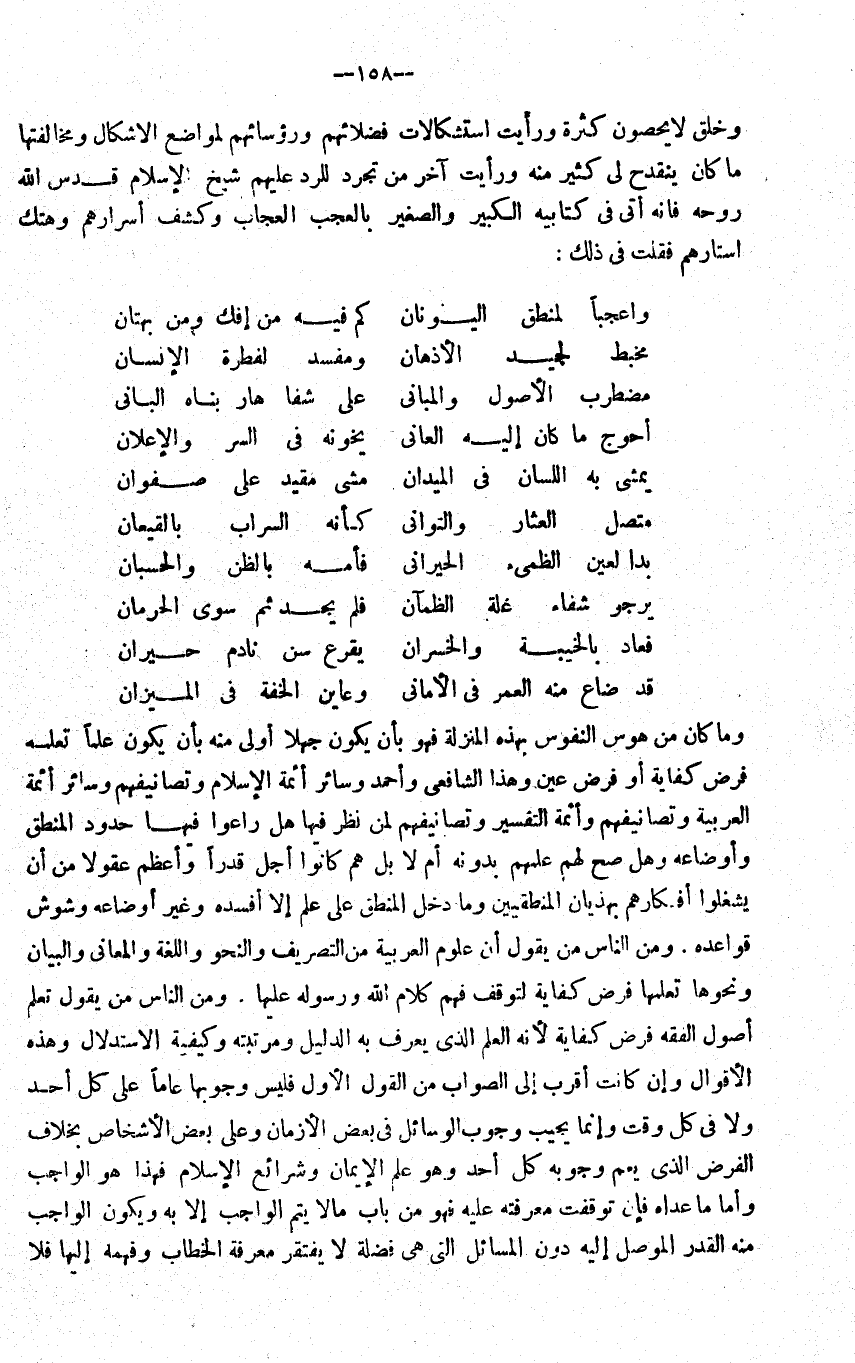 وَاعجَبا لمنطق اليونان ... كم فِيهِ من إفْك وَمن بهتان مخبط لجيد الاذهان ... ومفسد لفطرة الانسان مُضْطَرب الاصول والمباني ... على شفا هار بناه الْبَانِي احوج مَا كَانَ اليه العاني ... يخونه فِي السِّرّ والاعلان يمشي بِهِ اللِّسَان فِي الميدان ... مشي مُقَيّد على صَفْوَان مُتَّصِل العثار والتواني ... كَأَنَّهُ السراب بالقيعان بدا لعين الظميء الحيراني ... فأمه بِالظَّنِّ والحسبان يَرْجُو شِفَاء غلَّة الظمآن ... فَلم يجد ثمَّ سوى الحرمان فَعَاد بالخيبة والخسران ... يقرع سنّ نادم حيران ... قد ضَاعَ مِنْهُ الْعُمر فِي الاماني ... وعاين الخفة فِي الْمِيزَان وَمَا كَانَ من هوس النُّفُوس بِهَذِهِ الْمنزلَة فَهُوَ بَان يكون جهلا اولى مِنْهُ بَان يكون علما تعلمه فرض كِفَايَة اَوْ فرض عين وَهَذَا الشَّافِعِي وَاحْمَدْ وَسَائِر ائمة الاسلام وتصانيفهم وَسَائِر ائمة الْعَرَبيَّة وتصانيفهم وائمة التَّفْسِير وتصانيفهم لمن نظر فِيهَا هَل راعوا فِيهَا حُدُود الْمنطق واوضاعه وَهل صَحَّ لَهُم علمهمْ بِدُونِهِ ام لَا بل هم كَانُوا اجل قدرا واعظم عقولا من ان يشغلو افكارهم بهذيان المنطقيين وَمَا دخل الْمنطق على علم الا افسده وَغير اوضاعه روشوش قَوَاعِده وَمن النَّاس من يَقُول ان عُلُوم الْعَرَبيَّة من التصريف والنحو واللغة والمعاني وَالْبَيَان وَنَحْوهَا تعلمهَا فرض كِفَايَة لتوقف فهم كَلَام الله وَرَسُوله عَلَيْهَا وَمن النَّاس من يَقُول تعلم اصول الْفِقْه فرض كِفَايَة لانه الْعلم الَّذِي يعرف بِهِ الدَّلِيل ومرتبته وكفية الِاسْتِدْلَال وَهَذِه الاقوال وان كَانَت اقْربْ الى الصَّوَاب من القَوْل الاول فَلَيْسَ وُجُوبهَا عَاما على كل اُحْدُ وَلَا فِي كل وَقت وَإِنَّمَا يُجيب وجوب الْوَسَائِل فِي بعض الازمان وعَلى بعض الاشخاص بِخِلَاف الْفَرْض الَّذِي يعم وُجُوبه كل اُحْدُ وَهُوَ علم الايمان وَشَرَائِع الاسلام فَهَذَا هُوَ الْوَاجِب واما مَا عداهُ فَإِن توقفت مَعْرفَته عَلَيْهِ فَهُوَ من بَاب مَالا يتم الْوَاجِب الا بِهِ وَيكون الْوَاجِب مِنْهُ الْقدر الْموصل اليه دون الْمسَائِل الَّتِي هِيَ فضلَة لَا يفْتَقر معرفَة الْخطاب وفهمه اليها فَلَا