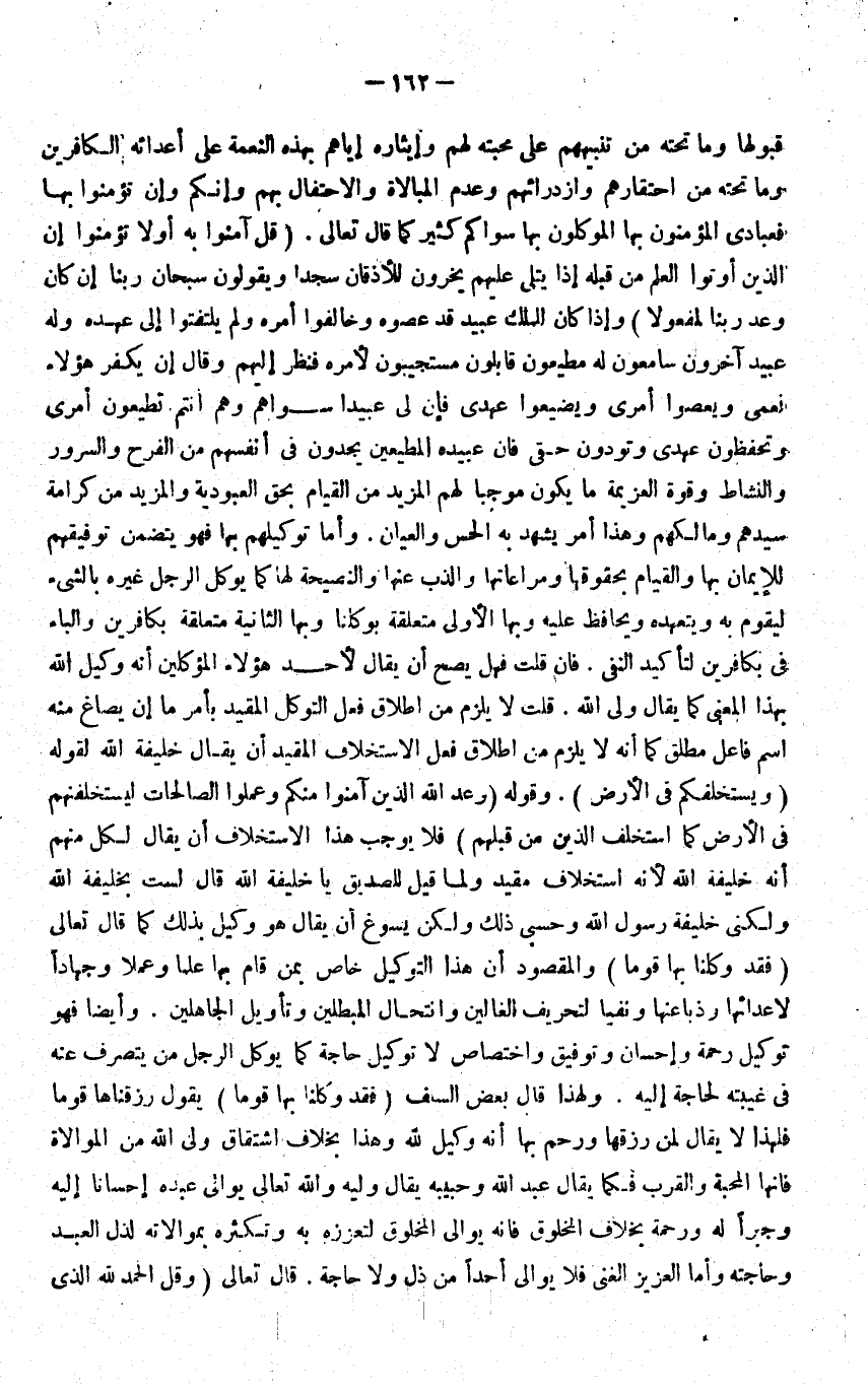قبُولهَا وَمَا تَحْتَهُ من تنبيههم على محبته لَهُم وإيثاره إيَّاهُم بِهَذِهِ النِّعْمَة على اعدائه الْكَافرين وَمَا تَحْتَهُ من احتقارهم وازدرائهم وَعدم المبالاة والاحتفال بهم وَإِنَّكُمْ وان تؤمنوا بهَا فعبادي الْمُؤْمِنُونَ بهَا الموكلون بهَا سواكم كثير كَمَا قَالَ تَعَالَى قل آمنُوا بِهِ اولا تؤمنوا إِن الَّذين اوتوا الْعلم من قبله إِذا يُتْلَى عَلَيْهِم يخرون للأذقان سجدا يوقولن سُبْحَانَ رَبنَا إِن كَانَ وعد رَبنَا لمفعولا وَإِذا كَانَ للْملك عبيد قدعصوره وخالفوا امْرَهْ وَلم يلتفتوا الى عَهده وَله عبيد آخَرُونَ سامعون لَهُ مطيعون قابلون مستجيبون لامره فَنظر اليهم وَقَالَ ان يكفر هَؤُلَاءِ نعمى ويعصوا امري ويضيعو عهدي فَإِن لي عبيدا سواهُم وهم انتم تطيعون امري وتحفظون عهدي وتودون حَقي فَإِن عبيده المطيعين يَجدونَ فِي انفسهم من الْفَرح وَالسُّرُور والنشاط وَقُوَّة الْعَزِيمَة مَا يكون مُوجبا لَهُم الْمَزِيد من الْقيام بِحَق الْعُبُودِيَّة والمزيد من كَرَامَة سيدهم ومالكهم وَهَذَا امْر يشْهد بِهِ الْحس والعيان واما توكيلهم بهَا فَهُوَ يتَضَمَّن توفيقهم للايمان بهَا وَالْقِيَام بحقوقها ومراعاتها والذب عَنْهَا والنصيحة لَهَا كَمَا يُوكل الرجل غَيره بالشَّيْء ليقوم بِهِ ويتعهده ويحافظ عَلَيْهِ وَبهَا الاولى مُتَعَلقَة بوكلنا وَبهَا الثَّانِيَة مُتَعَلقَة بكافرين وَالْبَاء فِي بكافرين لتأكيد النَّفْي فَإِن قلت فَهَل يَصح ان يُقَال لَاحَدَّ هَؤُلَاءِ المؤكلين انه وَكيل الله بِهَذَا الْمَعْنى كَمَا يُقَال ولي الله قلت لَا يلْزم من إِطْلَاق فعل التَّوَكُّل الْمُقَيد بِأَمْر مَا إِن يصاغ مِنْهُ اسْم فَاعل مُطلق كَمَا انه لَا يلْزم من اطلاق فعل الِاسْتِخْلَاف الْمُقَيد ان قَالَ خَليفَة الله لقَوْله ويستخلفكم فِي الارض وَقَوله وعد الله الَّذين آمنُوا مِنْكُم وَعمِلُوا الصَّالِحَات ليَستَخْلِفنهم فِي الارض كَمَا اسْتخْلف الَّذين من قبلهم فَلَا يُوجب هَذَا الِاسْتِخْلَاف ان يُقَال لكل مِنْهُم انه خَليفَة الله لانه اسْتِخْلَاف مُقَيّد وَلما قيل للصديق يَا خَليفَة الله قَالَ لست بخليفة الله وَلَكِنِّي خَليفَة رَسُول الله وحسبي ذَلِك وَلَكِن يسوغ ان يُقَال هُوَ وَكيل بذلك كَمَا قَالَ تَعَالَى فقد وكلنَا بهَا قوما وَالْمَقْصُود ان هَذَا التَّوْكِيل خَاص بِمن قَامَ بهَا علما وَعَملا وجهادا لاعدائها وذبا عَنْهَا ونفيا لتحريف الغالين وانتحال المبطلين وَتَأْويل الْجَاهِلين وايضا فَهُوَ تَوْكِيل رَحْمَة وإحسان وتوفيق واختصاص لَا تَوْكِيل حَاجَة كَمَا يُوكل الرجل من يتَصَرَّف عَنهُ فِي غيبته لحَاجَة اليه وَلِهَذَا قَالَ بعض السّلف فقد وكلنَا بهَا قوما يَقُول رزقناها قوما فَلهَذَا لَا يُقَال لمن رزقها ورحم بهَا انه وَكيل لله وَهَذَا بِخِلَاف اشتقاق ولي الله من الْمُوَالَاة فانها الْمحبَّة والقرب فَكَمَا يُقَال عبد الله وحبيبه يُقَال وليه وَالله تَعَالَى يوالي عَبده إحسانا اليه وجبرا لَهُ ورحمه بِخِلَاف الْمَخْلُوق فَإِنَّهُ يوالي الْمَخْلُوق لتعززه بِهِ وتكثره بموالاته لذل العَبْد وَحَاجته واما الْعَزِيز الْغَنِيّ فَلَا يوالي احدا من ذل وَلَا حَاجَة قَالَ تَعَالَى وَقل الْحَمد لله الَّذِي