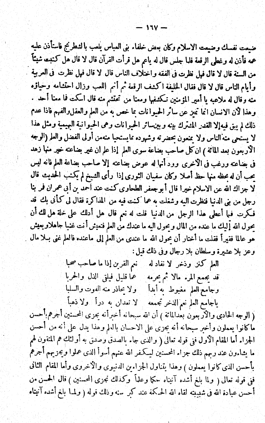 ضيعت نَفسك وضيعت الاسلام وَكَانَ بعض خلفاء بني الْعَبَّاس يلْعَب بالشطرنج فاستاذن عَلَيْهِ عَمه فاذن لَهُ وغطى الرقعة فَلَمَّا جلس قَالَ لَهُ يَا عَم هَل قَرَأت الْقُرْآن قَالَ قَالَ هَل كتبت شَيْئا من السّنة قَالَ لَا قَالَ فَهَل نظرت فِي الْفِقْه وَاخْتِلَاف النَّاس قَالَ لَا قَالَ فَهَل نظرت فِي الْعَرَبيَّة وايام النَّاس قَالَ لَا قَالَ فَقَالَ الْخَلِيفَة اكشف الرقعة ثمَّ اتم اللّعب وَزَالَ احتشامه وحياؤه مِنْهُ وَقَالَ لَهُ ملاعبه يَا أَمِير الْمُؤمنِينَ تكشفها ومعنا من تحتشم مِنْهُ قَالَ اسْكُتْ فَمَا مَعنا اُحْدُ وَهَذَا لَان الانسان انما تميز عَن سائ الْحَيَوَانَات بِمَا خص بِهِ من الْعلم وَالْعقل والفهم فَإِذا عدم ذَلِك لم يبْق فِيهِ الا الْقدر الْمُشْتَرك بَينه وَبَين سَائِر الْحَيَوَانَات وَهِي الحيوانية البهيمية وَمثل هَذَا لَا يستحي مِنْهُ النَّاس وَلَا يمْنَعُونَ بِحَضْرَتِهِ وشهوده مِمَّا يستحيا مِنْهُ من اولى الْفضل وَالْعلم الْوَجْه الاربعون بعدالمائة ان كل صَاحب بضَاعَة سوى الْعلم إِذا علم ان غير بضاعته خير مِنْهَا زهد فِي بضاعته وَرغب فِي الاخرى وود انها لَهُ عوض بضاعته الا صَاحب بضَاعَة الْعلم فَإِنَّهُ لَيْسَ يحب ان لَهُ يحظه مِنْهَا حَظّ اصلا وَكَانَ سُفْيَان الثَّوْريّ إِذا رأى الشَّيْخ لم يكْتب الحَدِيث قَالَ لاجزاك الله عَن الاسلام خيرا قَالَ ابو جَعْفَر الطَّحَاوِيّ كنت عِنْد احْمَد بن ابي عمرَان فَمر بِنَا رجل من بني الدُّنْيَا فَنَظَرت اليه وشغلت بِهِ عَمَّا كنت فِيهِ من المذاكرة فَقَالَ لي كَأَنِّي بك قد فَكرت فِيمَا اعطى هَذَا الرجل من الدُّنْيَا قلت لَهُ نعم قَالَ هَل ادلك على خلة هَل لَك ان يحول الله اليك مَا عِنْده من المَال ويحول اليه مَا عنْدك من الْعلم فتعيش انت غَنِيا جَاهِلا ويعيش هُوَ عَالما فَقِيرا فَقلت مَا اخْتَار ان يحول الله مَا عِنْدِي من الْعلم الى مَا عِنْده فالعلم غنى بِلَا مَال وَعز بِلَا عشيرة وسلطان بِلَا رجال وَفِي ذَلِك قيل: