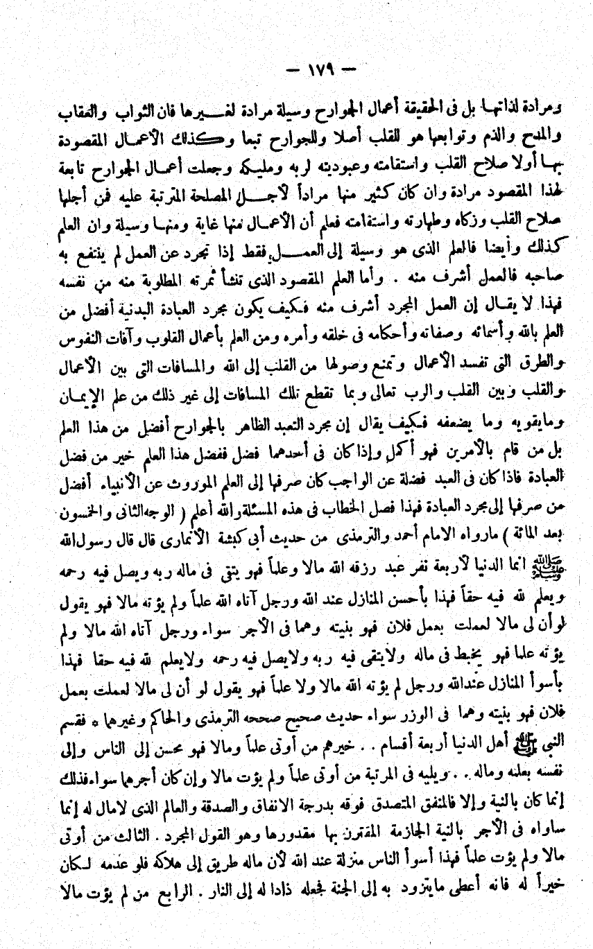 وَمرَاده لذاتها بل فِي الْحَقِيقَة اعمال الْجَوَارِح وَسِيلَة مُرَادة لغَيْرهَا فَإِن الثَّوَاب وَالْعِقَاب والمدح والذم وتوابعها هُوَ للقلب اصلا وللجوارح تبعا وَكَذَلِكَ الاعمال الْمَقْصُودَة بهَا اولا صَلَاح الْقلب واستقامته وعبوديته لرَبه ومليكه وَجعلت اعمال الْجَوَارِح تَابِعَة لهَذَا الْمَقْصُود مُرَادة وان كَانَ كثير مِنْهَا مرَادا لاجل الْمصلحَة المترتبة عَلَيْهِ فَمن اجلها صَلَاح الْقلب وزكاه وطهارته واستقامته فَعلم ان الاعمال مِنْهَا غَايَة وَمِنْهَا وَسِيلَة وان الْعلم كَذَلِك وايضا فالعلم الَّذِي هُوَ وَسِيلَة الى الْعَمَل فَقَط إِذا تجرد عَن الْعَمَل لم ينْتَفع بِهِ صَاحبه فَالْعَمَل اشرف مِنْهُ وَأما الْعلم الْمَقْصُود الَّذِي تنشأ ثَمَرَته الْمَطْلُوبَة مِنْهُ من نَفسه فَهَذَا لَا يُقَال ان الْعَمَل الْمُجَرّد اشرف مِنْهُ فَكيف يكون مُجَرّد الْعِبَادَة الْبَدَنِيَّة افضل من الْعلم بِاللَّه واسمائه وَصِفَاته وَأَحْكَامه فِي خلقه وامره وَمن الْعلم بأعمال الْقُلُوب وآفات النُّفُوس والطرق الَّتِي تفْسد الاعمال وتمنع وصولها من الْقلب الى الله والمسافات الَّتِي بَين الاعمال وَالْقلب وَبَين الْقلب والرب تَعَالَى وَبِمَا تقطع تِلْكَ المسافات الى غير ذَلِك من علم الايمان وَمَا يقويه وَمَا يُضعفهُ فَكيف يُقَال ان مُجَرّد التَّعَبُّد الظَّاهِر بالجوارح افضل من هَذَا الْعلم بل من قَامَ بالامرين فَهُوَ اكمل وَإِذا كَانَ فِي احدهما فضل ففضل هَذَا الْعلم خير من فضل الْعِبَادَة فاذ كَانَ فِي العَبْد فضلَة عَن الْوَاجِب كَانَ صرفهَا الى الْعلم الْمَوْرُوث عَن الانبياء افضل من صرفهَا الى مُجَرّد الْعِبَادَة فَهَذَا فصل الْخطاب فِي هَذِه المسئلة وَالله اعْلَم الْوَجْه الثَّانِي وَالْخَمْسُونَ بعدالمائة مَا رَوَاهُ الامام احْمَد وَالتِّرْمِذِيّ من حَدِيث ابي كَبْشَة الانماري قَالَ قَالَ رَسُول الله انما الدُّنْيَا لأربعة نفر عبد رزقه الله مَالا وعلما فَهُوَ يَتَّقِي فِي مَاله ربه ويصل فِيهِ رَحمَه وَيعلم لله فِيهِ حَقًا فَهَذَا باحسن الْمنَازل عِنْد الله وَرجل آتَاهُ الله علما وَلم يؤته مَالا فَهُوَ يَقُول لَو ان لي مَالا لعملت بِعَمَل فلَان فَهُوَ بنيته وهما فِي الاجر سَوَاء وَرجل آتَاهُ الله مَالا وَلم يؤته علما فَهُوَ يخبط فِي مَاله وَلَا يَتَّقِي فِيهِ ربه وَلَا يصل فِي رَحمَه وَلَا يعلم لله فِيهِ حَقًا فَهَذَا بأسوا الْمنَازل عِنْد الله وَرجل لم يؤته الله مَالا وَلَا علما فَهُوَ يَقُول لَو ان لي مَالا لعملت بِعَمَل فلَان فَهُوَ بنيته وهما فِي الْوزر سَوَاء حَدِيث صَحِيح صَححهُ التِّرْمِذِيّ وَالْحَاكِم وَغَيرهمَا فقسم النَّبِي اهل الدُّنْيَا أَرْبَعَة اقسام خَيرهمْ من اوتي علما ومالا فَهُوَ محسن الى النَّاس وَإِلَى نَفسه بِعِلْمِهِ وَمَاله ويليه فِي الْمرتبَة من اوتي علما وَلم يُؤْت مَالا وان كَانَ اجرهما سَوَاء فَذَلِك إِنَّمَا كَانَ بِالنِّيَّةِ والا فالمنفق الْمُتَصَدّق فَوْقه بِدَرَجَة الانفاق وَالصَّدَََقَة والعالم الَّذِي لَا مَال لَهُ إِنَّمَا ساواه فِي الاجر بِالنِّيَّةِ الجازمة المقترن بهَا مقدورهما وَهُوَ القَوْل الْمُجَرّد الثَّالِث من اوتي مَالا وَلم يُؤْت علما فَهَذَا اسوأ النَّاس منزلَة عِنْد الله لَان مَاله طَرِيق الى هَلَاكه فَلَو عَدمه لَكَانَ خيرا لَهُ فَإِنَّهُ اعطى مَا يتزود بِهِ الى الْجنَّة فَجعله زادا لَهُ الى النَّار الرَّابِع من لم يُؤْت مَالا