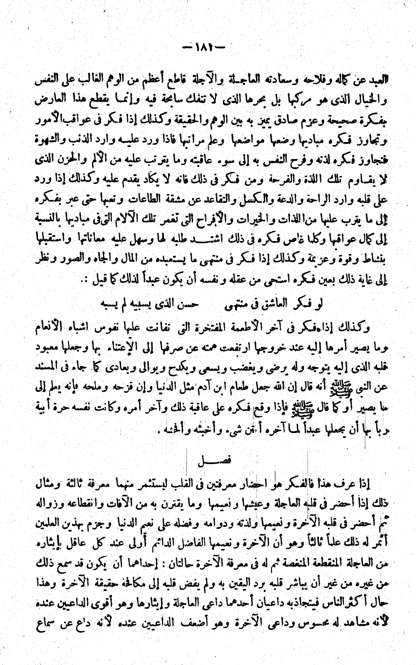 العَبْد عَن كَمَاله وفلاحه وسعادته العاجلة والاجلة قَاطع اعظم من الْوَهم الْغَالِب على النَّفس والخيال الَّذِي هُوَ مركبها بل بحرها الَّذِي لَا تنفك سابحة فِيهِ وَإِنَّمَا يقطع هَذَا الْعَارِض بفكرة صَحِيحَة وعزم صَادِق يُمَيّز بِهِ بَين الْوَهم والحقيقة وَكَذَلِكَ إِذا فكر فِي عواقب الامور وَتجَاوز فكره مباديها وَضعهَا موَاضعهَا وَعلم مراتبها فَإِذا ورد عَلَيْهِ وَارِد الذَّنب والشهوة فَتَجَاوز فكره لذته وَفَرح النَّفس بِهِ الى سوء عاقبته وَمَا يَتَرَتَّب عَلَيْهِ من الالم والحزن الَّذِي لَا يُقَاوم تِلْكَ اللَّذَّة والفرحة وَمن فكر فِي ذَلِك فَإِنَّهُ لَا يكَاد يقدم عَلَيْهِ وَكَذَلِكَ إِذا ورد على قلبه وَارِد الرَّاحَة والدعة والكسل والتقاعد عَن مشقة الطَّاعَات وتعبها حَتَّى عبر بفكره الى مَا يترب عَلَيْهَا من اللَّذَّات والخيرات والافراح الَّتِي تغمر تِلْكَ الالام الَّتِي فِي مباديها بِالنِّسْبَةِ الى كَمَال عواقبها وَكلما غاص فكره فِي ذَلِك اشْتَدَّ طلبه لَهَا وَسَهل عَلَيْهِ معاناتها اسْتَقْبلهَا بنشاط وَقُوَّة وعزيمة وَكَذَلِكَ إِذا فكر فِي مُنْتَهى مَا يستعبده من المَال والجاه والصور وَنظر الى غَايَة ذَلِك بِعَين فكره اسْتَحى من عقله وَنَفسه ان يكون عبدا لذَلِك كَمَا قيل: