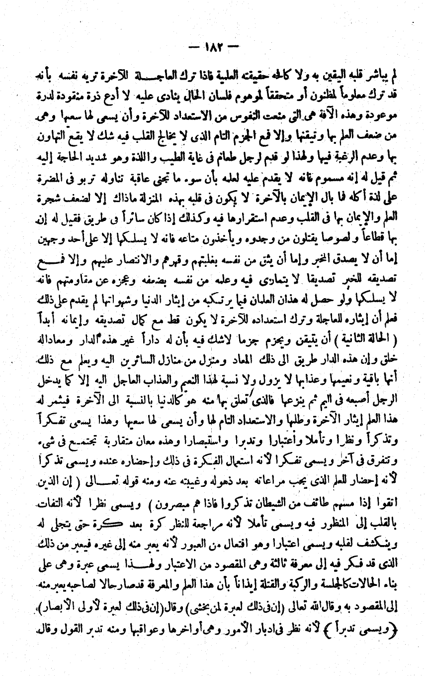لم يُبَاشر قلبه الْيَقِين بِهِ وَلَا كافحه حَقِيقَته العلمية فَإِذا ترك العاجلة للاخرة تريه نَفسه بانه قد ترك مَعْلُوما لمظنون اومتحققا لموهوم فلسان الْحَال يُنَادي عَلَيْهِ لَا ادْع ذرة منقودة لدرة موعودة وَهَذِه الافة هِيَ الَّتِي منعت النُّفُوس من الاستعداد للاخرة وان يسْعَى لَهَا سعيها وَهِي من ضعف الْعلم بهَا وتيقنها وَإِلَّا فَمَعَ الْجَزْم التَّام الَّذِي لَا يخالج الْقلب فِيهِ شكّ لَا يَقع التهاون بهَا وَعدم الرَّغْبَة فِيهَا وَلِهَذَا لَو قدم لرجل طَعَام فِي غَايَة الطّيب واللذة وَهُوَ شَدِيد الْحَاجة اليه ثمَّ قيل لَهُ إِنَّه مَسْمُوم فَإِنَّهُ لَا يقدم عَلَيْهِ لعلمه بِأَن سوء مَا تجنى عَاقِبَة تنَاوله تربو فِي الْمضرَّة على لَذَّة اكله فَمَا بَال الايمان بالاخرة لَا يكون فِي قلبه بِهَذِهِ الْمنزلَة ماذاك الا لضعف شَجَرَة الْعلم والايمان بهَا فِي الْقلب وَعدم استقرارها فِيهِ وَكَذَلِكَ اذا كَانَ سائرا فِي طَرِيق فَقيل لَهُ إِن بهَا قطاعا ولصوصا يقتلُون من وجدوه وَيَأْخُذُونَ مَتَاعه فانه لَا يسلكها الا على اُحْدُ وَجْهَيْن اما ان لَا يصدق الْمخبر وَإِمَّا ان يَثِق من نَفسه بغلبتهم وقهرهم والانتصار عَلَيْهِم والاف فَمَعَ تَصْدِيقه للْخَبَر تَصْدِيقًا لَا يتمارى فِيهِ وَعلمه من نَفسه بضعفه وعجزه عَن مقاومتهم فَإِنَّهُ لَا يسلكها وَلَو حصل لَهُ هَذَانِ العلمان فِيمَا يرتكبه من ايثار الدُّنْيَا وشهواتها لم يقدم على ذَلِك فَعلم ان إيثاره للعاجلة وَترك استعداده للاخرة لَا يكون قطّ مَعَ كَمَال تَصْدِيقه وإيمانهابدا الْحَالة الثَّانِيَة ان يتَيَقَّن ويجزم جزما لَا شكّ فِيهِ بِأَن لَهُ دَارا غير هَذِه الدَّار ومعادا لَهُ خلق وان هَذِه الدَّار طَرِيق الى ذَلِك الْمعَاد ومنزل من منَازِل السائرين اليه وَيعلم مَعَ ذَلِك انها بَاقِيَة وَنَعِيمهَا وعذابها لَا يَزُول وَلَا نِسْبَة لهَذَا النَّعيم وَالْعَذَاب العاجل اليه إِلَّا كَمَا يدْخل الرجل اصبعه فِي اليم ثمَّ يَنْزِعهَا فَالَّذِي تعلق بهَا مِنْهُ هُوَ كالدنيا بِالنِّسْبَةِ الى الاخرة فيثمر لَهُ هَذَا الْعلم ايثار الاخرة وطلبها والاستعداد التَّام لَهَا وان يسْعَى لَهَا سعيها وَهَذَا يسْعَى تفكرا وتذكرا ونظرا وتأملا واعتبارا وتدبرا واستبصارا وَهَذِه معَان مُتَقَارِبَة تَجْتَمِع فِي شَيْء وتتفرق فِي آخر وَيُسمى تفكرا لانه اسْتِعْمَال الفكرة فِي ذَلِك واحضاره عِنْده وَيُسمى تذكرا لانه احضار للْعلم الَّذِي يجب مراعاته بعد ذُهُوله وغيبته عَنهُ وَمِنْه قَوْله تَعَالَى ان الَّذين اتَّقوا اذا مسهم طائف من الشَّيْطَان تَذكرُوا فَإِذا هم مبصرون وَيُسمى نظرا لانه الْتِفَات بِالْقَلْبِ الى المنظور فِيهِ وَيُسمى تأملا لانه مُرَاجعَة للنَّظَر كرة بعدكرة حَتَّى يتجلى لَهُ وينكشف لِقَلْبِهِ وَيُسمى اعْتِبَارا وَهُوَ افتعال من العبور لانه يعبر مِنْهُ الى غَيره فيعبر من ذَلِك الَّذِي قد فكر فِيهِ الى معرفَة ثَالِثَة وَهِي الْمَقْصُود من الِاعْتِبَار وَلِهَذَا يُسمى عِبْرَة وَهِي على بِنَاء الْحَالَات كالجلسة وَالركبَة والقتلة ايذانا بِأَن هَذَا الْعلم والمعرفة قد صَار حَالا لصَاحبه يعبر مِنْهُ الى الْمَقْصُود بِهِ وَقَالَ الله تَعَالَى ان فِي ذَلِك لعبرة لمن يخْشَى {وَقَالَ} إِن فِي ذَلِك لعبرة لاولي الابصار وَيُسمى تدبرا لانه نظر فِي ادبار الامور وَهِي اواخرها وعواقبها وَمِنْه تدبر القَوْل وَقَالَ