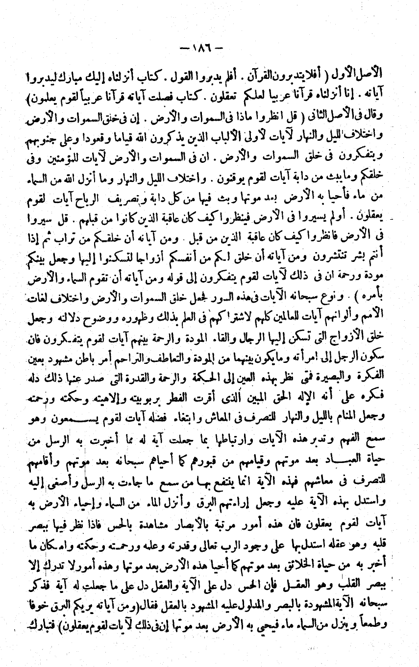 الاصل الاول {أَفلا يتدبرون الْقُرْآن} افلم يدبروا القَوْل {كتاب أَنزَلْنَاهُ إِلَيْك مبارك ليدبروا آيَاته} إِنَّا انزلناه قُرْآنًا عَرَبيا لَعَلَّكُمْ تعقلون كتاب فصلت اياته قُرْآنًا عَرَبيا لقوم يعلمُونَ وَقَالَ فِي الاصل الثَّانِي قل انْظُرُوا مَاذَا فِي السَّمَوَات والارض ان فِي خلق السَّمَوَات والارض وَاخْتِلَاف اللَّيْل وَالنَّهَار لايات لاولي الالباب الَّذين يذكرُونَ الله قيَاما وقعودا وعَلى جنُوبهم ويتفكرون فِي خلق السَّمَوَات والارض ان فِي السَّمَوَات والارض لايات للْمُؤْمِنين وَفِي خَلقكُم وَمَا يبث من دَابَّة آيَات لقوم يوقنون وَاخْتِلَاف اللَّيْل وَالنَّهَار وَمَا أنزل الله من السَّمَاء من مَاء فاحيا بِهِ الارض بعد مَوتهَا وَبث فِيهَا من كل دَابَّة وتصريف الرِّيَاح آيَات لقوم يعْقلُونَ اَوْ لم يَسِيرُوا فِي الارض فينظروا كَيفَ كَانَ عَاقِبَة الَّذين كَانُوا من قبلهم قل سِيرُوا فِي الارض فانظروا كَيفَ كَانَ عَاقِبَة الَّذين من قبل {وَمن آيَاته أَن خَلقكُم من تُرَاب ثمَّ إِذا أَنْتُم بشر تنتشرون وَمن آيَاته أَن خلق لكم من أَنفسكُم أَزْوَاجًا لتسكنوا إِلَيْهَا وَجعل بَيْنكُم مَوَدَّة وَرَحْمَة إِن فِي ذَلِك لآيَات لقوم يتفكرون} الى قَوْله {وَمن آيَاته أَن تقوم السَّمَاء وَالْأَرْض بأَمْره} وَنَوع سُبْحَانَهُ الايات فِي هَذِه السُّور فَجعل خلق السَّمَوَات والارض وَاخْتِلَاف لُغَات الامم والوانهم آيَات للْعَالمين كلهم لاشتراكهم فِي الْعلم بذلك وظهوره ووضوح دلَالَته وَجعل خلق الازواج الَّتِي تسكن اليها الرِّجَال والقاء الْمَوَدَّة وَالرَّحْمَة بَينهم آيَات لقوم يتفكرون فَإِن سُكُون الرجل الى امْرَأَته وَمَا يكون بَينهمَا من الْمَوَدَّة والتعاطف والتراحم امْر بَاطِن مشهود بِعَين الفكرة والبصيرة فَمَتَى نظر بِهَذِهِ الْعين الى الْحِكْمَة وَالرَّحْمَة وَالْقُدْرَة الَّتِي صدر عَنْهَا ذَلِك دلة فكره على انه الاله الْحق الْمُبين الَّذِي أقرَّت الْفطر بربوبيته والاهيته وحكمته وَرَحمته وَجعل الْمَنَام بِاللَّيْلِ وَالنَّهَار للتَّصَرُّف فِي المعاش وابتغاء فَضله آيَات لقوم يسمعُونَ وَهُوَ سمع الْفَهم وتدبر هَذِه الايات وارتباطها بِمَا جعلت آيَة لَهُ مِمَّا اخبرت بِهِ الرُّسُل من حَيَاة الْعباد بعد مَوْتهمْ وقيامهم من قُبُورهم كَمَا احياهم سُبْحَانَهُ بعد مَوْتهمْ وأقامهم للتَّصَرُّف فِي معاشهم فَهَذِهِ الاية إِنَّمَا ينْتَفع بهَا من سمع مَا جَاءَت بِهِ الرُّسُل واصغى اليه وَاسْتدلَّ بِهَذِهِ الاية عَلَيْهِ وَجعل إراءتهم الْبَرْق وَأنزل المَاء من السَّمَاء وإحياء الارض بِهِ آيَات لقوم يعْقلُونَ فَإِن هَذِه امور مرتبَة بالابصار مُشَاهدَة بالحس فَإِذا نظر فِيهَا ببصر قلبه وَهُوَ عقله اسْتدلَّ بهَا على وجود الرب تَعَالَى وَقدرته وَعلمه وَرَحمته وحكمته إِمْكَان مَا اخبر بِهِ من حَيَاة الْخَلَائق بعد مَوْتهمْ كَمَا احيا هَذِه الارض بعدموتها وَهَذِه امور لاتدرك إِلَّا ببصر الْقلب وَهُوَ الْعقل فَإِن الْحس دلّ على الاية وَالْعقل دلّ على مَا جعلت لَهُ آيَة فَذكر سُبْحَانَهُ الاية المشهودة بالبصر والمدلول عَلَيْهِ الْمَشْهُود بِالْعقلِ فَقَالَ وَمن آيَاته يريكم الْبَرْق خوفًا وَطَمَعًا وَينزل من السَّمَاء مَاء فيحي بِهِ الارض بعدموتها أَن فِي ذَلِك لايات لقوم يعْقلُونَ فَتَبَارَكَ