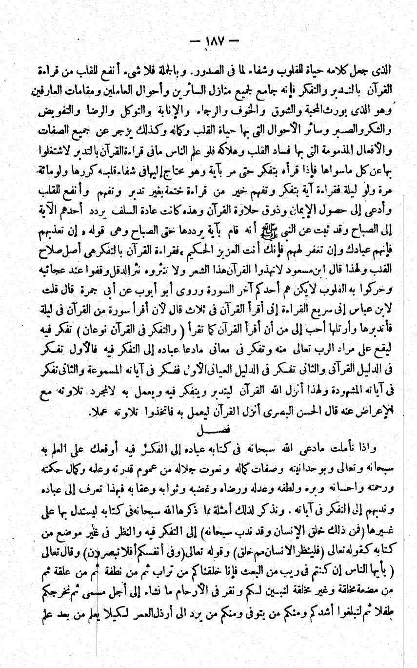 الَّذِي جعل كَلَامه حَيَاة للقلوب وشفاء لما فِي الصُّدُور وَبِالْجُمْلَةِ فَلَا شَيْء أَنْفَع للقلب من قِرَاءَة الْقُرْآن بالتدبر والتفكر فَإِنَّهُ جَامع لجَمِيع منَازِل السائرين واحوال العاملين ومقامات العارفين وَهُوَ الَّذِي يُورث الْمحبَّة والشوق وَالْخَوْف والرجاء والانابة والتوكل وَالرِّضَا والتفويض وَالشُّكْر وَالصَّبْر وَسَائِر الاحوال الَّتِي بهَا حَيَاة الْقلب وكماله وَكَذَلِكَ يزْجر عَن جَمِيع الصِّفَات والافعال المذمومة وَالَّتِي بهَا فَسَاد الْقلب وهلاكه فَلَو علم النَّاس مَا فِي قِرَاءَة الْقُرْآن بالتدبر لاشتغلوا بهَا عَن كل مَا سواهَا فَإِذا قَرَأَهُ بتفكر حَتَّى مر بِآيَة وَهُوَ مُحْتَاجا إِلَيْهَا فِي شِفَاء قلبه كررها وَلَو مائَة مرّة وَلَو لَيْلَة فقراءة آيَة بتفكر وتفهم خير من قِرَاءَة ختمة بِغَيْر تدبر وتفهم وأنفع للقلب وأدعى الى حُصُول الايمان وذوق حلاوة الْقُرْآن وَهَذِه كَانَت عَادَة السّلف يردد احدهم الاية الى الصَّباح وَقد ثَبت عَن النَّبِي انه قَامَ بِآيَة يُرَدِّدهَا حَتَّى الصَّباح وَهِي قَوْله {إِن تُعَذبهُمْ فَإِنَّهُم عِبَادك وَإِن تغْفر لَهُم فَإنَّك أَنْت الْعَزِيز الْحَكِيم} فقراءة الْقُرْآن بالتفكر هِيَ اصل صَلَاح الْقلب وَلِهَذَا قَالَ ابْن مَسْعُود لاتهذوا الْقُرْآن هَذَا الشّعْر وَلَا تنثروه نثر الدقل وقفُوا عِنْد عجائبه وحركوا بِهِ الْقُلُوب لَا يكن هم احدكم آخر السُّورَة وروى ابو ايوب عَن ابي جَمْرَة قَالَ قلت لِابْنِ عَبَّاس اني سريع الْقِرَاءَة إِنِّي اقرا الْقُرْآن فِي ثَلَاث قَالَ لَان اقْرَأ سُورَة من الْقُرْآن فِي لَيْلَة فأتدبرها وأرتلها احب الي من ان اقْرَأ الْقُرْآن كَمَا تقْرَأ والتفكر فِي الْقُرْآن نَوْعَانِ تفكر فِيهِ ليَقَع على مُرَاد الرب تَعَالَى مِنْهُ وتفكر فِي مَعَاني مَا دَعَا عباده الى التفكر فِيهِ فالاول تفكر فِي الدَّلِيل القرآني وَالثَّانِي تفكر فِي الدَّلِيل العياني الاول ففكر فِي آيَاته المسموعة وَالثَّانِي تفكر فِي آيَاته المشهودة وَلِهَذَا انْزِلْ الله الْقُرْآن ليتدبر ويتفكر فِيهِ وَيعْمل بِهِ لَا لمُجَرّد تِلَاوَته مَعَ الاعراض عَنهُ قَالَ الْحسن الْبَصْرِيّ انْزِلْ الْقُرْآن ليعْمَل بِهِ فاتخذوا تِلَاوَته عملا