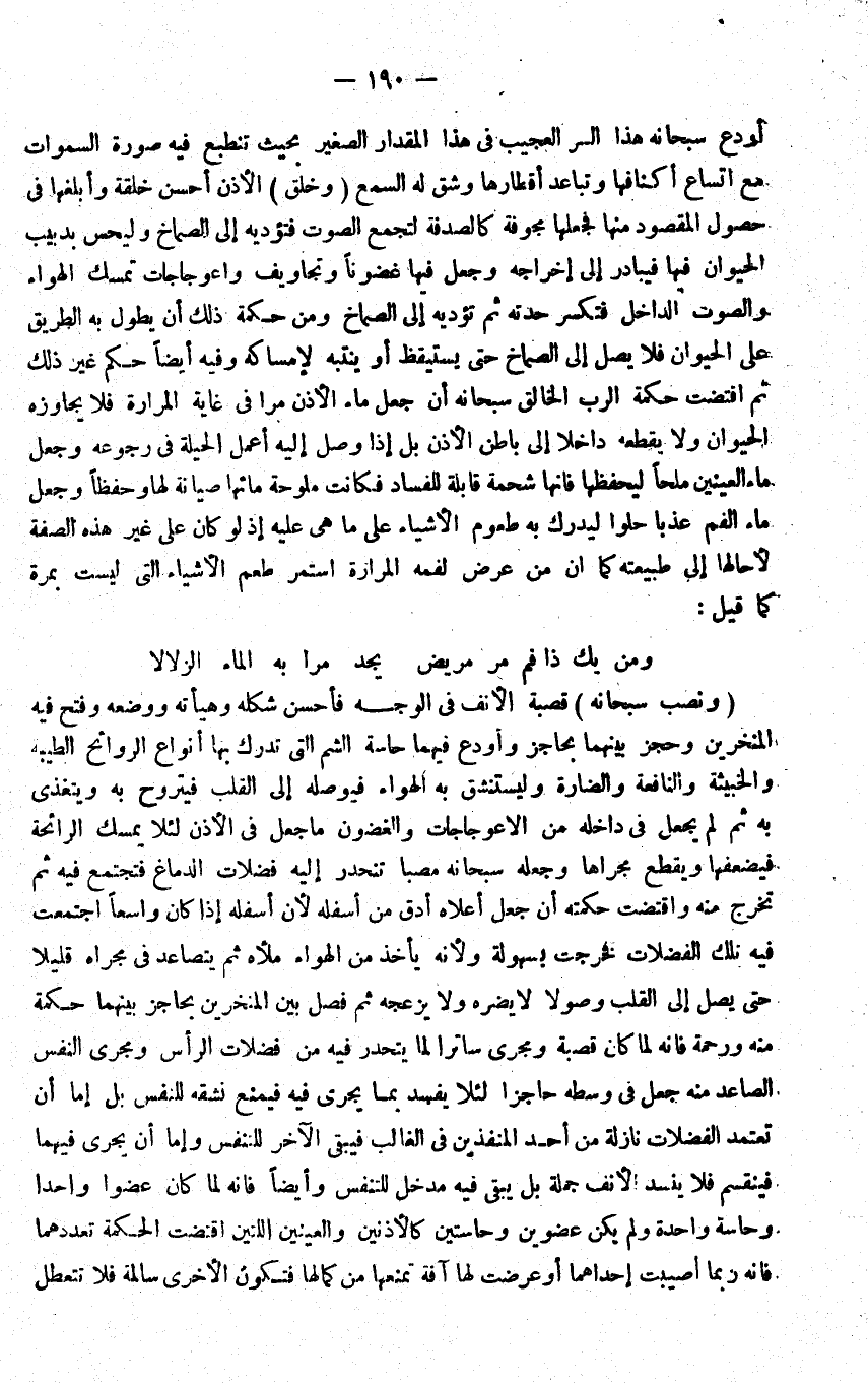اودع سُبْحَانَهُ هَذَا السِّرّ العجيب فِي هَذَا الْمِقْدَار الصَّغِير بِحَيْثُ تنطبع فِيهِ صُورَة السَّمَوَات مَعَ اتساع اكنافها وتباعد اقطارها وشق لَهُ السّمع وَخلق الاذن احسن خلقه وابلغها فِي حُصُول الْمَقْصُود مِنْهَا فَجَعلهَا مجوفة كالصدفة لِتجمع الصَّوْت فتؤديه الى الصماخ وليحس بدبيب الْحَيَوَان فِيهَا فيبادر الى اخراجه وَجعل فِيهَا غضونا وتجاويف واعوجاجات تمسك الْهَوَاء وَالصَّوْت الدَّاخِل فتكسر حِدته ثمَّ تُؤَدِّيه الى الصماخ وَمن حِكْمَة ذَلِك ان يطول بِهِ الطَّرِيق على الْحَيَوَان فَلَا يصل الى الصماخ حَتَّى يَسْتَيْقِظ اَوْ ينتبه لامساكه وَفِيه ايضا حكم غير ذَلِك ثمَّ اقْتَضَت حِكْمَة الرب الْخَالِق سُبْحَانَهُ ان جعل مَاء الاذن مرا فِي غَايَة المرارة فَلَا يُجَاوِزهُ الْحَيَوَان وَلَا يقطعهُ دَاخِلا الى بَاطِن الاذن بل إِذا وصل اليه اعْمَلْ الْحِيلَة فِي رُجُوعه وَجعل مَاء الْعَينَيْنِ ملحا ليحفظها فَإِنَّهَا شحمة قَابِلَة للْفَسَاد فَكَانَت ملوحة مَائِهَا صِيَانة لَهَا وحفظا وَجعل مَاء الْفَم عذبا حلوا ليدرك بِهِ طعوم الاشياء على مَا هِيَ عَلَيْهِ إِذْ لَو كَانَ على غير هَذِه الصّفة لاحالها الى طَبِيعَته كَمَا ان من عرض لفمه المرارة اسْتمرّ طعم الاشياء الَّتِي لَيست بِمرَّة كَمَا قيل