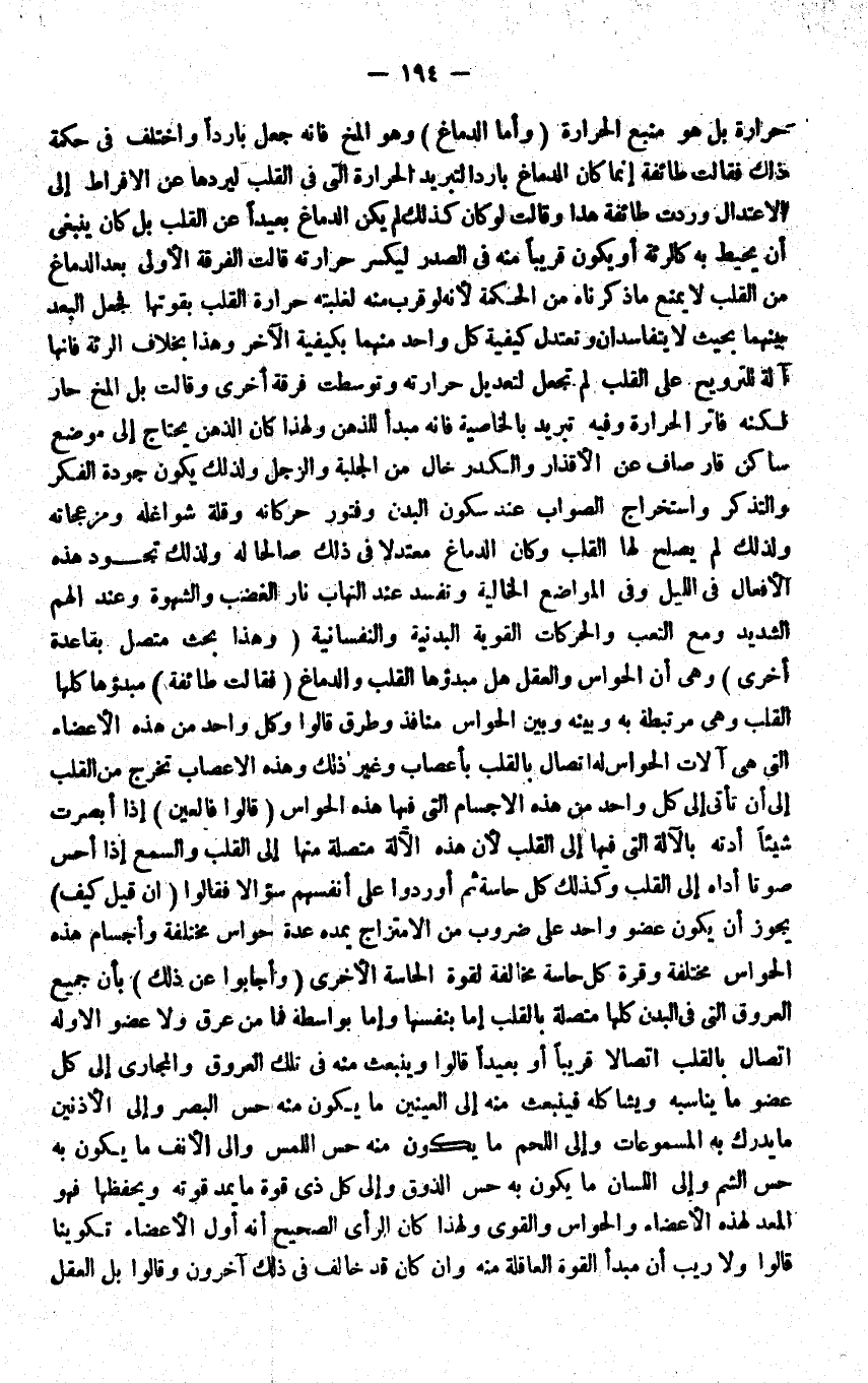حرارة بل هُوَ منبع الْحَرَارَة واما الدِّمَاغ وَهُوَ المخ فَإِنَّهُ جعل بَارِدًا وَاخْتلف فِي حِكْمَة ذَاك فَقَالَت طَائِفَة إِنَّمَا كَانَ الدِّمَاغ بَارِد التبريد الْحَرَارَة الَّتِي فِي الْقلب ليردها عَن الافراط الى الِاعْتِدَال وَردت طَائِفَة هَذَا وَقَالَت لَو كَانَ كَذَلِك لم يكن الدِّمَاغ بَعيدا عَن الْقلب بل كَانَ يَنْبَغِي ان يُحِيط بِهِ كالرئة اَوْ يكون قَرِيبا مِنْهُ فِي الصَّدْر ليكسر حرارته قَالَت الْفرْقَة الاولى بعدالدماغ من الْقلب لَا يمْنَع مَا ذَكرْنَاهُ من الْحِكْمَة لانه لَو قرب مِنْهُ لغلبته حرارة الْقلب بقوتها فَجعل الْبعد بَينهمَا بِحَيْثُ لَا يتفاسدان وتعتدل كَيْفيَّة كل وَاحِد مِنْهُمَا بكيفية الاخر وَهَذَا بِخِلَاف الرئة فَإِنَّهَا آلَة للترويح على الْقلب لم تجْعَل لتعديل حرارته وتوسطت فرقة أُخْرَى وَقَالَت بل المخ حَار لكنه فاتر الْحَرَارَة وَفِيه تبريد بالخاصية فَإِنَّهُ مبدأ للذهن وَلِهَذَا كَانَ الذِّهْن يحْتَاج الى مَوضِع سَاكن قار صَاف عَن الاقذار والكدر خَال من الجلبة والزجل وَلذَلِك يكون جودة الْفِكر والتذكر واستخراج الصَّوَاب عِنْد سُكُون الْبدن وفتور حركاته وَقلة شواغله ومزعجاته وَلذَلِك لم يصلح لَهَا الْقلب وَكَانَ الدِّمَاغ معتدلا فِي ذَلِك صَالحا لَهُ وَلذَلِك تجود هَذِه الافعال فِي اللَّيْل وَفِي الْمَوَاضِع الخالية وتفسد عِنْد التهاب نَار الْغَضَب والشهوة وَعند الْهم الشَّديد وَمَعَ التَّعَب والحركات القوية الْبَدَنِيَّة والنفسانية وَهَذَا بحث مُتَّصِل بقاعدة اخرى وَهِي ان الْحَواس وَالْعقل هَل مبدؤها الْقلب والدماغ فَقَالَت طَائِفَة مبدؤها كلهَا الْقلب وَهِي مرتبطة بِهِ وَبَينه وَبَين الْحَواس منافذ وطرق قَالُوا وكل وَاحِد من هَذِه الاعضاء الَّتِي هِيَ آلَات الْحَواس لَهُ اتِّصَال بِالْقَلْبِ بأعصاب وَغير ذَلِك وَهَذِه الاعصاب تخرج من الْقلب الى ان تَأتي الى كل وَاحِد من هَذِه الاجسام الَّتِي فِيهَا هَذِه الْحَواس قَالُوا فالعين إِذا ابصرت شَيْئا أدته بالالة الَّتِي فِيهَا الى الْقلب لَان هَذِه الالة مُتَّصِلَة مِنْهَا الى الْقلب والسمع إِذا احس صَوتا اداه الى الْقلب وَكَذَلِكَ كل حاسة ثمَّ اوردوا على انفسهم سؤالا فَقَالُوا ان قيل كَيفَ يجوز ان يكون عُضْو وَاحِد على ضروب من الامتزاج يمده عدَّة حواس مُخْتَلفَة وأجسام هَذِه الْحَواس مُخْتَلفَة وَقُوَّة كل حاسة مُخَالفَة لقُوَّة الحاسة الاخرى واجابوا عَن ذَلِك بِأَن جَمِيع الْعُرُوق الَّتِي فِي الْبدن كلهَا مُتَّصِلَة بِالْقَلْبِ إِمَّا بِنَفسِهَا وَإِمَّا بِوَاسِطَة فَمَا من عرق وَلَا عُضْو الاوله اتِّصَال بِالْقَلْبِ اتِّصَالًا قَرِيبا اَوْ بَعيدا قَالُوا وينبعث مِنْهُ فِي تِلْكَ الْعُرُوق والمجاري الى كل عُضْو مَا بناسبه ويشاكله فينبعث مِنْهُ الى الْعَينَيْنِ مَا يكون مِنْهُ حس الْبَصَر وَإِلَى الاذنين مَا يدْرك بِهِ المسموعات وَإِلَى اللَّحْم مَا يكون مِنْهُ حس اللَّمْس وَإِلَى الانف مَا يكون بِهِ حس الشم وَإِلَى اللِّسَان مَا يكون بِهِ حس الذَّوْق وَإِلَى كل ذِي قُوَّة مَا يمد قوته ويحفظها فَهُوَ الْمعد لهَذِهِ الاعضاء والحواس والقوى وَلِهَذَا كَانَ الراي الصَّحِيح انه اول الاعضاء تكوينا قَالُوا وَلَا ريب ان مبدأ الْقُوَّة الْعَاقِلَة مِنْهُ وَإِن كَانَ قد خَالف فِي ذَلِك آخَرُونَ وَقَالُوا بل الْعقل