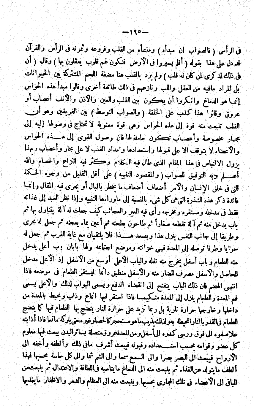 فِي الرَّأْس فَالصَّوَاب ان مبدأه ومنشأه من الْقلب وفروعه وثمرته فِي الراس وَالْقُرْآن قد دلّ على هَذَا بقوله {أفلم يَسِيرُوا فِي الأَرْض فَتكون لَهُم قُلُوب يعْقلُونَ بهَا} وَقَالَ {إِن فِي ذَلِك لذكرى لمن كَانَ لَهُ قلب} وَلم يرد بِالْقَلْبِ هُنَا مُضْغَة اللَّحْم الْمُشْتَركَة بَين الْحَيَوَانَات بل المُرَاد مَا فِيهِ من الْعقل واللب ونازعهم فِي ذَلِك طَائِفَة اخرى وَقَالُوا مبدأ هَذِه الْحَواس إِنَّمَا هُوَ الدِّمَاغ وانكروا ان يكون بَين الْقلب وَالْعين والاذن والانف اعصاب اَوْ عروف وَقَالُوا هَذَا كذب على الْخلقَة وَالصَّوَاب التَّوَسُّط بَين الْفَرِيقَيْنِ وَهُوَ ان الْقلب تنبعث مِنْهُ قُوَّة الى هَذِه الْحَواس وَهِي قُوَّة معنوية لَا تحْتَاج فِي وصولها اليه الى مجار مَخْصُوصَة واعصاب تكون حاملة لَهَا فَإِن وُصُول القوى الى هَذِه الْحَواس والاعضاء لَا يتَوَقَّف الاعلى قبُولهَا واستعداها وامداد الْقلب لَا على مجار وأعصاب وَبِهَذَا يَزُول الالتباس فِي هَذَا الْمقَام الَّذِي طَال فِيهِ الْكَلَام وَكثر فِيهِ النزاع وَالْخِصَام وَالله اعْلَم وَبِه التَّوْفِيق للصَّوَاب وَالْمَقْصُود التَّنْبِيه على أقل الْقَلِيل من وُجُوه الْحِكْمَة الَّتِي فِي خلق الانسان والامر اضعاف اضعاف مَا يخْطر بالبال اَوْ يجرى فِيهِ الْمقَال وَإِنَّمَا فَائِدَة ذكر هَذِه الشذرة الَّتِي هِيَ كل شَيْء بِالنِّسْبَةِ الى مَا وَرَاءَهَا التَّنْبِيه وَإِذا نظر العَبْد الى غذائه فَقَط فِي مدخله ومستقره ومخرجه رأى فِيهِ العبر والعجائب كَيفَ جعلت لَهُ آلَة يتَنَاوَل بهَا ثمَّ بَاب يدْخل مِنْهُ ثمَّ آلَة تقطعه صغَارًا ثمَّ طاحون يطحنه ثمَّ اعين بِمَاء يعجنه ثمَّ جعل لَهُ مجْرى وطريقا الى جَانب النَّفس ينزل هَذَا ويصعد هَذَا فَلَا يَلْتَقِيَانِ مَعَ غَايَة الْقرب ثمَّ جعل لَهُ حوايا وطرقا توصله الى الْمعدة فَهِيَ خزانته وَمَوْضِع اجتماعه وَلها بَابَانِ بَاب اعلى يدْخل مِنْهُ الطَّعَام وَبَاب اسفل يخرج مِنْهُ تفله وَالْبَاب الاعلى اوسع من الاسفل إِذْ الاعلى مدْخل للحاصل والاسفل مصرف للضار مِنْهُ والاسفل منطبق دَائِما ليستقر الطَّعَام فِي مَوْضِعه فَإِذا انْتهى الهضم فَإِن ذَلِك الْبَاب ينفتح الى انْقِضَاء الدّفع وَيُسمى البواب لذَلِك والاعلى يُسمى فَم الْمعدة وَالطَّعَام ينزل الى الْمعدة متكيمسا فَإِذا اسْتَقر فِيهَا انماع وذاب ويحيط بالمعدة من داخلها وخارجها حرارة نارية بل رُبمَا تزيد على حرارة النَّار ينضج بهَا الطَّعَام فِيهَا كَمَا ينضج الطَّعَام فِي الْقدر بالنَّار المحيطة بِهِ وَلذَلِك يذيب مَا هُوَ مستحجر كالحصا وَغَيره حَتَّى يتْركهُ مَائِعا فَإِذا أذابته علا صَفوه الى فَوق ورس كدره الى اسفل وَمن الْمعدة عروق مُتَّصِلَة بِسَائِر الْبدن يبْعَث فِيهَا مَعْلُوم كل عُضْو وقوامه بِحَسب استعداه وقبوله فيبعث اشرف مَا فِي ذَلِك والطفه واخفه الى الارواح فيبعث الى الْبَصَر بصرا والى السّمع سمعا والى الشم شما والى كل حاسة بحسبها فَهَذَا الطف مَا يتَوَلَّد عَن الْغذَاء ثمَّ ينبعث مِنْهُ الى الدِّمَاغ مَا يُنَاسِبه فِي اللطافة والاعتدال ثمَّ ينبعث من الْبَاقِي الى الاعضاء فِي تِلْكَ المجاري بحسبها وينبعث مِنْهُ الى الْعِظَام وَالشعر والاظفار مَا يغذيها