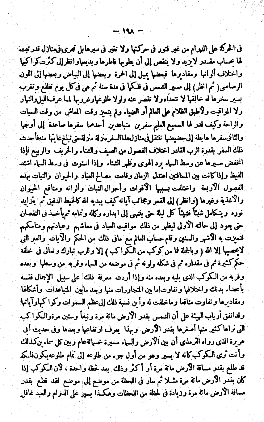 فِي الْحَرَكَة على الدَّوَام من غير فتور فِي حركتها وَلَا تغير فِي سَيرهَا بلت جري فِي منَازِل قد رتبت لَهَا بِحِسَاب مُقَدّر لَا يزِيد وَلَا ينقص الى ان يطويها فاطرها وبديعها وَانْظُر الى كثرت كواكبها وَاخْتِلَاف الوانها ومقاديرها فبعضها يمِيل الى الْحمرَة وَبَعضهَا الى البيضا وَبَعضهَا الى اللَّوْن الرصاصي ثمَّ انْظُر الى مسير الشَّمْس فِي فلكها فِي مُدَّة سنة ثمَّ هِيَ فِي كل يَوْم تطلع وتغرب بسير سخرها لَهُ خَالِقهَا لَا تتعداه وَلَا تقصر عَنهُ وَلَوْلَا طُلُوعهَا وغروبهالما عرف اللَّيْل وَالنَّهَار وَلَا الْمَوَاقِيت ولاطبق الظلام على الْعَالم اَوْ الضياء وَلم يتَمَيَّز وَقت المعاش من وَقت السبات والراحة وَكَيف قدر لَهَا السَّمِيع الْعَلِيم سفرينمتباعدين احدهما سفرها صاعدة الى اوجها وَالثَّانِي سفرها هابطة الى حضيضها تنْتَقل فِي منَازِل هَذَا السّفر منزلَة منزلَة حَتَّى تبلغ غايتها مِنْهُ فاحدث ذَلِك السّفر بقدرة الرب الْقَادِر اخْتِلَاف الْفُصُول من الصَّيف والشتاء والخريف وَالربيع فَإِذا انخفض سَيرهَا عَن وسط السَّمَاء برد الْهَوَاء وَظهر الشتَاء وَإِذا اسْتَوَت فِي وسط السَّمَاء اشْتَدَّ القيظ وَإِذا كَانَت بَين المسافتين اعتدل الزَّمَان وَقَامَت مصَالح الْعباد وَالْحَيَوَان والنبات بِهَذِهِ الْفُصُول الاربعة وَاخْتلفت بِسَبَبِهَا الاقوات واحوال النَّبَات والوانه وَمَنَافع الْحَيَوَان والاغذية وَغَيرهَا وَانْظُر الى الْقَمَر وعجائب آيَاته كَيفَ يبديه الله كالخيط الدَّقِيق ثمَّ يتزايد نوره ويتكامل شَيْئا فَشَيْئًا كل لَيْلَة حَتَّى يَنْتَهِي الى ابداره وكماله وَتَمَامه ثمَّ يَأْخُذ فِي النُّقْصَان حَتَّى يعود الى حَالَته الاولى ليظْهر من ذَلِك مَوَاقِيت الْعباد فِي معاشهم وعبادتهم ومناسكهم فتميزت بِهِ الاشهر والسنين وَقَامَ حِسَاب الْعَالم مَعَ مَا فِي ذَلِك من الحكم والايات والعبر الَّتِي لَا يحصيها الا الله وَبِالْجُمْلَةِ فَمَا من كَوْكَب من الْكَوَاكِب الا وللرب تبَارك وَتَعَالَى فِي خلقه حكم كَثِيرَة ثمَّ فِي مِقْدَاره ثمَّ فِي شكله ولونه ثمَّ فِي مَوْضِعه من السَّمَاء وقربه من وَسطهَا وَبعده وقربه من الْكَوْكَب الَّذِي يَلِيهِ وَبعده مِنْهُ وَإِذا اردت معرفَة ذَلِك على سَبِيل الاجمال فقسه باعضاء بدنك واختلافها وتفاوت اما بَين المتجاورات مِنْهَا وَبعد مَا بَين المتباعدات وأشكالها ومقاديرها وتفاوت منافعا وَمَا خلقت لَهُ وَأَيْنَ نِسْبَة ذَلِك الى عظم السَّمَوَات وكواكبها وآياتها وَقد اتّفق أَرْبَاب الْهَيْئَة على ان الشَّمْس بِقدر الارض مائَة مرّة ونيفا وَسِتِّينَ مرّة وَالْكَوَاكِب الَّتِي نرَاهَا كثير مِنْهَا اصغرها بِقدر الارض وَبِهَذَا يعرف ارتفاعها وَبعدهَا وَفِي حَدِيث ابي هُرَيْرَة الَّذِي رَوَاهُ التِّرْمِذِيّ ان بَين الارض وَالسَّمَاء مسيرَة خَمْسمِائَة عَام وَبَين كل سماءين كَذَلِك وانت ترى الْكَوْكَب كانه لَا يسير وَهُوَ من اول جُزْء من طلوعه الى تَمام طلوعه يكون فلكه قد طلع بِقدر مَسَافَة الارض مائَة مرّة اَوْ اكثر وَذَلِكَ بعد لَحْظَة وَاحِدَة لَان الْكَوْكَب إِذا كَانَ بِقدر الارض مائَة مرّة مثلا ثمَّ سَار فِي اللحظة من مَوضِع الى مَوضِع فقد قطع بِقدر مَسَافَة الارض مائَة مرّة وَزِيَادَة فِي لَحْظَة من اللحظات وَهَكَذَا يسير على الدَّوَام وَالْعَبْد غافل