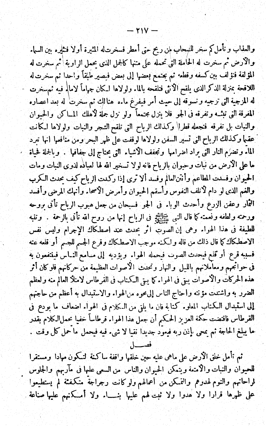 وَالْعَذَاب وَتَأمل كم سخر للسحاب من ريح حَتَّى امطر فسخرت لَهُ المثيرة اولا فتثيره بَين السَّمَاء والارض ثمَّ سخرت لَهُ الحاملة الَّتِي تحمله على متنها كَالْجمَلِ الَّذِي يحمل الراوية ثمَّ سخرت لَهُ الْمُؤَلّفَة فتؤلف بَين كسفه وقطعه ثمَّ يجْتَمع بَعْضهَا الى بعض فَيصير طبقًا وَاحِدًا ثمَّ سخرت لَهُ اللاقحة بِمَنْزِلَة الذّكر الَّذِي يلقح الانثى فتلقحه بِالْمَاءِ ولولاها لَكَانَ جهاما لَا مَاء فِيهِ ثمَّ سخرت لَهُ المزجية الَّتِي تزجيه وتسوقه الى حَيْثُ أَمر فيفرغ مَاءَهُ هُنَالك ثمَّ سخرت لَهُ بعد اعصاره المفرقة الَّتِي تبثه وتفرقه فِي الجو فَلَا ينزل مجتمعا وَلَو نزل جملَة لأهْلك المساكن وَالْحَيَوَان والنبات بل تفرقه فتجعله قطرا وَكَذَلِكَ الرِّيَاح الَّتِي تلقح الشّجر والنبات ولولاها لكَانَتْ عقيما وَكَذَلِكَ الرِّيَاح الَّتِي تسير السفن ولولاها لوقفت على ظهر الْبَحْر وَمن مَنَافِعهَا انها تبرد المَاء وتضرم النَّار الَّتِي يُرَاد اضرامها وتجفف الاشياء الَّتِي يحْتَاج الى جفافها وَبِالْجُمْلَةِ فحياة مَا على الارض من نَبَات وحيوان بالرياح فَإِنَّهُ لَوْلَا تسخير الله لَهَا لِعِبَادِهِ لِذَوي النَّبَات وَمَات الْحَيَوَان وفسدت المطاعم وأنتن الْعَالم وَفَسَد الا ترى اذا ركدت الرِّيَاح كَيفَ يحدث الكرب وَالْغَم الَّذِي لَو دَامَ لأتلف النُّفُوس واسقم الْحَيَوَان وامرض الاصحاء وانهك المرضى وافسد الثِّمَار وعفن الزَّرْع واحدث الوباء فِي الجو فسبحان من جعل هبوب الرِّيَاح تَأتي بِرُوحِهِ وَرَحمته ولطفه وَنعمته كَمَا قَالَ النَّبِي فِي الرِّيَاح إِنَّهَا من روح الله تَأتي بِالرَّحْمَةِ وتنبه للطيفة فِي هَذَا الْهَوَاء وَهِي ان الصَّوْت اثر يحدث عِنْد اصطكاك الاجرام وَلَيْسَ نفس الاصطكاك كَمَا قَالَ ذَلِك من قَالَه وَلكنه مُوجب الاصطكاك وقرع الْجِسْم للجسم اَوْ قلعة عَنهُ فسببه قرع اَوْ قلع فَيحدث الصَّوْت فيحمله الْهَوَاء ويؤديه الى مَا مَعَ النَّاس فينتفعون بِهِ فِي حوائجهم ومعاملاتهم بِاللَّيْلِ وَالنَّهَار وتحدث الاصوات الْعَظِيمَة من حركاتهم فَلَو كَانَ اثر هَذِه الحركات والاصوات يبْقى فِي الْهَوَاء كَمَا يبْقى الْكتاب فِي القرطاس لامتلأ الْعَالم مِنْهُ ولعظم الضَّرَر بِهِ واشتدت مُؤْنَته وَاحْتَاجَ النَّاس الى محوه من الْهَوَاء والاستبدال بِهِ اعظم من حَاجتهم الى استبدال الْكتاب المملوء كِتَابَة فان مَا يلقى من الْكَلَام فِي الْهَوَاء اضعاف مَا يوضع فِي القرطاس فاقتضت حِكْمَة الْعَزِيز الْحَكِيم ان جعل هَذَا الْهَوَاء قرطاسا خفِيا يحمل الْكَلَام بِقدر مَا يبلغ الْحَاجة ثمَّ يمحي باذن ربه فَيَعُود جَدِيدا نقيا لَا شَيْء فِيهِ فَيحمل مَا حمل كل وَقت