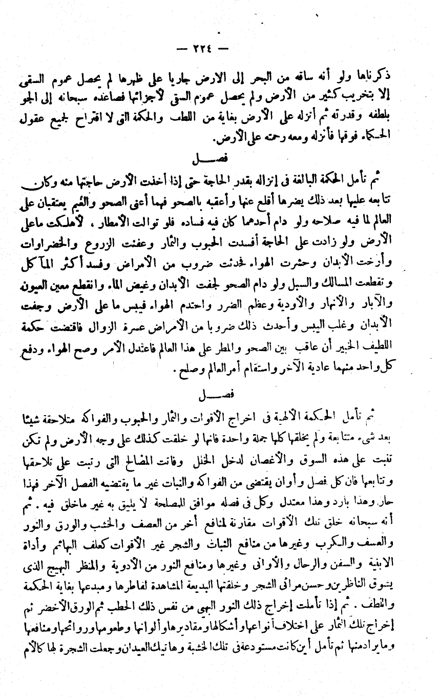 الارض حَاجَتهَا مِنْهُ وَكَانَ تتابعه عَلَيْهَا بعد ذَلِك يَضرهَا اقلع عَنْهَا واعقبه بالصحو فهما اعني الصحو والغيم يعتقبان على الْعَالم لما فِيهِ صَلَاحه وَلَو دَامَ احدهما كَانَ فِيهِ فَسَاده فَلَو توالت الامطار لاهلكت مَا عَليّ الارض وَلَو زَادَت على الْحَاجة افسدت الْحُبُوب وَالثِّمَار وعفنت الزروع والخضروات وأرخت الابدان وحشرت الْهَوَاء فَحدثت ضروب من الامراض وَفَسَد اكثر المآكل وتقطعت المسالك والسبل وَلَو دَامَ الصحو لجفت الابدان وغيض المَاء وَانْقطع معِين الْعُيُون والابار والانهار والاودية وَعظم الضَّرَر واحتدم الْهَوَاء فيبس مَا على الارض وجفت الابدان وَغلب اليبس واحدث ذَلِك ضروبا من الامراض عسرة الزَّوَال فاقتضت حِكْمَة اللَّطِيف الْخَبِير ان عاقب بَين الصحو والمطر على هَذَا الْعَالم فاعتدل الامر وَصَحَّ الْهَوَاء وَدفع كل وَاحِد مِنْهُمَا عَادِية الاخر واستقام امْر الْعَالم وَصلح