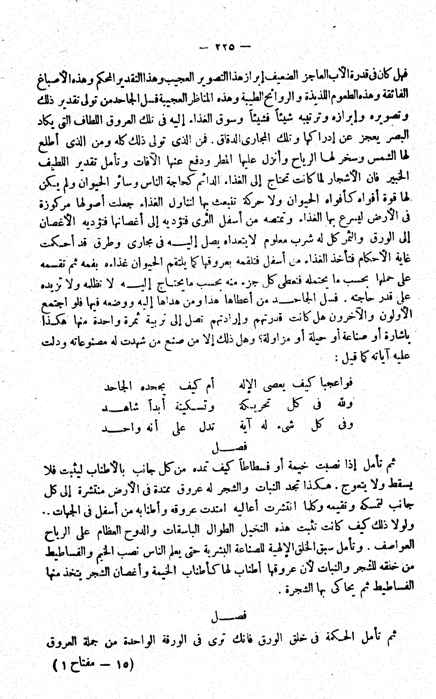 فَهَل كَانَ فِي قدرَة الاب الْعَاجِز الضَّعِيف إبراز هَذَا التَّصْوِير العجيب وَهَذَا التَّقْدِير الْمُحكم وَهَذِه الاصباغ الفائقة وَهَذِه الطعوم اللذيذة والروائح الطّيبَة وَهَذِه المناظر العجيبة فسل الجاحد من تولى تَقْدِير ذَلِك وتصيره وإبرازه وترتيبه شَيْئا فَشَيْئًا وسوق الْغذَاء اليه فِي تِلْكَ الْعُرُوق اللطاف الَّتِي يكَاد الْبَصَر يعجز عَن إِدْرَاكهَا وَتلك المجاري الدقاق فَمن الَّذِي تولى ذَلِك كُله وَمن الَّذِي اطلع لَهَا الشَّمْس وسخر لَهَا الرِّيَاح وَأنزل عَلَيْهَا الْمَطَر وَدفع عَنْهَا الافات وتامل تَقْدِير اللَّطِيف الْخَبِير فَإِن الاشجار لما كَانَت تحْتَاج الى الْغذَاء الدَّائِم كحاجة النَّاس وَسَائِر الْحَيَوَان وَلم يكن لَهَا قُوَّة أَفْوَاه كافواه الْحَيَوَان وَلَا حَرَكَة تنبعث بهَا لتناول الْغذَاء جعلت اصولها مركوزة فِي الارض ليسرع بهَا الْغذَاء وتمتصه من اسفل الثرى فتؤديه الى أَغْصَانهَا فتؤديه الاغصان الى الْوَرق وَالثَّمَر كل لَهُ شرب مَعْلُوم لَا يتعداه يصل اليه فِي مجاري وطرق قد احكمت غَايَة الاحكام فتأخذ الْغذَاء من اسفل فتلقمه بعروقها كَمَا يلتقم الْحَيَوَان غذاءه بفمه ثمَّ تقسمه على حملهَا بِحَسب مَا يحْتَملهُ فتعطى كل جُزْء مِنْهُ بِحَسب مَا يحْتَاج اليه لَا تظلمه وَلَا تزيده على قدر حَاجته فسل الجاحد من اعطاها هَذَا وَمن هداها اليه وَوَضعه فِيهَا فَلَو اجْتمع الاولون والاخرون هَل كَانَت قدرتهم وإرادتهم تصل الى تربية ثَمَرَة وَاحِدَة مِنْهَا هَكَذَا باشارة اَوْ نصاعة اَوْ حِيلَة اَوْ مزاولة وَهل ذَلِك الا من صنع من شهِدت لَهُ مصنوعاته دلّت عَلَيْهِ آيَاته كَمَا قيل: