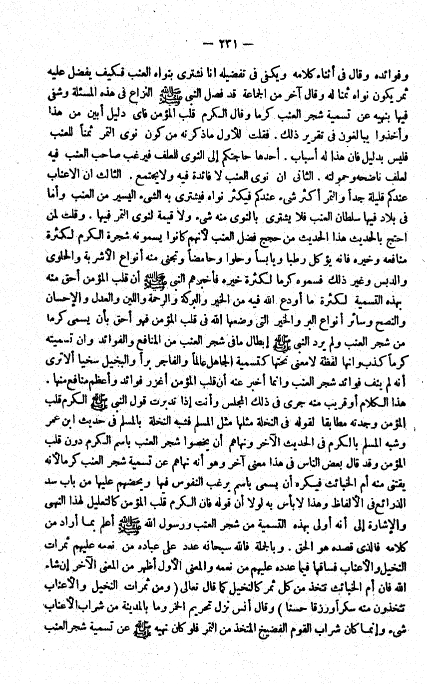 وفوائده وَقَالَ فِي أثْنَاء كَلَامه وَيَكْفِي فِي تفضيله انا نشتري بنواه الْعِنَب فَكيف يفضل عَلَيْهِ ثَمَر يكون نَوَاه ثمنا لَهُ وَقَالَ آخر من الْجَمَاعَة قد فصل النَّبِي النزاع فِي هَذِه المسئلة وشفى فِيهَا بنهيه عَن تَسْمِيَة شجر الْعِنَب كرما وَقَالَ الْكَرم قلب الْمُؤمن فاي دَلِيل ابين من هَذَا واخذوا يبالغون فِي تَقْرِير ذَلِك فَقلت للْأولِ مَا ذكرته من كَون نوى التَّمْر ثمنا للعنب فَلَيْسَ بِدَلِيل فَإِن هَذَا لَهُ اسباب احدها حَاجَتكُمْ الى النَّوَى للعلف فيرغب صَاحب الْعِنَب فِيهِ لعلف نَاضِحَهُ وحمولته الثَّانِي ان نوى الْعِنَب لَا فَائِدَة فِيهِ وَلَا يجْتَمع الثَّالِث ان الاعناب عنْدكُمْ قَليلَة جدا وَالتَّمْر اكثر شَيْء عنْدكُمْ فيكثر نَوَاه فيشترى بِهِ الشَّيْء الْيَسِير من الْعِنَب وَأما فِي بِلَاد فِيهَا سُلْطَان الْعِنَب فَلَا يشترى بالنوى مِنْهُ شَيْء وَلَا قيمَة لنوى التَّمْر فِيهَا وَقلت لمن احْتج بِالْحَدِيثِ هَذَا الحَدِيث من حجج فضل الْعِنَب لانهم كَانُوا يسمونه شَجَرَة الْكَرم لِكَثْرَة مَنَافِعه وخيره فَإِنَّهُ يُؤْكَل رطبا ويابسا وحلوا وحامضا وتجنى مِنْهُ أَنْوَاع الاشربة والحلوى والدبس وَغير ذَلِك فَسَموهُ كرما لِكَثْرَة خَيره فَأخْبرهُم النَّبِي ان قلب الْمُؤمن احق مِنْهُ بِهَذِهِ التَّسْمِيَة لِكَثْرَة مَا اودع الله فِيهِ من الْخَيْر وَالْبركَة وَالرَّحْمَة واللين وَالْعدْل والاحسان والنصح وَسَائِر انواع الْبر وَالْخَيْر الَّتِي وَضعهَا الله فِي قلب الْمُؤمن فَهُوَ احق بِأَن يُسمى كرما من شجر الْعِنَب وَلم يرد النَّبِي ابطال مَا فِي شجر الْعِنَب من الْمَنَافِع والفوائد وان تمسيته كرما كذب وانها لَفْظَة لَا معنى تحتهَا كتسمية الْجَاهِل عَالما والفاجر برا والبخيل سخيا الا ترى انه لم ينف فَوَائِد شجر الْعِنَب وَإِنَّمَا اخبر عَنهُ ان قلب الْمُؤمن اغزر فَوَائِد واعظم مَنَافِع مِنْهَا هَذَا الْكَلَام اَوْ قريب مِنْهُ جرى فِي ذَلِك الْمجْلس وَأَنت إِذا تدبرت قَول النَّبِي الْكَرم قلب الْمُؤمن وجدته مطابقا لقَوْله فِي النَّخْلَة مثلهَا مثل الْمُسلم فَشبه النَّخْلَة بِالْمُسلمِ فِي حَدِيث ابْن عمر وَشبه الْمُسلم بِالْكَرمِ فِي الحَدِيث الاخر ونهاهم ان يخصوا شجر الْعِنَب باسم الْكَرم دون قلب الْمُؤمن وَقد قَالَ بعض النَّاس فِي هَذَا معنى آخر وَهُوَ انه نَهَاهُم عَن تَسْمِيَة شجر الْعِنَب كرما لانه يقتنى مِنْهُ ام الْخَبَائِث فَيكْرَه ان يُسمى باسم يرغب النُّفُوس فِيهَا ويحضهم عَلَيْهَا من بَاب سد الذرائع فِي الالفاظ وَهَذَا لَا بَأْس بِهِ لَوْلَا ان قَوْله فَإِن الْكَرم قلب الْمُؤمن كالتعليل لهَذَا النَّهْي والاشارة الى انه اولى بِهَذِهِ التَّسْمِيَة من شجر الْعِنَب وَرَسُول الله اعْلَم بِمَا اراد من كَلَامه فَالَّذِي قَصده هُوَ الْحق وَبِالْجُمْلَةِ فَالله سُبْحَانَهُ عدد على عباده من نعمه عَلَيْهِم ثَمَرَات النخيل والاعناب فساقها فِيمَا عدده عَلَيْهِم من نعمه وَالْمعْنَى الاول اظهر من الْمَعْنى الاخر إِن شَاءَ الله فَإِن أم الْخَبَائِث تتَّخذ من كل ثَمَر كالنخيل كَمَا قَالَ تَعَالَى {وَمن ثَمَرَات النخيل وَالْأَعْنَاب تَتَّخِذُونَ مِنْهُ سكرا وَرِزْقًا حسنا} وَقَالَ انس نزل تَحْرِيم الْخمر وَمَا بِالْمَدِينَةِ من شراب الاعناب شَيْء وَإِنَّمَا كَانَ شراب الْقَوْم الفضيخ الْمُتَّخذ من التَّمْر فَلَو كَانَ نَهْيه عَن تَسْمِيَة شجر الْعِنَب