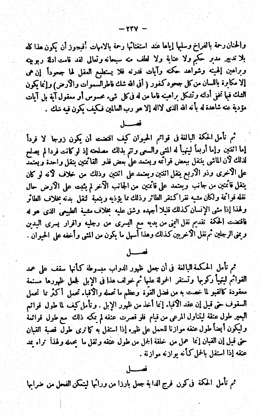 فصل ثمَّ تَأمل الْحِكْمَة الْبَالِغَة فِي قَوَائِم الْحَيَوَان كَيفَ اقْتَضَت ان يكون