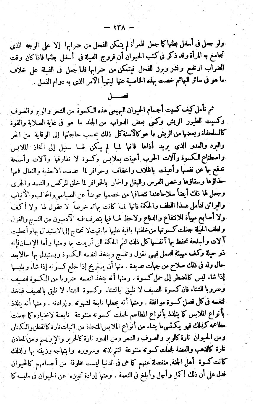 فصل ثمَّ تَأمل كَيفَ كُسِيت اجسام الْحَيَوَان البهيمي هَذِه الْكسْوَة من الشّعْر