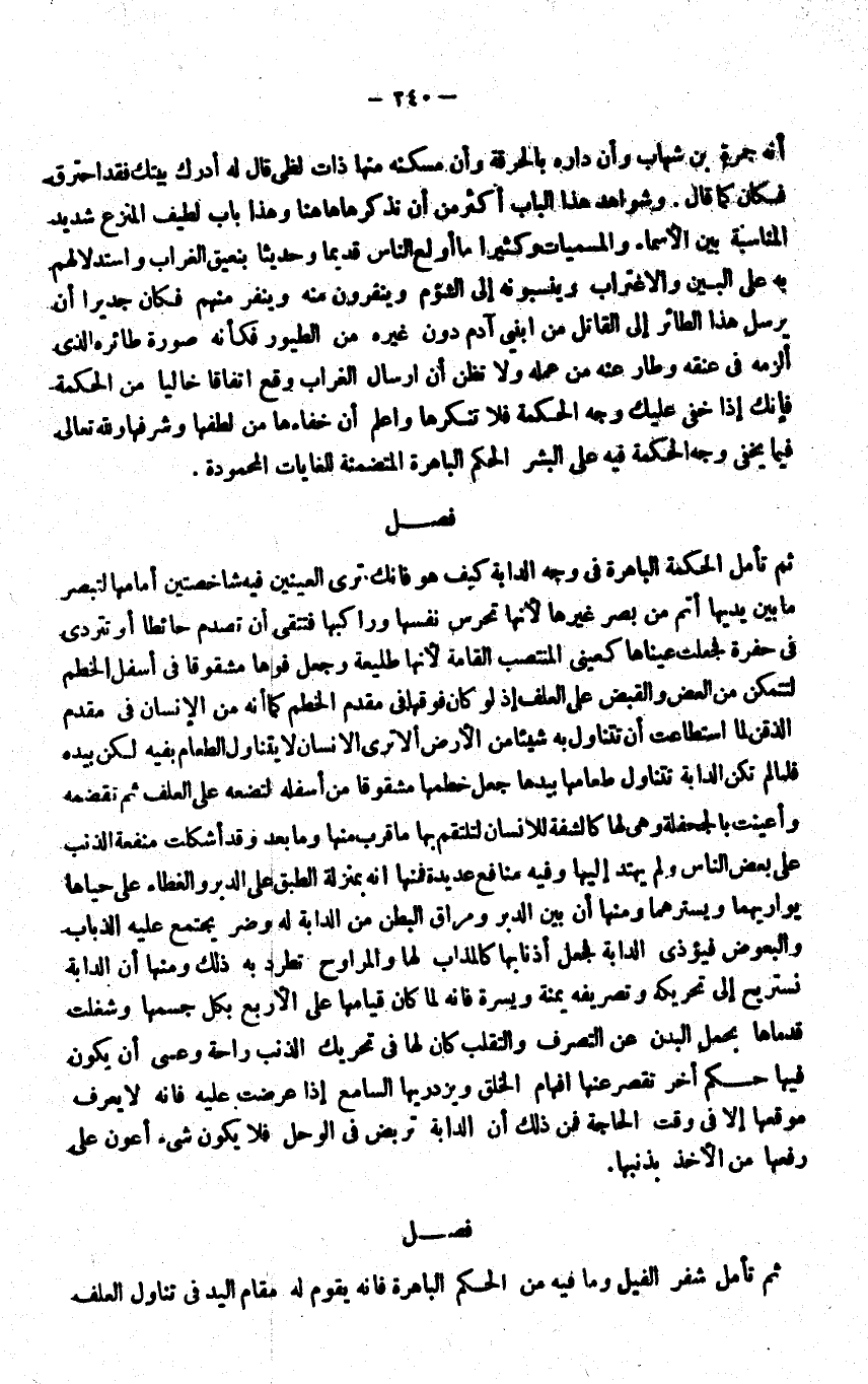 فِيهِ شاخصتين امامها لتبصر مَا بَين يَديهَا اتم من بصر غَيرهَا لانها تحرس نَفسهَا وراكبها فتتقى ان تصدم حَائِطا اَوْ تتردى فِي حُفْرَة فَجعلت عَيناهَا كعيني المنتصب الْقَامَة لانها طَلِيعَة وَجعل فوها مشقوقا فِي اسفل الخطم لتتمكن من العض وَالْقَبْض على الْعلف إِذْ لَو كَانَ فَوْقهَا فِي مقدم الخطم كَمَا انه من الانسان فِي مقدم الذقن لما استطاعت ان تتَنَاوَل بِهِ شَيْئا من الارض الا ترى الانسان لَا تنَاول الطَّعَام بِفِيهِ لَكِن بِيَدِهِ فلمالم تكن الدَّابَّة تتَنَاوَل طعامها بِيَدِهَا جعل خطمها مشقوقا من أَسْفَله لتضعه على الْعلف ثمَّ تقضمه واعينت بالجحفلة وَهِي لَهَا كالشفة للانسان لتلتقم بهَا مَا قرب مِنْهَا وَمَا بعد وَقد اشكلت مَنْفَعَة الذَّنب على بعض النَّاس وَلم يهتد اليها وَفِيه مَنَافِع عديدة فَمِنْهَا انه بِمَنْزِلَة الطَّبَق على الدبر والغطاء على حياها يواريهما ويسترهما وَمِنْهَا ان بَين الدبر ومراق الْبَطن من الدَّابَّة لَهُ وضر يجْتَمع عَلَيْهِ الذُّبَاب والبعوض فيؤذي الدَّابَّة فَجعل اذنابها كالمذاب لَهَا والمراوح تطرد بِهِ ذَلِك وَمِنْهَا ان الدَّابَّة نستريح الى تحريحكه وتصريفه يمنة ويسرة فَإِنَّهُ لما كَانَ قِيَامهَا على الاربع بِكُل جسمها وشغلت قدماها بِحمْل الْبدن عَن التَّصَرُّف والتقلب كَانَ لَهَا فِي تَحْرِيك الذَّنب رَاحَة وَعَسَى ان يكون فِيهَا حكم اخر تقصر عَنْهَا افهام الْخلق ويزدريها السَّابِع إِذا عرضت عَلَيْهِ فَإِنَّهُ لَا يعرف موقعها الا فِي وَقت الْحَاجة فَمن ذَلِك ان الدَّابَّة تربض فِي الوحل فَلَا يكون شَيْء اعون على رَفعهَا من الاخذ بذنبها