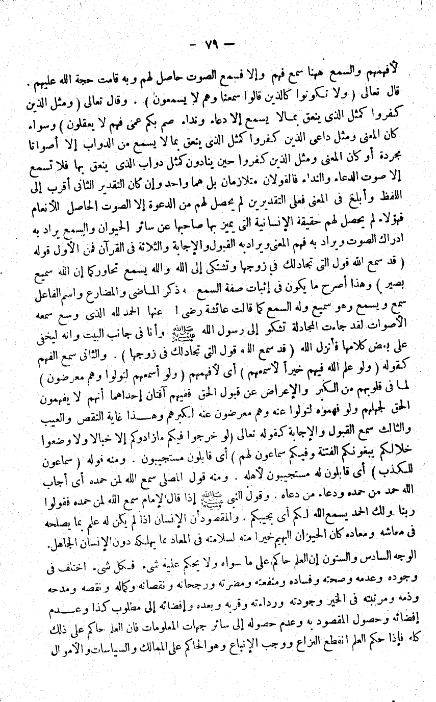 لافهمهم والسمع هَهُنَا سمع فهم والا فَسمع الصَّوْت حَاصِل لَهُم وَبِه قَامَت حجَّة الله عَلَيْهِم قَالَ تَعَالَى وَلَا تَكُونُوا كَالَّذِين قَالُوا سمعنَا وهم لَا يسمعُونَ وَقَالَ تَعَالَى وَمثل الَّذين كفرُوا كَمثل الَّذِي ينعق بمالا يسمع الا دُعَاء ونداء صم بكم عمى فهم لَا يعْقلُونَ وَسَوَاء كَانَ الْمَعْنى وَمثل دَاعِي الَّذين كفرُوا كَمثل الَّذِي ينعق بِمَا لَا يسمع من الدَّوَابّ إِلَّا اصواتا مُجَرّدَة اَوْ كَانَ الْمَعْنى وَمثل الَّذين كفرُوا حِين ينادون كَمثل دَوَاب الَّذِي ينعق بهَا فَلَا تسمع الا صَوت الدُّعَاء والنداء فالقولان متلازمان بل هما وَاحِد وَإِن كَانَ التَّقْدِير الثَّانِي اقْربْ إِلَى اللَّفْظ وأبلغ فِي الْمَعْنى فعلى التَّقْدِيرَيْنِ لم يحصل لَهُم من الدعْوَة إِلَّا الصَّوْت الْحَاصِل للأنعام فَهَؤُلَاءِ لم يحصل لَهُم حَقِيقَة الانسانية الَّتِي يُمَيّز بهَا صَاحبهَا عَن سَائِر الْحَيَوَان والسمع يُرَاد بِهِ ادراك الصَّوْت وَيُرَاد بِهِ فهم الْمَعْنى وَيُرَاد بِهِ الْقبُول والاجابة وَالثَّلَاثَة فِي الْقُرْآن فَمن الاول قَوْله قد سمع الله قَول الَّتِي تُجَادِلك فِي زَوجهَا وتشتكي الى الله وَالله يسمع تحاوركما إِن الله سميع بَصِير وَهَذَا اصرح مَا يكون فِي إِثْبَات صفة السّمع ذكر الْمَاضِي والمضارع وَاسم الْفَاعِل سمع وَيسمع وَهُوَ سميع وَله السّمع كَمَا قَالَت عَائِشَة رضى الله عَنْهَا الْحَمد لله الَّذِي وسع سَمعه الاصوات لقد جَاءَت المجادلة تَشْكُو إِلَى رَسُول الله وَأَنا فِي جَانب الْبَيْت وَأَنه ليخفى على بعض كَلَامهَا فَأنْزل الله قد سمع الله قَول الَّتِي تُجَادِلك فِي زَوجهَا وَالثَّانِي سمع الْفَهم كَقَوْلِه وَلَو علم الله فيهم خيرا لاسمعهم أَي لافهمهم وَلَو اسمعهم لتولوا وهم معرضون لما فِي قُلُوبهم من الْكبر والاعراض عَن قبُول الْحق ففيهم آفتان إِحْدَاهمَا انهم لَا يفهمون الْحق لجهلهم وَلَو فهموه لتولوا عَنهُ وهم معرضون عَنهُ لكبرهم وَهَذَا غَايَة النَّقْص وَالْعَيْب وَالثَّالِث سمع الْقبُول والاجابة كَقَوْلِه تَعَالَى لَو خَرجُوا فِيكُم مَا زادوكم إِلَّا خبالا وَلَا وضعُوا خلالكم يبغونكم الْفِتْنَة وَفِيكُمْ سماعون لَهُم أَي قابلون مستجيبون وَمِنْه قَوْله سماعون للكذب أَي قابلون لَهُ مستجيبون لاهله وَمِنْه قَول الْمصلى سمع الله لمن حَمده أَي اجاب الله حمد من حَمده وَدُعَاء من دَعَاهُ وَقَول النَّبِي إِذا قَالَ الامام سمع الله لمن حَمده فَقولُوا رَبنَا وَلَك الْحَمد يسمع الله لكم أَي يجيبكم وَالْمَقْصُود ان الانسان إِذا لم يكن لَهُ علم بِمَا يصلحه فِي معاشه ومعاده كَانَ الْحَيَوَان البهيم خيرا مِنْهُ لسلامته فِي الْمعَاد مِمَّا يهلكه دون الانسان الْجَاهِل الْوَجْه السَّادِس وَالسِّتُّونَ إِن الْعلم حَاكم على مَا سواهُ وَلَا يحكم عَلَيْهِ شَيْء فَكل شَيْء اخْتلف فِي وجوده وَعَدَمه وَصِحَّته وفساده ومنفعته ومضرته ورجحانه ونقصانه وكماله ونقصه ومدحه وذمه ومرتبته فِي الْخَيْر وجودته ورداءته وقربه وَبعده وإفضائه إِلَى مَطْلُوب كَذَا وَعدم إفضائه وَحُصُول الْمَقْصُود بِهِ وَعدم حُصُوله إِلَى سَائِر جِهَات المعلومات فَإِن الْعلم حَاكم على ذَلِك كُله فَإِذا حكم الْعلم انْقَطع النزاع وَوَجَب الِاتِّبَاع وَهُوَ الْحَاكِم على الممالك والسياسات والاموال