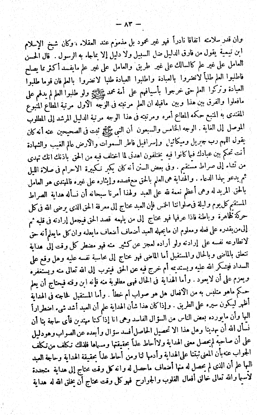 وان قدر سَلَامَته اتِّفَاقًا نَادرا فَهُوَ غير مَحْمُود بل مَذْمُوم عِنْد الْعُقَلَاء وَكَانَ شيخ الاسلام ابْن تَيْمِية يَقُول من فَارق الدَّلِيل ضل السَّبِيل وَلَا دَلِيل إِلَّا بِمَا جَاءَ بِهِ الرَّسُول قَالَ الْحسن الْعَامِل على غير علم كالسالك على غير طَرِيق وَالْعَامِل على غير علم مَا يفْسد اكثر مِمَّا يصلح فَاطْلُبُوا اللم طلبا لَا تضروا بِالْعبَادَة واطلبوا الْعِبَادَة طلبا لَا تضروا بِالْعلمِ فَإِن قوما طلبُوا الْعِبَادَة وَتركُوا الْعلم حى خَرجُوا بِأَسْيَافِهِمْ على امة مُحَمَّد وَلَو طلبُوا الْعلم لم يدلهم على مَا فعلوا وَالْفرق بَين هَذَا وَبَين مَا قبله ان الْعلم مرتبته فِي الْوَجْه الاول مرتبَة المطاع الْمَتْبُوع المقتدى بِهِ المتبع حكمه المطاع امْرَهْ ومرتبته فِيهِ فيهذا الْوَجْه مرتبَة الدَّلِيل المرشد الى الْمَطْلُوب الْموصل إِلَى الْغَايَة الْوَجْه الْخَامِس وَالسَّبْعُونَ ان النَّبِي ثَبت فِي الصَّحِيحَيْنِ عَنهُ انه كَانَ يَقُول اللَّهُمَّ رب جِبْرِيل وَمِيكَائِيل وإسرافيل فاطر السَّمَوَات والارض عَالم الْغَيْب وَالشَّهَادَة انت تحكم بَين عِبَادك فِيمَا كَانُوا فِيهِ يَخْتَلِفُونَ اهدني لما اخْتلف فِيهِ من الْحق باذنك انك تهدى من تشَاء الى صِرَاط مُسْتَقِيم وَفِي بعض السّنَن انه كَانَ يكبر تَكْبِيرَة الاحرام فِي صَلَاة اللَّيْل ثمَّ يَدْعُو بِهَذَا الدُّعَاء وَالْهِدَايَة هِيَ الْعلم بِالْحَقِّ مَعَ قَصده وإيثاره على غَيره فالمهتدي هُوَ الْعَامِل بِالْحَقِّ المريد لَهُ وَهِي اعظم نعْمَة لله على العَبْد وَلِهَذَا امرنا سُبْحَانَهُ ان نَسْأَلهُ هِدَايَة الصِّرَاط الْمُسْتَقيم كل يَوْم وَلَيْلَة فِي صلواتنا الْخمس فَإِن العَبْد مُحْتَاج الى معرفَة الْحق الَّذِي يرضى الله فِي كل حَرَكَة غاهرة وباطنة فَإِذا عرفهَا فَهُوَ مُحْتَاج إِلَى من يلهمه قصد الْحق فَيجْعَل إِرَادَته فِي قلبه ثمَّ إِلَى من يقدره على فعله وَمَعْلُوم ان مَا يجهله العَبْد اضعاف اضعاف مَا يُعلمهُ وَإِن كل مَا يعلم انه حق لَا تطاوعه نَفسه على غرادته وَلَو اراده لعجز عَن كثير مِنْهُ فَهُوَ مُضْطَر كل وَقت إِلَى هِدَايَة تتَعَلَّق بالماضي وبالحال والمستقبل أما الْمَاضِي فَهُوَ مُحْتَاج إِلَى محاسبة نَفسه عَلَيْهِ وَهل وَقع على السداد فيشكر الله عَلَيْهِ ويستديمه ام خرج فِيهِ عَن الْحق فيتوب إِلَى الله تَعَالَى مِنْهُ ويتسغفره ويعزم على ان لَا يعود وَأما الْهِدَايَة فِي الْحَال فَهِيَ مَطْلُوبَة مِنْهُ فَإِنَّهُ ابْن وقته فَيحْتَاج ان يعلم حكم مَا هُوَ متلبس بِهِ من الافعال هَل هُوَ صَوَاب ام خطأ وَأما الْمُسْتَقْبل فحاجته فِي الْهِدَايَة اظهر ليَكُون سيره على الطَّرِيق وَإِذا كَانَ هَذَا شَأْن الْهِدَايَة علم ان العَبْد اشد شَيْء اضطرارا اليها وان مَا يُورِدهُ بعض النَّاس من السُّؤَال الْفَاسِد وَهِي انا إِذا كُنَّا مهتدين فَأَي حَاجَة بِنَا ان نسْأَل الله ان يهدينا وَهل هَذَا الا تَحْصِيل الْحَاصِل افسد سُؤال وابعده عَن الصَّوَاب وَهُوَ دَلِيل على ان صَاحبه لم يحصل معنى الْهِدَايَة وَلَا احاط علما بحقيقتها ومسماها فَلذَلِك تكلّف من تكلّف الْجَواب عَنهُ بَان الْمَعْنى ثبتنا على الْهِدَايَة وادمها لنا وَمن احاط علما بحقية الْهِدَايَة وحاجة العَبْد اليها علم ان الَّذِي لم يحصل لَهُ مِنْهَا اضعاف مَا حصل لَهُ انه كل وَقت مُحْتَاج إِلَى هِدَايَة متجددة لاسيما وَالله تَعَالَى خَالق افعال الْقُلُوب والجوارح فَهُوَ كل وَقت مُحْتَاج ان يخلق الله لَهُ هِدَايَة