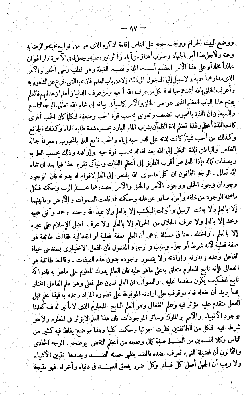 وَوضع الْبَيْت الْحَرَام وَوَجَب حجه على النَّاس إِقَامَة لذكره الَّذِي هُوَ من تَوَابِع محبته وَالرِّضَا بِهِ وَعنهُ ولاجل هَذَا امْر بِالْجِهَادِ وَضرب اعناق من اباه وآثر غَيره عَلَيْهِ وَجعل لَهُ فِي الاخرة دَار الهوان خَالِدا مخلدا وعَلى هَذَا الامر الْعَظِيم اسست الْملَّة ونصبت الْقبْلَة وَهُوَ قطب رحى الْخلق والامر الَّذِي مدارهما عَلَيْهِ ولاسبيل إِلَى الدُّخُول إِلَى ذَلِك إِلَّا من بَاب الْعلم فَإِن محبَّة الشَّيْء فرع عَن الشُّعُور بِهِ واعرف الْخلق بِاللَّه اشدهم حبا لَهُ فَكل من عرف الله احبه وَمن عرف الدُّنْيَا واهلها زهد فيهم فالعلم يفتح هَذَا الْبَاب الْعَظِيم الَّذِي هُوَ سر الْخلق وَالْأَمر كَمَا سَيَأْتِي بَيَانه إِن شَاءَ الله تَعَالَى الْوَجْه التَّاسِع وَالسَّبْعُونَ ان اللَّذَّة بالمحبوب تضعف وتقوى بِحَسب قُوَّة الْحبّ وَضَعفه فَكلما كَانَ الْحبّ اقوى كَانَت اللَّذَّة اعظم وَلِهَذَا تعظم لَذَّة الظمآن بِشرب المَاء الْبَارِد بِحَسب شدَّة طلبه للْمَاء وَكَذَلِكَ الجائع وَكَذَلِكَ من احب شَيْئا كَانَت لذته على قدر حبه إِيَّاه وَالْحب تَابع للْعلم بالمحبوب وَمَعْرِفَة جماله الظَّاهِر وَالْبَاطِن فلذة النّظر إِلَى الله بعد لِقَائِه بِحَسب قُوَّة حبه وإرادته وَذَلِكَ بِحَسب الْعلم بِهِ وبصفات كَمَاله فَإِذا الْعلم هُوَ اقْربْ الطّرق إِلَى اعظم اللَّذَّات وَسَيَأْتِي تَقْرِير هَذَا فِيمَا بعد ان شَاءَ الله تَعَالَى الْوَجْه الثَّمَانُونَ ان كل مَا سوى الله يفْتَقر الى الْعلم لاقوام لَهُ بِدُونِهِ فَإِن الْوُجُود وجودان وجود الْخلق وَوُجُود الامر والخلق وَالْأَمر مصدرهما علم الرب وحكمته فَكل ماضمه الْوُجُود من خلقه وامره صادر عَن علمه وحكمته فَمَا قَامَت السَّمَوَات والارض وَمَا بَينهمَا الا بِالْعلمِ وَلَا بعثت الرُّسُل وأنزلت الْكتب إِلَّا بِالْعلمِ ولاعبد الله وَحده وَحمد واثنى عَلَيْهِ ومجد إِلَّا بِالْعلمِ ولاعرف الْحَلَال من الْحَرَام إِلَّا بِالْعلمِ ولاعرف فضل الاسلام على غَيره الا بِالْعلمِ وَاخْتلف هُنَا فِي مسئلة وَهِي ان الْعلم صفة فعلية اَوْ انفعالية فَقَالَت طَائِفَة هُوَ صفة فَعَلَيهِ لانه شَرط اَوْ جُزْء وَسبب فِي وجود الْمَفْعُول فَإِن الْفِعْل الِاخْتِيَارِيّ يَسْتَدْعِي حَيَاة الْفَاعِل وَعلمه وَقدرته وإرادته وَلَا يتَصَوَّر وجوده بِدُونِ هَذِه الصِّفَات وَقَالَت طَائِفَة هُوَ انفعالي فَإِنَّهُ تَابع للمعلوم مُتَعَلق بِهِ على مَا هُوَ عَلَيْهِ فَإِن الْعَالم يدْرك الْمَعْلُوم على مَا هُوَ بِهِ فادراكه تَابع لَهُ فَكيف يكون مُتَقَدما عَلَيْهِ وَالصَّوَاب ان الْعلم قِسْمَانِ علم فعلى وَهُوَ علم الْفَاعِل الْمُخْتَار بِمَا يُرِيد ان يَفْعَله فَإِنَّهُ مَوْقُوف على ارادته الْمَوْقُوفَة على تصَوره المُرَاد وَعلمه بِهِ فَهَذَا علم قبل الْفِعْل مُتَقَدم عَلَيْهِ مُؤثر فِيهِ وَعلم انفعالي وَهُوَ الْعلم التَّابِع للمعلوم الَّذِي لَا تَأْثِير لَهُ فِيهِ كعلمنا بِوُجُود الانبياء والامم والملوك وَسَائِر الموجودات فَإِن هَذَا الْعلم لَا يُؤثر فِي الْمَعْلُوم وَلَا هُوَ شَرط فِيهِ فَكل من الطَّائِفَتَيْنِ نظرت جزئيا وحكمت كليا وَهَذَا مَوضِع يغلط فِيهِ كثير من النَّاس وكلا الْقسمَيْنِ من الْعلم صفة كَمَال وَعَدَمه من اعظم النَّقْص يُوضحهُ الْوَجْه الْحَادِي وَالثَّمَانُونَ ان فَضِيلَة الشَّيْء تعرف بضده فالضد يظْهر حسنه الضِّدّ وبضدها نتبين الاشياء وَلَا ريب ان الْجَهْل اصل كل فَسَاد وكل ضَرَر يلْحق العَبْد فِي دُنْيَاهُ واخراه فَهُوَ نتيجة