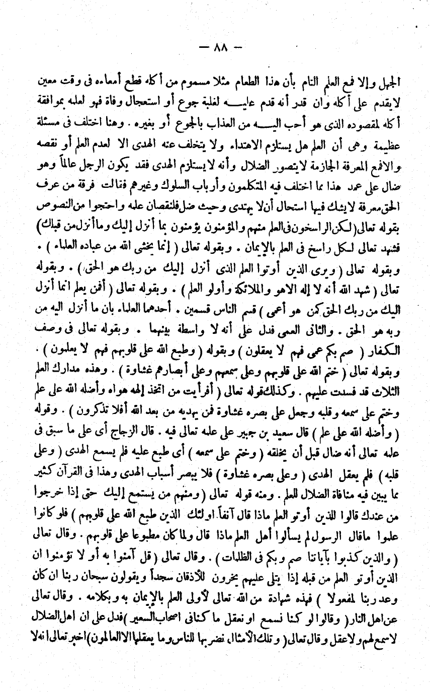 الْجَهْل والا فَمَعَ الْعلم التَّام بَان هَذَا الطَّعَام مثلا مَسْمُوم من اكله قطع امعاءه فِي وَقت معِين لَا يقدم على اكله وان قدر انه قدم عَلَيْهِ لغَلَبَة جوع اَوْ استعجال وَفَاة فَهُوَ لعلمه بموافقة اكله لمقصوده الَّذِي هُوَ احب اليه من الْعَذَاب بِالْجُوعِ اَوْ بِغَيْرِهِ وَهنا اخْتلف فِي مسئلة عَظِيمَة وَهِي ان الْعلم هَل يسْتَلْزم الاهتداء وَلَا يتَخَلَّف عَنهُ الْهدى إِلَّا لعدم الْعلم اونقصه والا فَمَعَ الْمعرفَة الجازمة لَا يتَصَوَّر الضلال وانه لَا يسْتَلْزم الْهدى فقد يكون الرجل عَالما وَهُوَ ضال على عمد هَذَا مِمَّا اخْتلف فِيهِ المتكلمون وارباب السلوك وَغَيرهم فَقَالَت فرقة من عرف الْحق معرفَة لَا يشك فِيهَا اسْتَحَالَ ان لَا يَهْتَدِي وَحَيْثُ ضل فلنقصان علمه وَاحْتَجُّوا من النُّصُوص بقوله تَعَالَى لَكِن الراسخون فِي الْعلم مِنْهُم والمؤمنون يُؤمنُونَ بِمَا أنزل اليك وَمَا انْزِلْ من قبلك فَشهد تَعَالَى لكل راسخ فِي الْعلم بالايمان وَبِقَوْلِهِ تَعَالَى إِنَّمَا يخْشَى الله من عباده الْعلمَاء وَبِقَوْلِهِ تَعَالَى وَيرى الَّذين اوتوا الْعلم الَّذِي انْزِلْ اليك من رَبك هُوَ الْحق وَبِقَوْلِهِ تَعَالَى شهد الله انه لَا إِلَه الا هُوَ وَالْمَلَائِكَة واولو الْعلم وَبِقَوْلِهِ تَعَالَى افمن يعلم انما انْزِلْ اليك من رَبك الْحق كمن هُوَ اعمى قسم النَّاس قسمَيْنِ احدهما الْعلمَاء بَان مَا انْزِلْ اليه من ربه هوالحق وَالثَّانِي الْعَمى فَدلَّ على انه لَا وَاسِطَة بَينهمَا وَبِقَوْلِهِ تَعَالَى فِي وصف الْكفَّار صم بكم عمي فهم لَا يعْقلُونَ وَبِقَوْلِهِ وطبع الله على قُلُوبهم فهم لَا يعلمُونَ وَبِقَوْلِهِ تَعَالَى ختم الله على قُلُوبهم وعَلى سمعهم وعَلى ابصارهم غشاوة وَهَذِه مدارك الْعلم الثَّلَاث قد فَسدتْ عَلَيْهِم وَكَذَلِكَ قَوْله تَعَالَى أَفَرَأَيْت من اتخذ إلهه هَوَاهُ واضله الله على علم وَختم على سَمعه وَقَلبه وَجعل على بَصَره غشاوة فَمن يهديه من بعد الله أَفلا تذكرُونَ وَقَوله واضله الله على علم قَالَ سعيد بن جُبَير على علمه تَعَالَى فِيهِ قَالَ الزّجاج أَي على مَا سبق فِي علمه تَعَالَى انه ضال قبل ان يخلقه وَختم على سَمعه أَي طبع عَلَيْهِ فَلم يسمع الْهدى وعَلى قلبه فَلم يعقل الْهدى وعَلى بَصَره غشاوة فَلَا يبصر اسباب الْهدى وَهَذَا فِي الْقُرْآن كثير مِمَّا يبين فِيهِ مُنَافَاة الضلال للْعلم وَمِنْه قَوْله تَعَالَى وَمِنْهُم من يستمع اليك حَتَّى إِذا خَرجُوا من عنْدك قَالُوا اللَّذين اوتو الْعلم مَاذَا قَالَ آنِفا اولئك الَّذين طبع الله على قُلُوبهم فَلَو كَانُوا علمُوا مَا قَالَ الرُّسُل لم يسْأَلُوا اهل الْعلم مَاذَا قَالَ وَلما كَانَ مطبوعا على قُلُوبهم وَقَالَ تَعَالَى {وَالَّذين كذبُوا بِآيَاتِنَا صم وبكم فِي الظُّلُمَات} وَقَالَ تَعَالَى قل آمنُوا بِهِ أَولا تؤمنوا أَن الَّذين اوتو الْعلم من قبله إِذا يُتْلَى عَلَيْهِم يخرون للأذقان سجدا وَيَقُولُونَ سُبْحَانَ رَبنَا ان كَانَ وعد رَبنَا لمفعولا فَهَذِهِ شَهَادَة من الله تَعَالَى لاولى الْعلم بالايمان بِهِ وبكلامه وَقَالَ تَعَالَى عَن اهل النَّار وَقَالُوا لَو كُنَّا نسْمع اونعقل مَا كُنَّا فِي اصحاب السعير فَدلَّ على ان اهل الضلال لاسمع لَهُم وَلَا عقل وَقَالَ تَعَالَى {وَتلك الْأَمْثَال نَضْرِبهَا للنَّاس وَمَا يَعْقِلهَا إِلَّا الْعَالمُونَ} اخبر تَعَالَى أَنه لَا