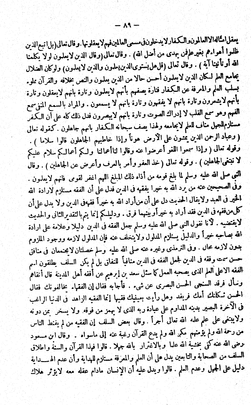 خصلتان لَا يَجْتَمِعَانِ فِي مُنَافِق حسن سمت وَفقه فِي الدّين فَجعل الْفِقْه فِي الدّين منافيا للنفاق بل لم يكن السّلف يطلقون اسْم الْفِقْه الاعلى الْعلم الَّذِي يَصْحَبهُ الْعَمَل كَمَا سُئِلَ سعد بن إِبْرَاهِيم عَن افقه اهل الْمَدِينَة قَالَ اتقاهم وسال فرقد السنجي الْحسن الْبَصْرِيّ عَن شَيْء فاجابه فَقَالَ إِن الْفُقَهَاء يخالفونك فَقَالَ الْحسن ثكلتك امك فريقد وَهل رَأَيْت بِعَيْنَيْك فَقِيها إِنَّمَا الْفَقِيه الزَّاهِد فِي الدُّنْيَا الرَّاغِب فِي الاخرة البصيربدينه المداوم على عبَادَة ربه الَّذِي لَا يهمز من فَوْقه وَلَا يسخر بِمن دونه وَلَا يبتغى على علم علمه الله تَعَالَى اجرا وَقَالَ بعض السّلف ان الْفَقِيه من لم يقنط النَّاس من رَحْمَة الله وَلم يؤمنهم مكر الله وَلم يدع الْقُرْآن رَغْبَة عَنهُ إِلَى ماسواه وَقَالَ ابْن مَسْعُود رضى الله عَنهُ كفى بخشية الله علما وبالاغترار بِاللَّه جهلا قَالُوا فَهَذَا الْقُرْآن وَالسّنة واطلاق السّلف من الصَّحَابَة وَالتَّابِعِينَ يدل على ان الْعلم والمعرفة مُسْتَلْزم للهداية وان عدم الْهِدَايَة دَلِيل على الْجَهْل وَعدم الْعلم قَالُوا وَيدل عَلَيْهِ ان الانسان مَا دَامَ عقله مَعَه لَا يُؤثر هَلَاك