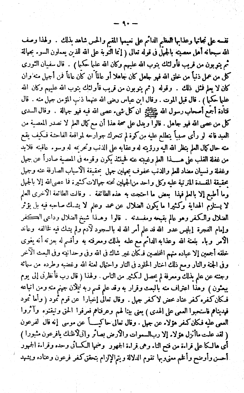 نَفسه على نجاتها وعذابها الْعَظِيم الدَّائِم على نعيمها الْمُقِيم وَالْحسن شَاهد بذلك وَلِهَذَا وصف الله سُبْحَانَهُ اهل مَعْصِيَته بِالْجَهْلِ فِي قَوْله تَعَالَى إِنَّمَا التَّوْبَة على الله للَّذين يعْملُونَ السوء بِجَهَالَة ثمَّ يتوبون من قريب فاولئك يَتُوب الله عَلَيْهِم وَكَانَ الله عليما حكيما قَالَ سُفْيَان الثَّوْريّ كل من عمل ذَنبا من خلق الله فَهُوَ جَاهِل كَانَ جَاهِلا اوعالما ان كَانَ عَالما فَمن اجهل مِنْهُ وان كَانَ لَا يعلم فَمثل ذَلِك وَقَوله ثمَّ يتوبون من قريب فَأُولَئِك يَتُوب الله عَلَيْهِم وَكَانَ الله عليما حكيما قَالَ قبل الْمَوْت وَقَالَ ابْن عَبَّاس رضى الله عَنْهُمَا ذَنْب الْمُؤمن جهل مِنْهُ قَالَ فتادة اجْمَعْ اصحاب رَسُول الله ان كل شَيْء عصى الله فِيهِ فَهُوَ جَهَالَة وَقَالَ السدى كل من عصى الله فَهُوَ جَاهِل قَالُوا وَيدل على صِحَة هَذَا ان مَعَ كَمَال الْعلم لاتصدر الْمعْصِيَة من العَبْد فَإِنَّهُ لَو رأى صَبيا يتطلع عَلَيْهِ من كوَّة لم تتحرك جوارحه لمواقعة الْفَاحِشَة فَكيف يَقع مِنْهُ حَال كَمَال الْعلم بِنَظَر الله اليه ورؤيته لَهُ وعقابه على الذَّنب وتحريمه لَهُ وَسُوء عاقبته فَلَا بُد من غَفلَة الْقلب على هَذَا الْعلم وغيبته عَنهُ فَحِينَئِذٍ يكون وَقَومه فِي الْمعْصِيَة صادرا عَن جهل وغفلة ونسيان مضاد للْعلم والذنب محفوف بجهلين جهل بِحَقِيقَة الاسباب الصارفة عَنهُ وَجَهل بِحَقِيقَة الْمفْسدَة المترتبة عَلَيْهِ وكل وَاحِد من الجهلين تَحْتَهُ جهالات كَثِيرَة فَمَا عصى الله إِلَّا بِالْجَهْلِ وَمَا اطيع الا بِالْعلمِ فَهَذَا بعض مَا احتجت بِهِ هَذِه الطَّائِفَة وَقَالَت الطَّائِفَة الاخرى الْعلم لَا يسْتَلْزم الْهِدَايَة وَكَثِيرًا مَا يكون الضلال عَن عمد وَعلم لَا يشك صَاحبه فِيهِ بل يُؤثر الضلال وَالْكفْر وَهُوَ عَالم بقبحه ومفسدته قَالُوا وَهَذَا شيخ الضلال وداعي الْكفْر وَإِمَام الفجرة إِبْلِيس عَدو الله قد علم امْر الله لَهُ بِالسُّجُود لادم وَلم يشك فِيهِ فخالفه وعاند الامر وباء بلعنة الله وعذابه الدَّائِم مَعَ علمه بذلك ومعرفته بِهِ واقسم لَهُ بعزته انه يغوى خلقه اجمعين الاعباده مِنْهُم المخلصين فَكَانَ غير شَاك فِي الله وَفِي وحدانيته وَفِي الْبَعْث الآخر وَفِي الْجنَّة وَالنَّار وَمَعَ ذَلِك اخْتَار الخلود فِي النَّار وَاحْتِمَال لعنة الله وغضبه وطرده من سمائه وجنته عَن علم بذلك وَمَعْرِفَة لم يحصل لكثير من النَّاس وَلِهَذَا قَالَ رب فأنظرني الى يَوْم يبعثون وَهَذَا اعْتِرَاف مِنْهُ بِالْبَعْثِ وقرار بِهِ وَقد علم قسم ربه ليملأن جَهَنَّم مِنْهُ وَمن اتِّبَاعه فَكَانَ كفره كفر عناد مَحْض لَا كفر جهل وَقَالَ تَعَالَى إِخْبَارًا عَن قوم ثَمُود وَأما ثَمُود فهدينهم فاستحبوا الْعَمى على الْهدى يَعْنِي بَينا لَهُم وعرفناهم فعرفوا الْحق وتيقنوه وآثروا الْعَمى عَلَيْهِ فَكَانَ كفر هَؤُلَاءِ عَن جهل وَقَالَ تَعَالَى حاكيا عَن مُوسَى إِنَّه قَالَ لفرعون لقد علمت مَا انْزِلْ هَؤُلَاءِ الا رب السَّمَوَات والارض بصائر وَإِنِّي لاظنك يَا فِرْعَوْن مثبورا أَي هَالكا على قِرَاءَة من فتح التَّاء وَهِي قِرَاءَة الْجُمْهُور وَضمّهَا الْكسَائي وَحده وَقِرَاءَة الْجُمْهُور احسن واوضح وافخم معنى وَبهَا تقوم الدّلَالَة وَيتم الالزام بتحقق كفر فِرْعَوْن وعناده وَيشْهد
